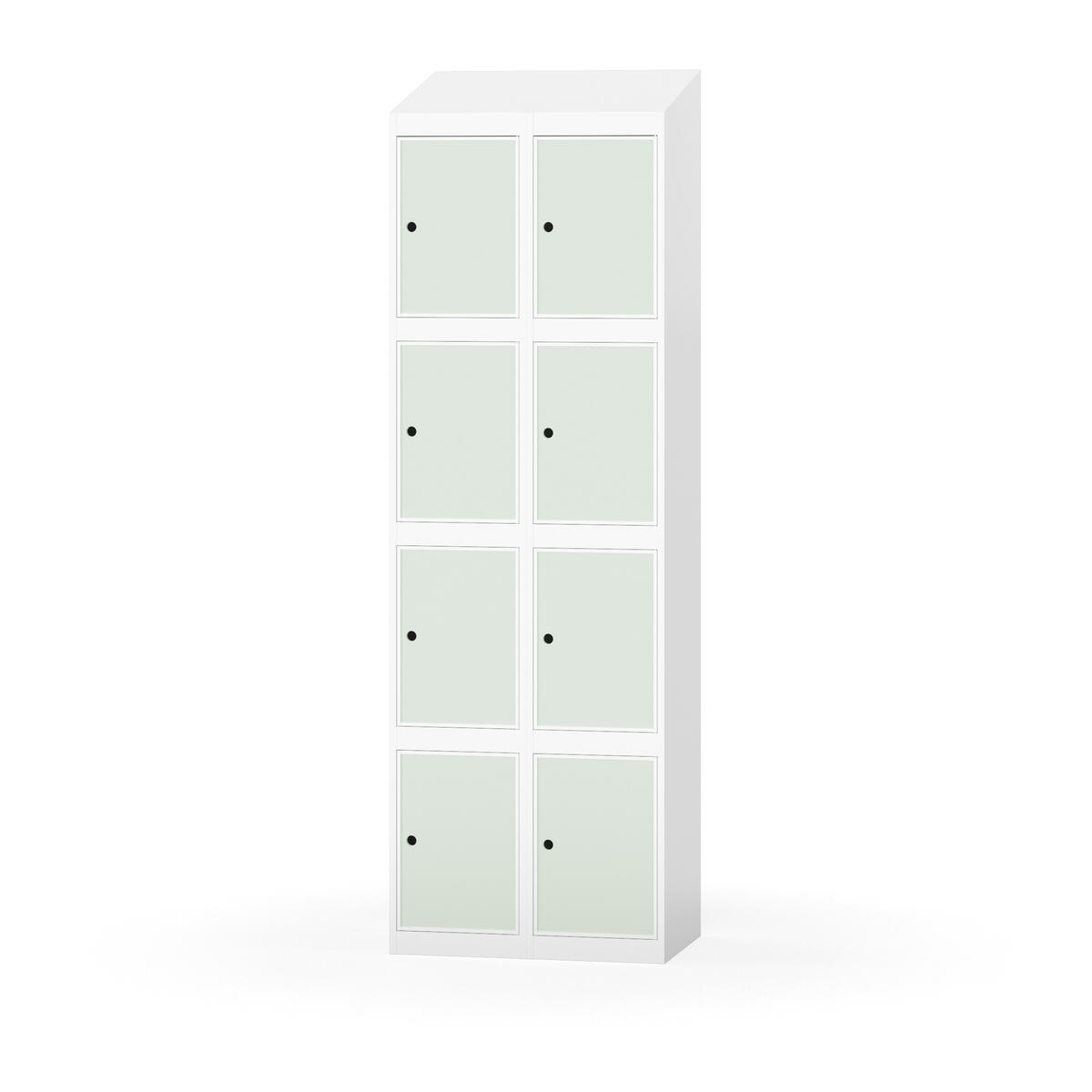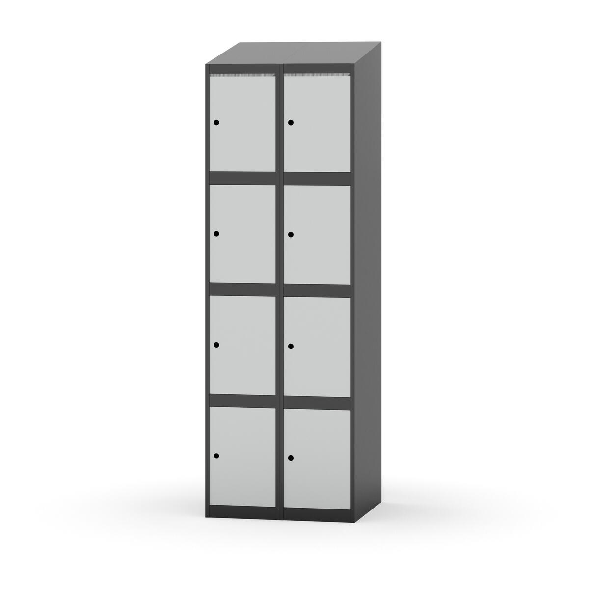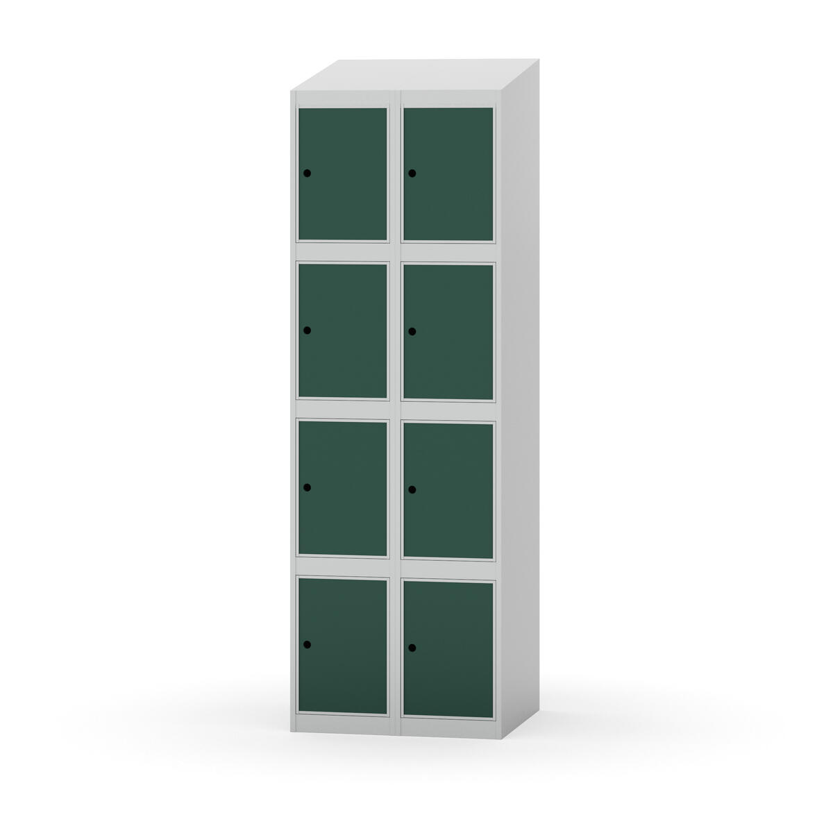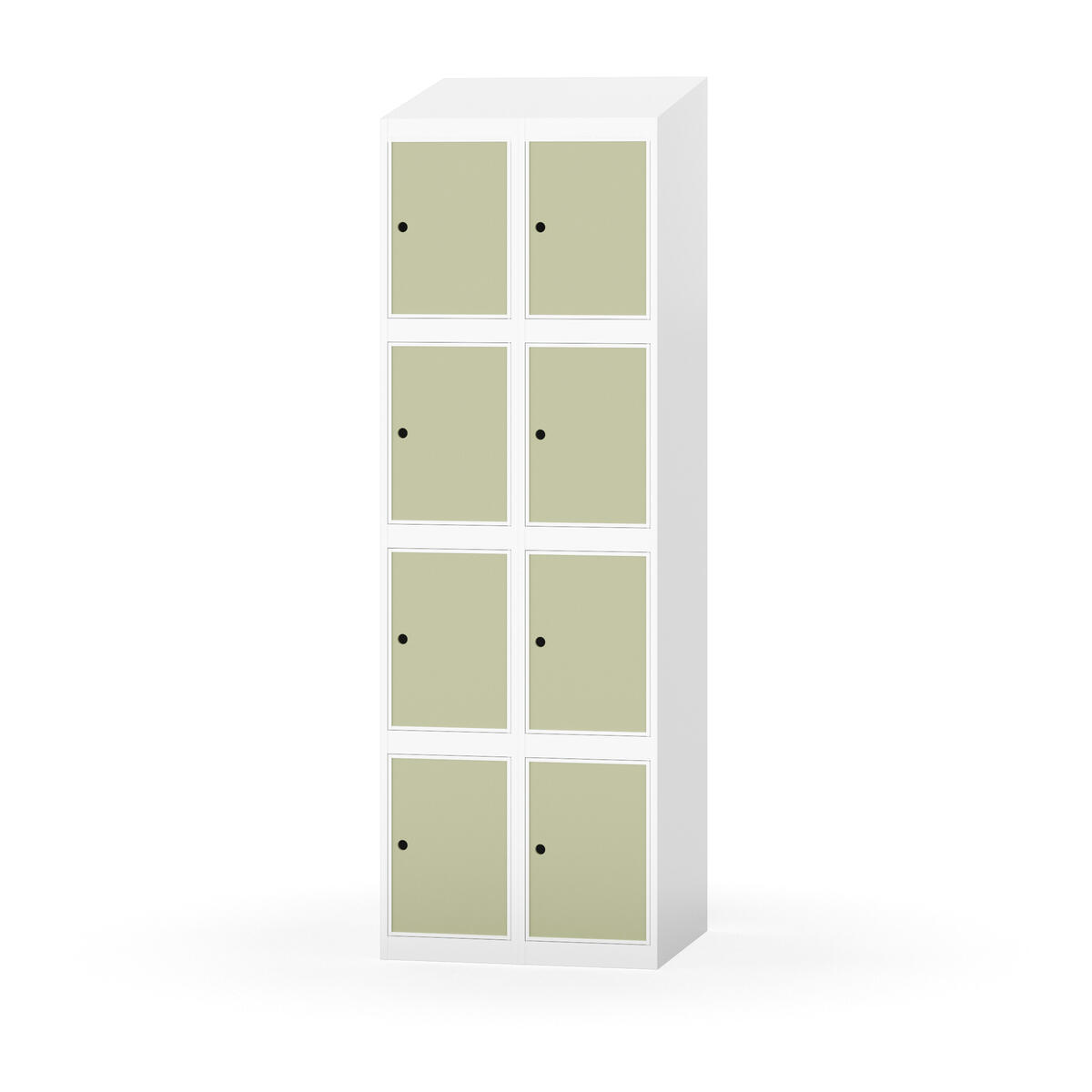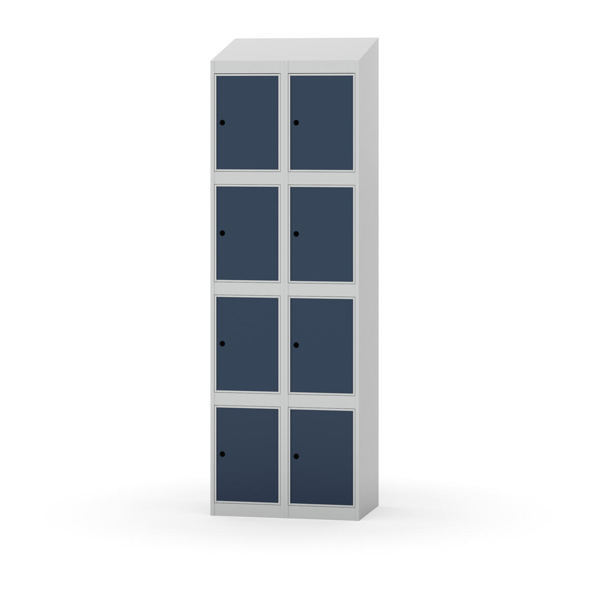 Boxskåp med helsvetsad stomme. Välj mellan plåt eller laminatdörr. Plåtdörren är försedd med dörrstopp i stål och infälld förstärkning kring låshålet. Laminatdörr infälld i stålram försedd med dörrstopp i stål. Dörrar är öppningsbara 90 grader. Inredning: Ingen. Slät golvyta utan tröskel. Ventilation genom hål i tak-/bottenplåt. Observera att lås och underrede beställs på separata artikelnummer. Lås kommer att vara monterade på skåp vid leverans. Valt underrede monteras på plats.