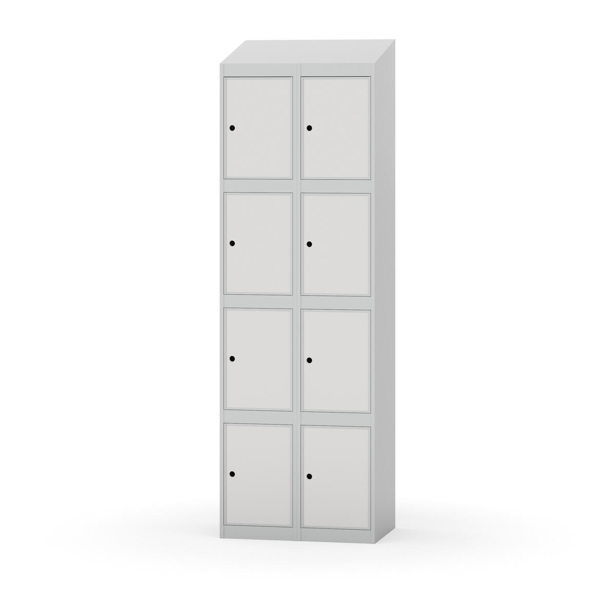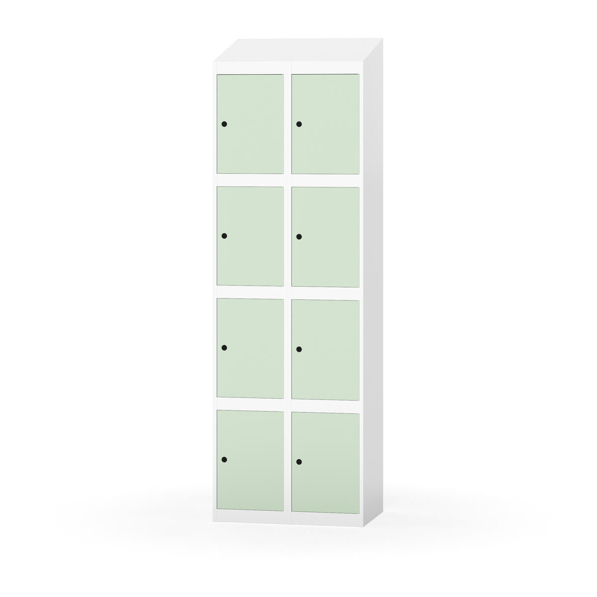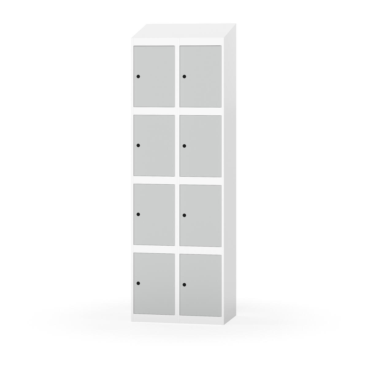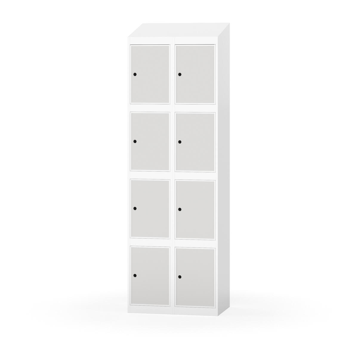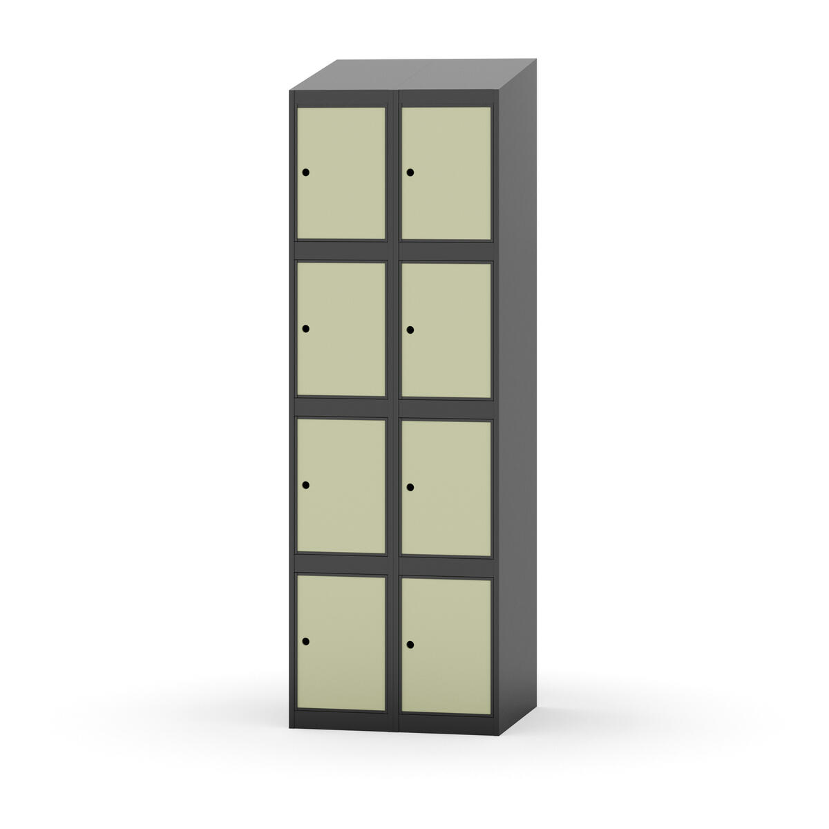 Boxskåp med helsvetsad stomme. Välj mellan plåt eller laminatdörr. Plåtdörren är försedd med dörrstopp i stål och infälld förstärkning kring låshålet. Laminatdörr infälld i stålram försedd med dörrstopp i stål. Dörrar är öppningsbara 90 grader. Inredning: Ingen. Slät golvyta utan tröskel. Ventilation genom hål i tak-/bottenplåt. Observera att lås och underrede beställs på separata artikelnummer. Lås kommer att vara monterade på skåp vid leverans. Valt underrede monteras på plats.