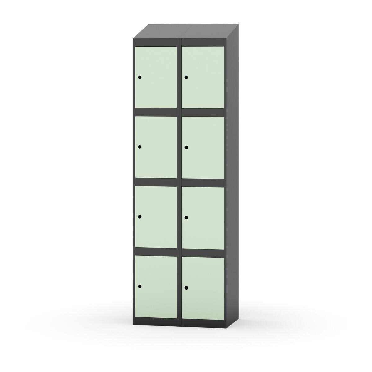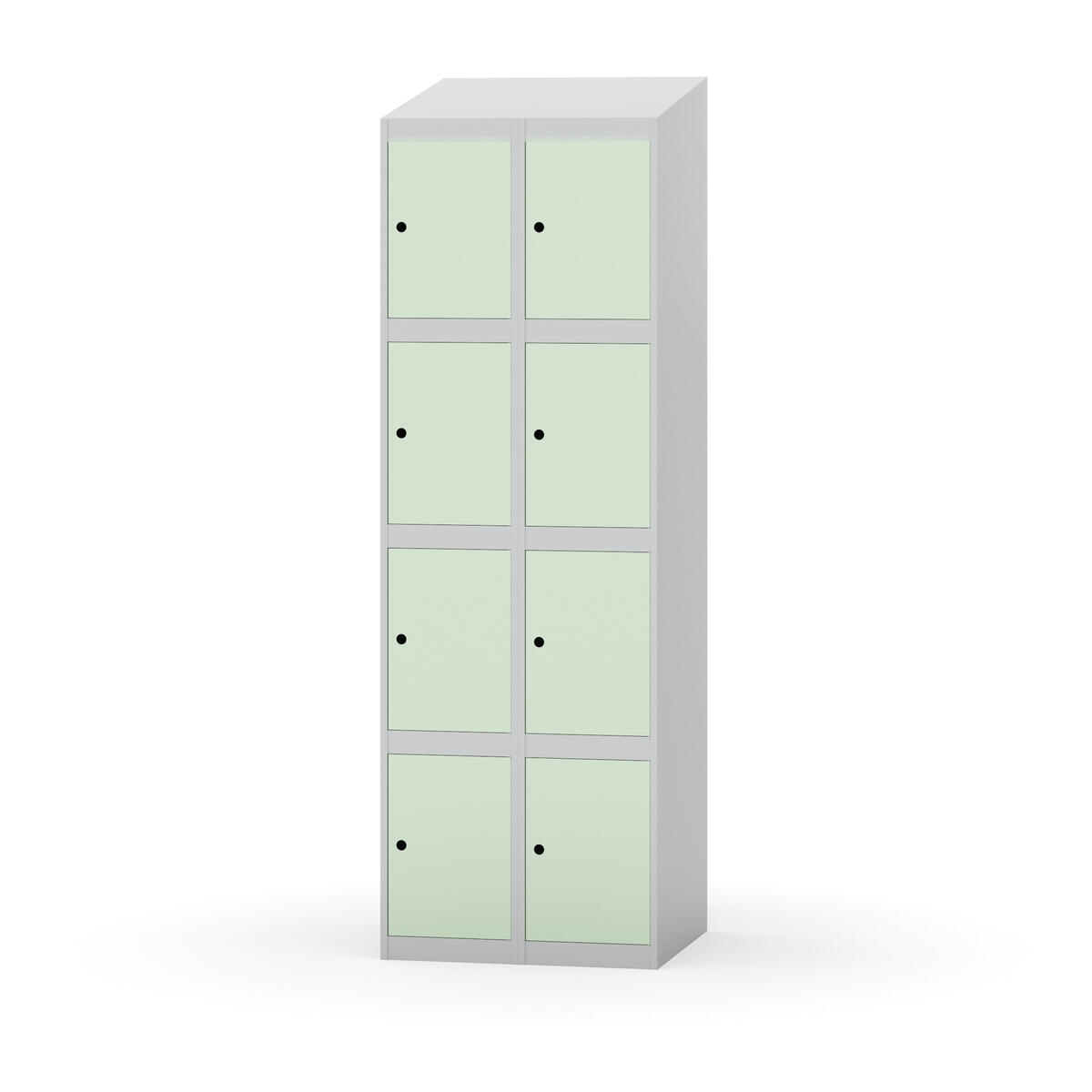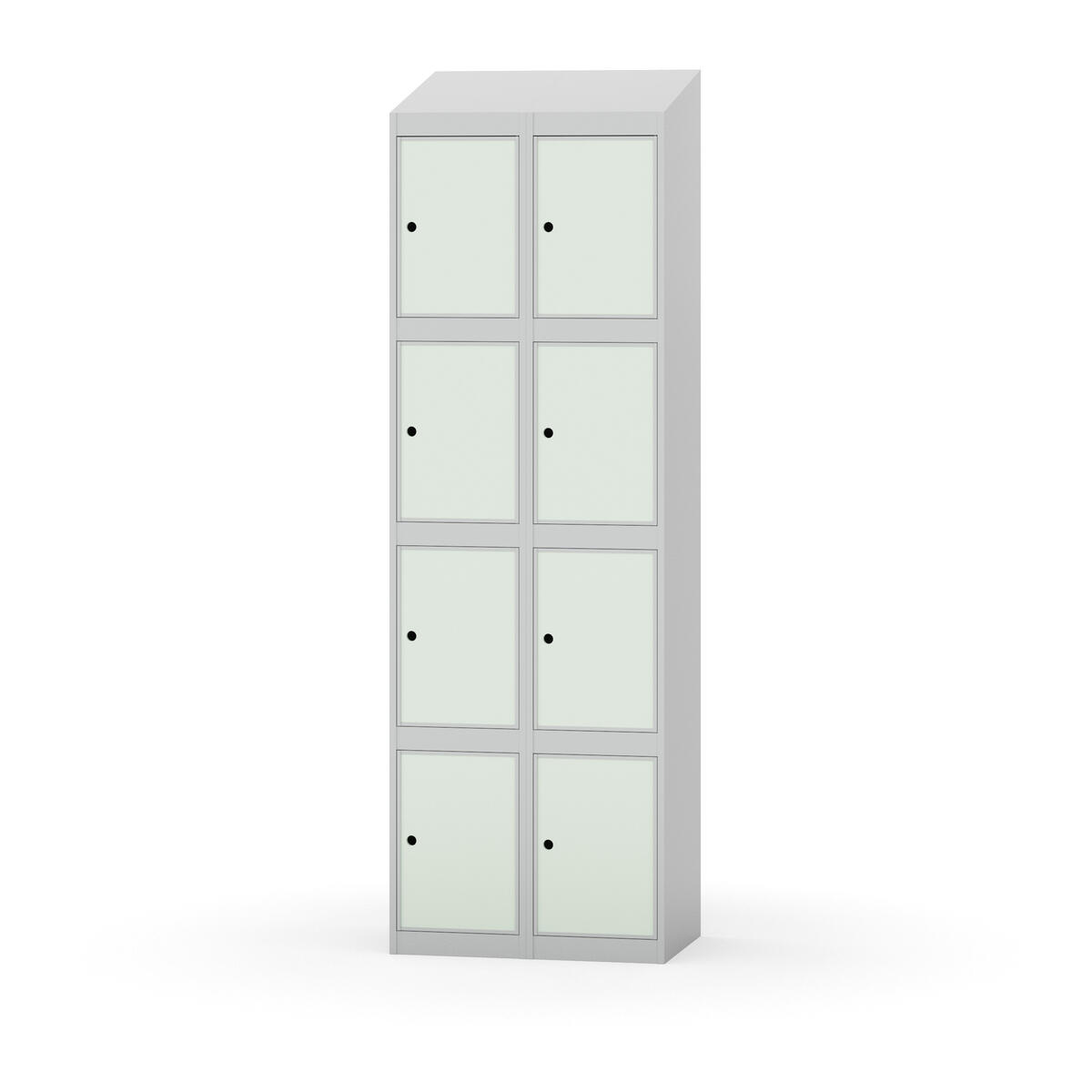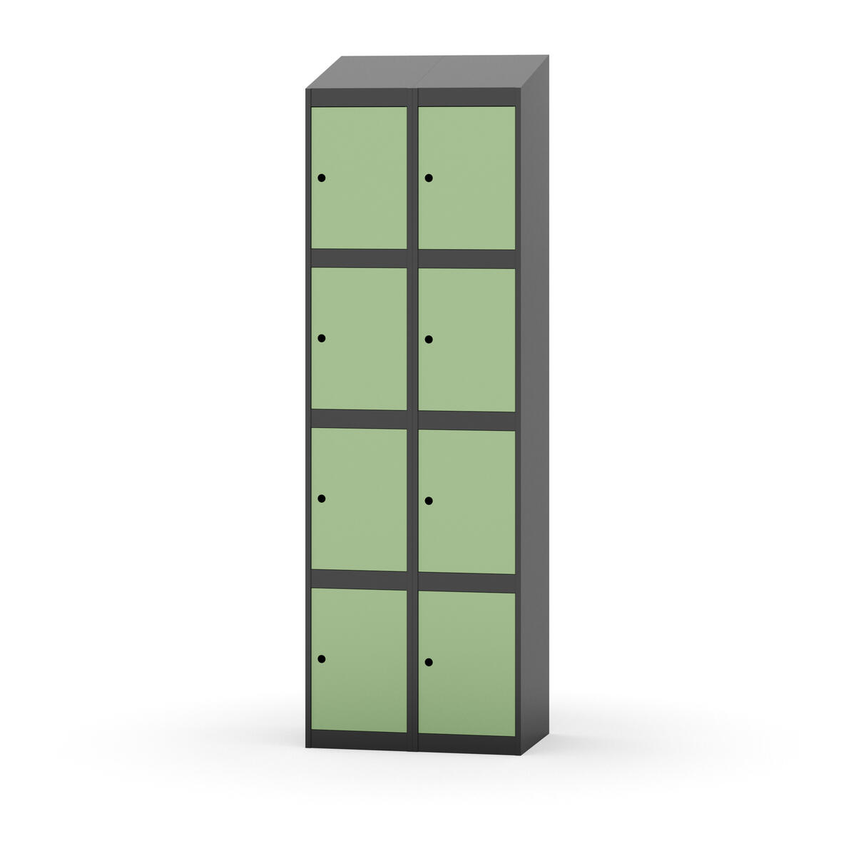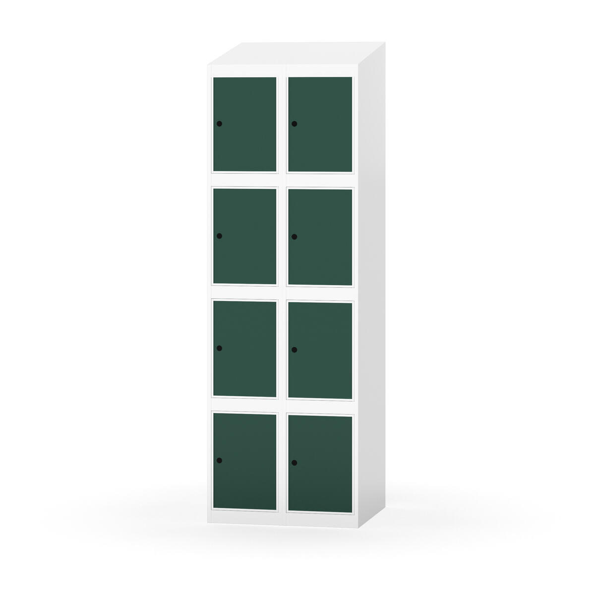 Boxskåp med helsvetsad stomme. Välj mellan plåt eller laminatdörr. Plåtdörren är försedd med dörrstopp i stål och infälld förstärkning kring låshålet. Laminatdörr infälld i stålram försedd med dörrstopp i stål. Dörrar är öppningsbara 90 grader. Inredning: Ingen. Slät golvyta utan tröskel. Ventilation genom hål i tak-/bottenplåt. Observera att lås och underrede beställs på separata artikelnummer. Lås kommer att vara monterade på skåp vid leverans. Valt underrede monteras på plats.