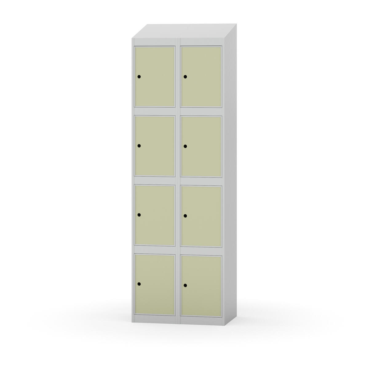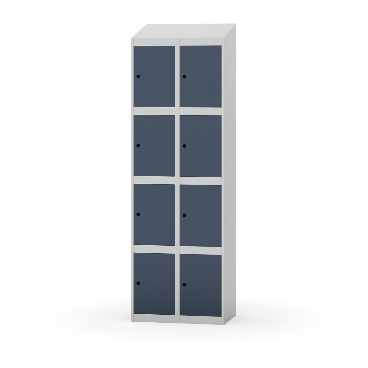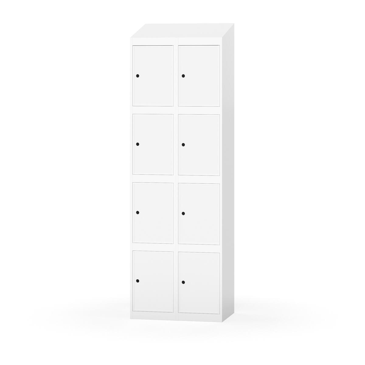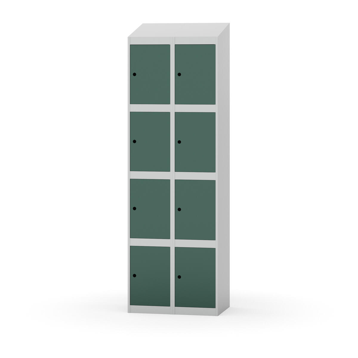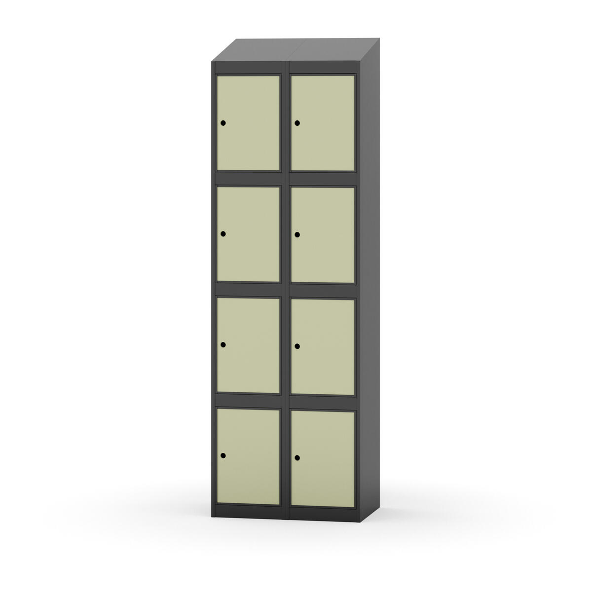 Boxskåp med helsvetsad stomme. Välj mellan plåt eller laminatdörr. Plåtdörren är försedd med dörrstopp i stål och infälld förstärkning kring låshålet. Laminatdörr infälld i stålram försedd med dörrstopp i stål. Dörrar är öppningsbara 90 grader. Inredning: Ingen. Slät golvyta utan tröskel. Ventilation genom hål i tak-/bottenplåt. Observera att lås och underrede beställs på separata artikelnummer. Lås kommer att vara monterade på skåp vid leverans. Valt underrede monteras på plats.
