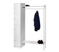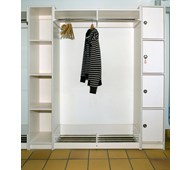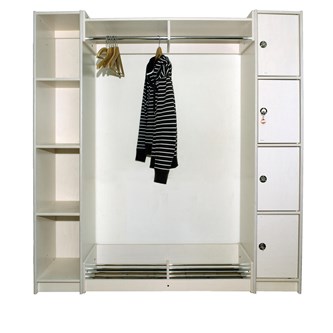 Låsbart personalskåp i vitpigmenterat björkkryssfaner. Skåpen finns med tre, fyra eller fem dörrar. Storlek: B31xD40xH183 cm. Skåpen kan kompletteras med hatt- och skohylla i önskade längder. 3 dörrar. Invändig skåpsstorlek: B27,5xD40xH32 cm.
