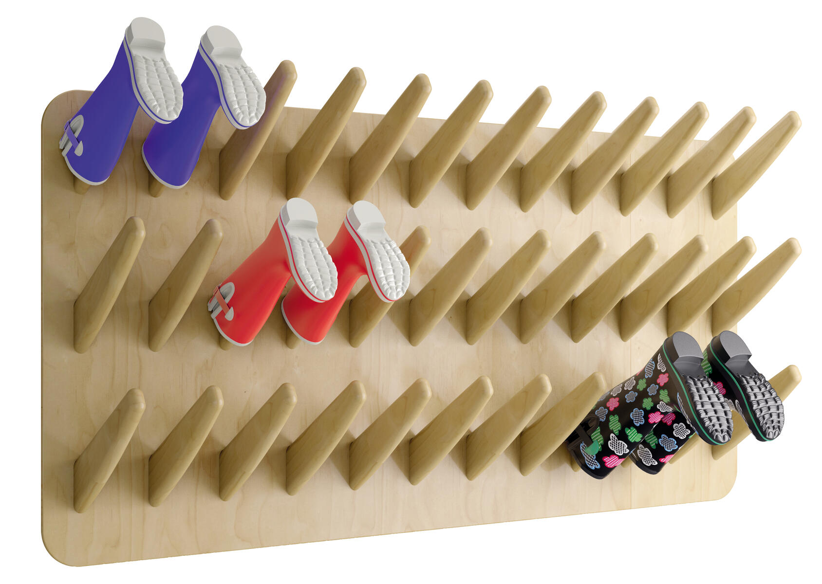Färdig stövelvägg från Wille skensystem. Kombinationen består av 2 väggskenor och 6 stövellister. Den kan enkelt kompletteras med andra komponenter ur Willesystemet. Bredd: 60 cm.