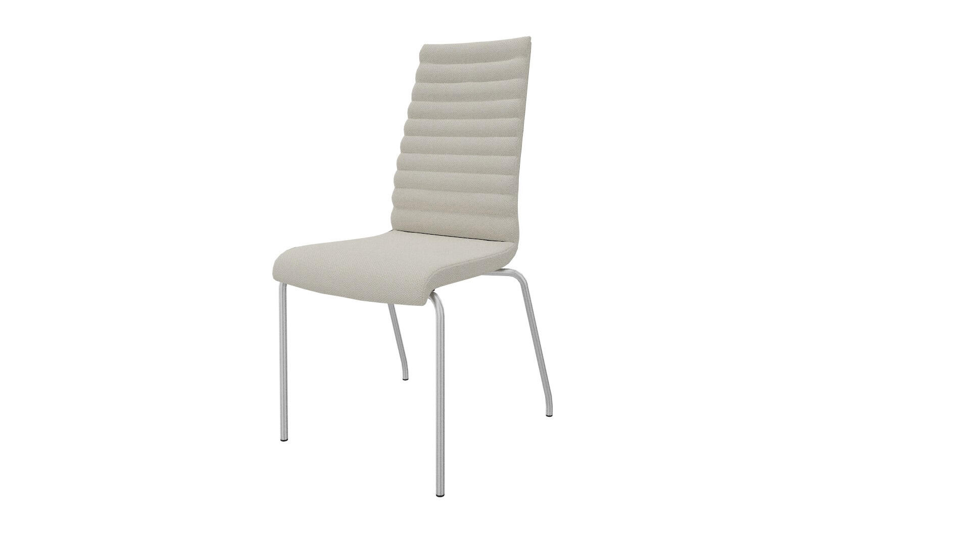 Stilren och funktionell stol med en quiltad, hög rygg och en sittdel av formpressad faner klädd med kallskum, vilket ger både komfort och stöd. Stabilt pulverlackat stativ av ø 19 mm rör med filtbelagda möbeltassar för att skydda golvet. Stolen är stapelbar, max 5 i höjd. Armstöd som tillval.