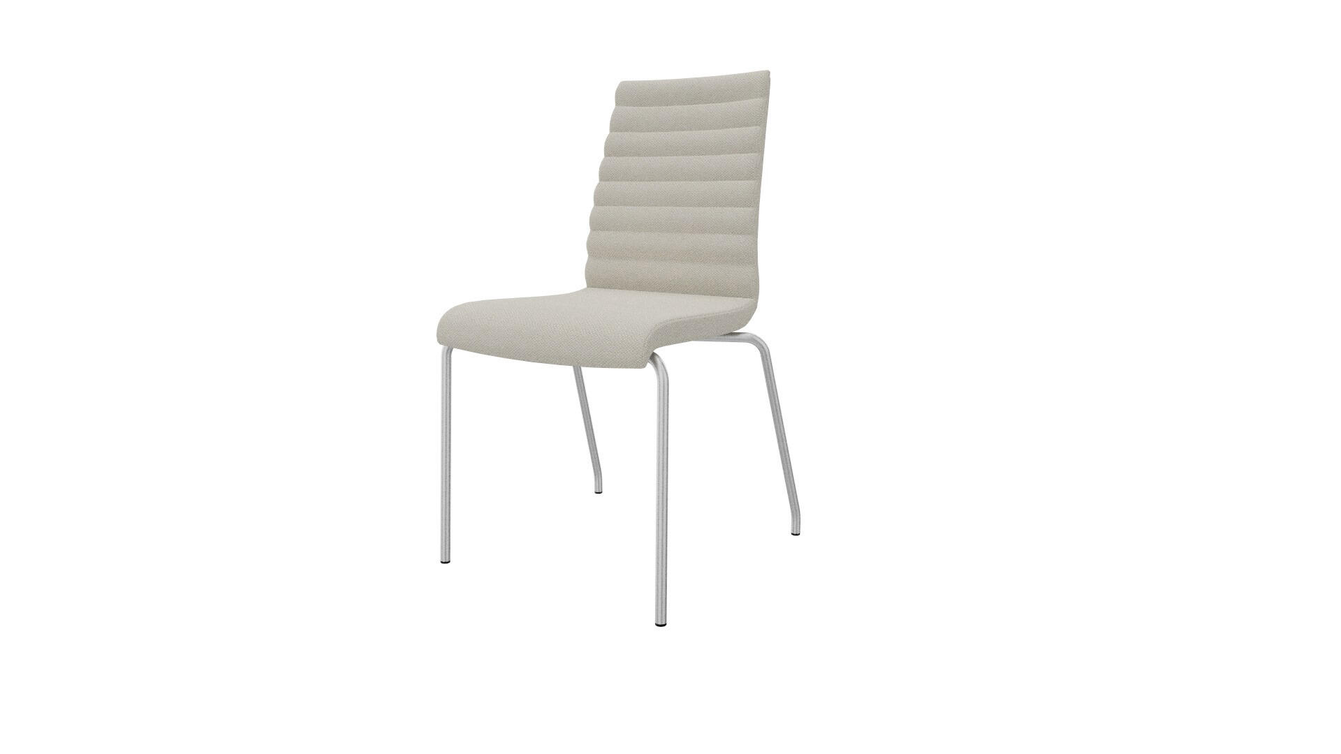 Stilren och funktionell stol med en quiltad, medelhög rygg och en sittdel av formpressad faner klädd med kallskum, vilket ger både komfort och stöd. Stabilt pulverlackat stativ av ø 19 mm rör med filtbelagda möbeltassar för att skydda golvet. Stolen är stapelbar, max 5 i höjd. Armstöd som tillval.