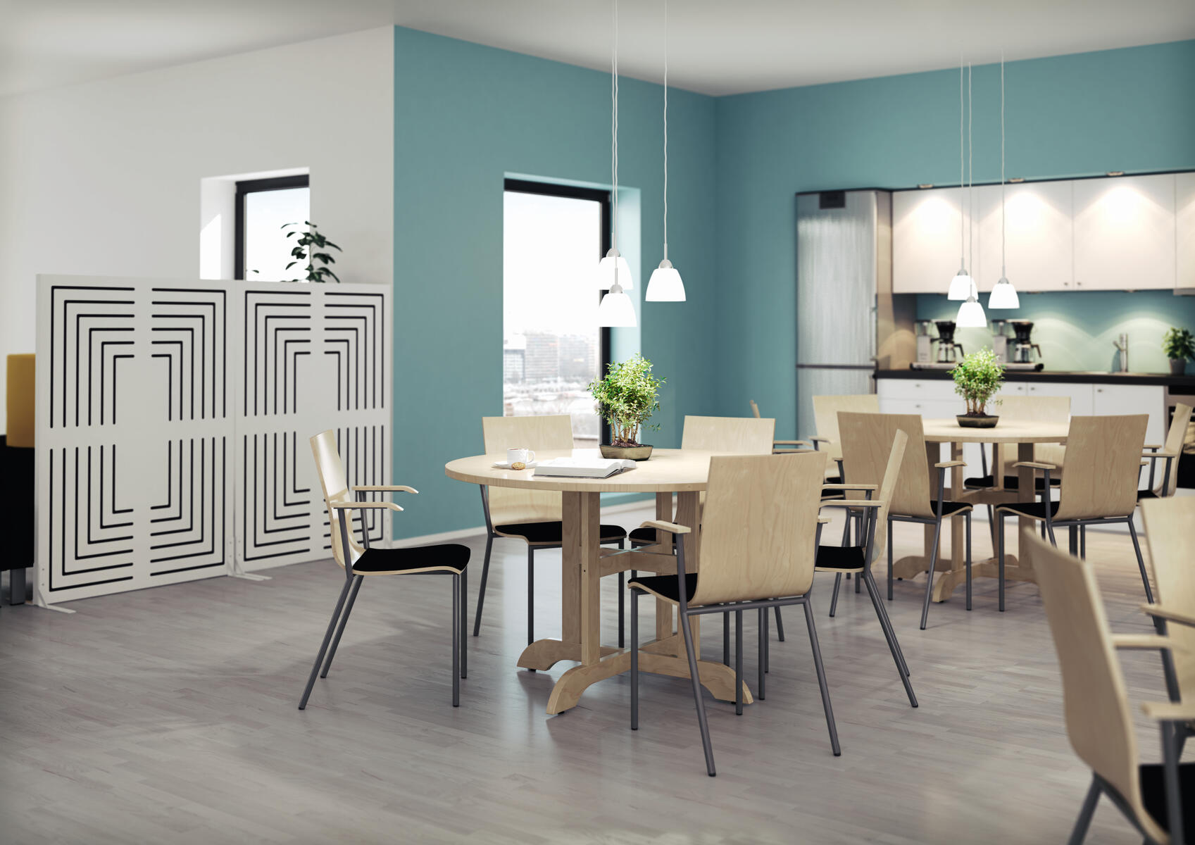 Filttass. Stapelbar. Sitthöjd: 46 cm. Sitsmått: B38,5xD40 cm. Totalmått: B44xD50xH81 cm. Vikt 7 kg. Skal i högtryckslaminat, björk. Silverlackerat stativ, RAL 9006.