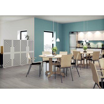 Filttass. Stapelbar. Sitthöjd 74,5 cm. Sitsmått: B38,5xD40 cm. Totalmått: B44xD47,5xH84 cm. Vikt 8,3 kg. Skal i högtryckslaminat, björk. Stativ silverlackerat, RAL 9006.