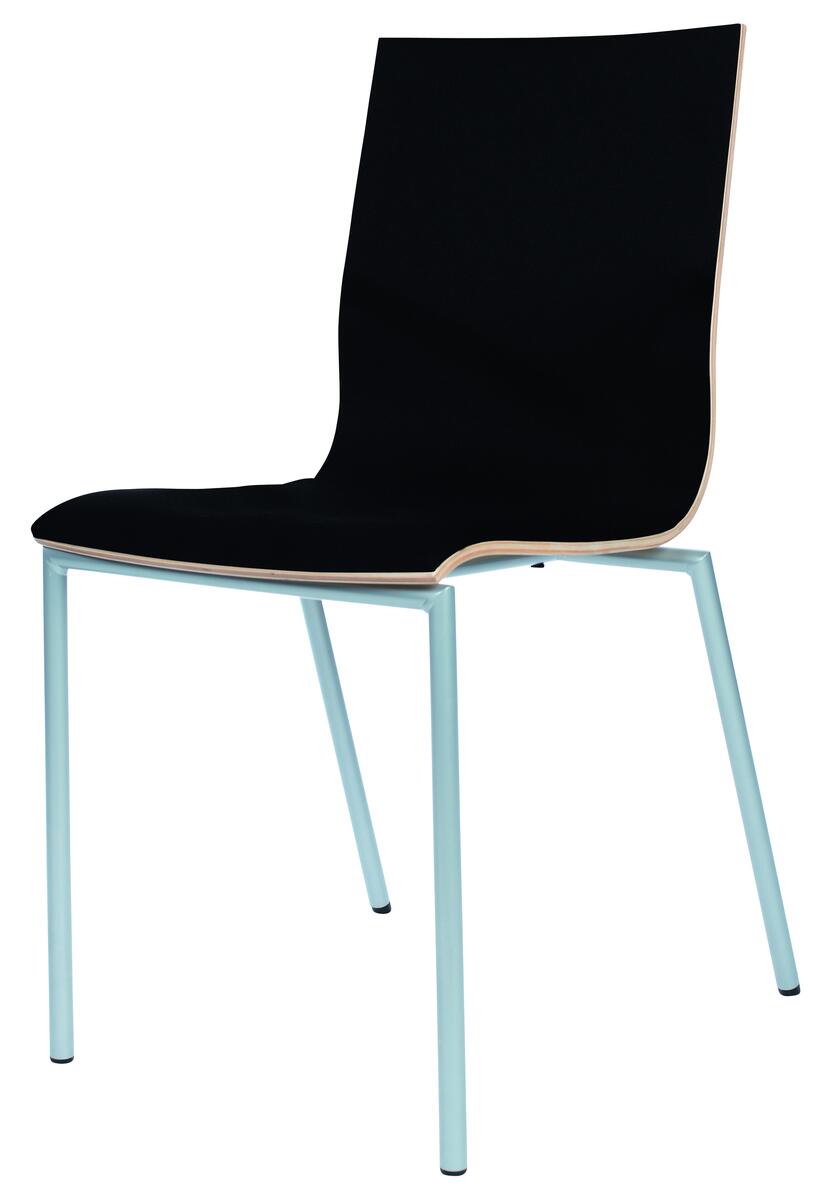 Filttass. Stapelbar. Sitthöjd 46 cm. Sitsmått: B38,5xD40 cm. Totalmått: B44xD50xH81 cm. Vikt 7 kg. Skal i högtryckslaminat, björk. Klädd sits i svart tyg Evert TKE 001. Silverlackerat stativ, RAL 9006.