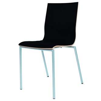 Filttass. Stapelbar. Armstöden fungerar som upphängning. Sitthöjd 46 cm. Sitsmått: B38,5xD40 cm. Totalmått: B55,5xD50xH81 cm. Höjd till armstöd 65 cm. Vikt 7,2 kg. Skal i högtryckslaminat, björk. Klädd sits i svart tyg Evert TKE 001. Silverlackerat stativ, RAL 9006.