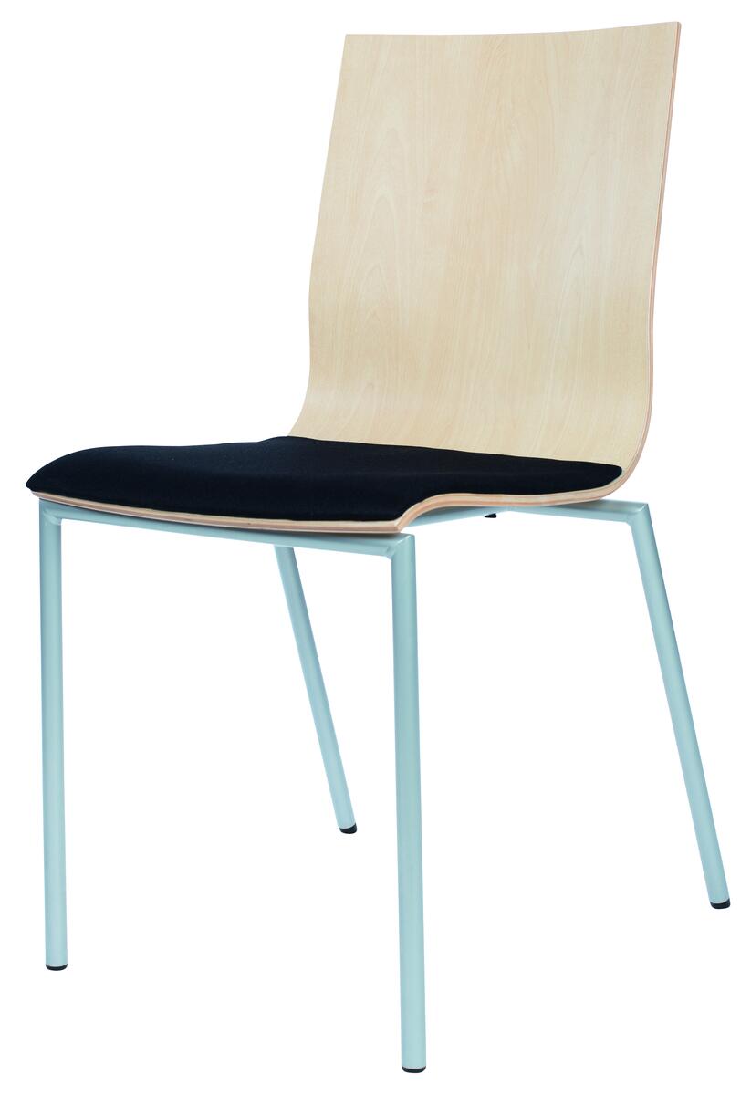 Filttass. Stapelbar. Sitthöjd: 46 cm. Sitsmått: B38,5xD40 cm. Totalmått: B44xD50xH81 cm. Vikt 7 kg. Skal i högtryckslaminat, björk. Silverlackerat stativ, RAL 9006.