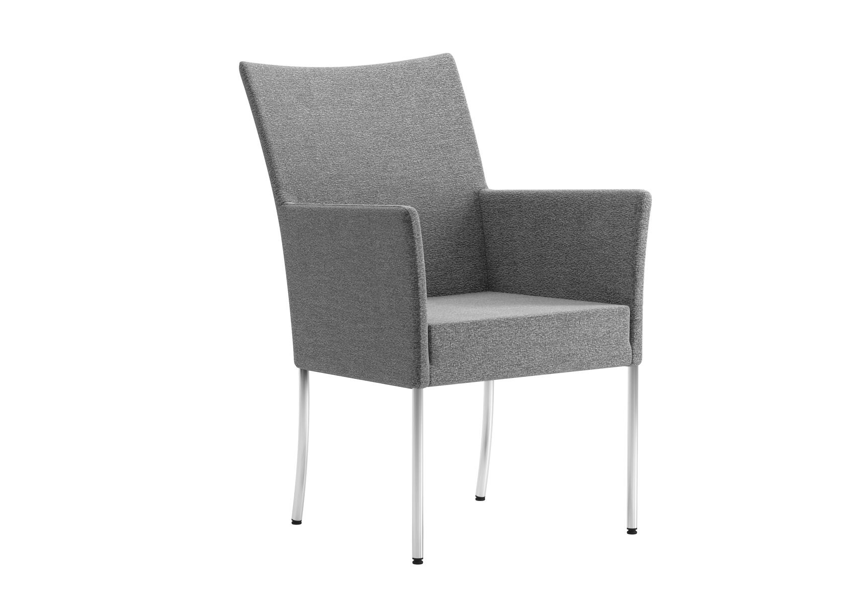 Ergonomiskt, stoppat ryggstöd stöder rygg och armar och den breda sitsen säkerställer komfort. Trästomme och stoppning i kallskum. Pulverlackat metallstativ.