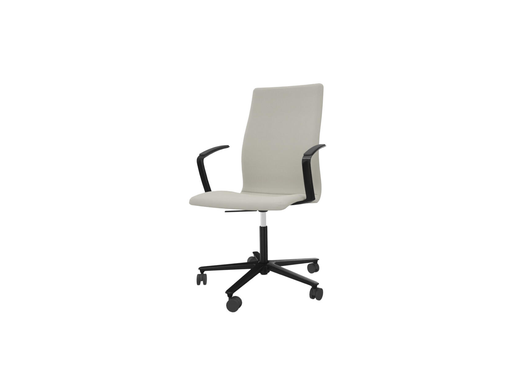 En tidlös, ergonomisk och bekväm stol med en slät, hög rygg och en sittdel av formpressad faner klädd med kallskum, vilket ger både komfort och stöd. Tiltmekanism 7° bakåt, 4° framåt. Svart metallkryss med 5 hårda hjul för mjuka golv. Armstöd som tillval.