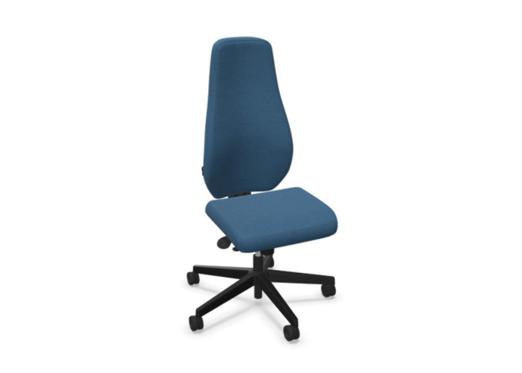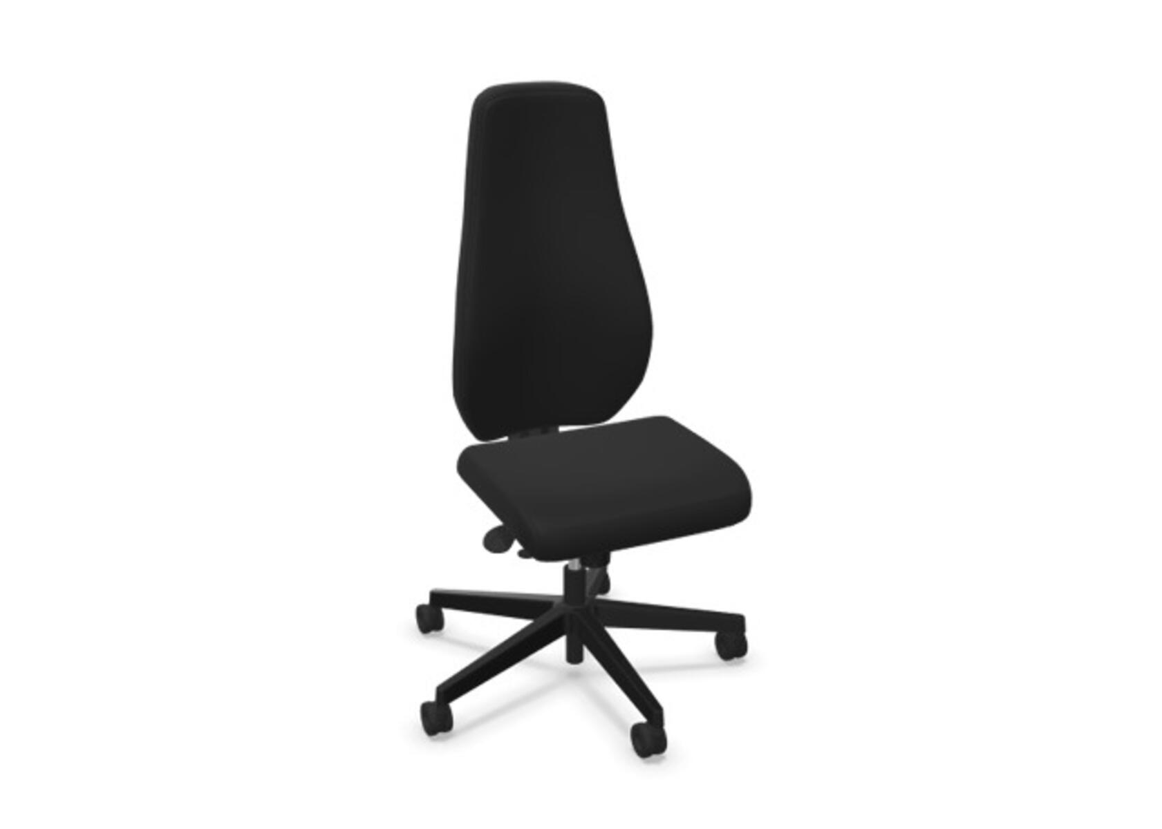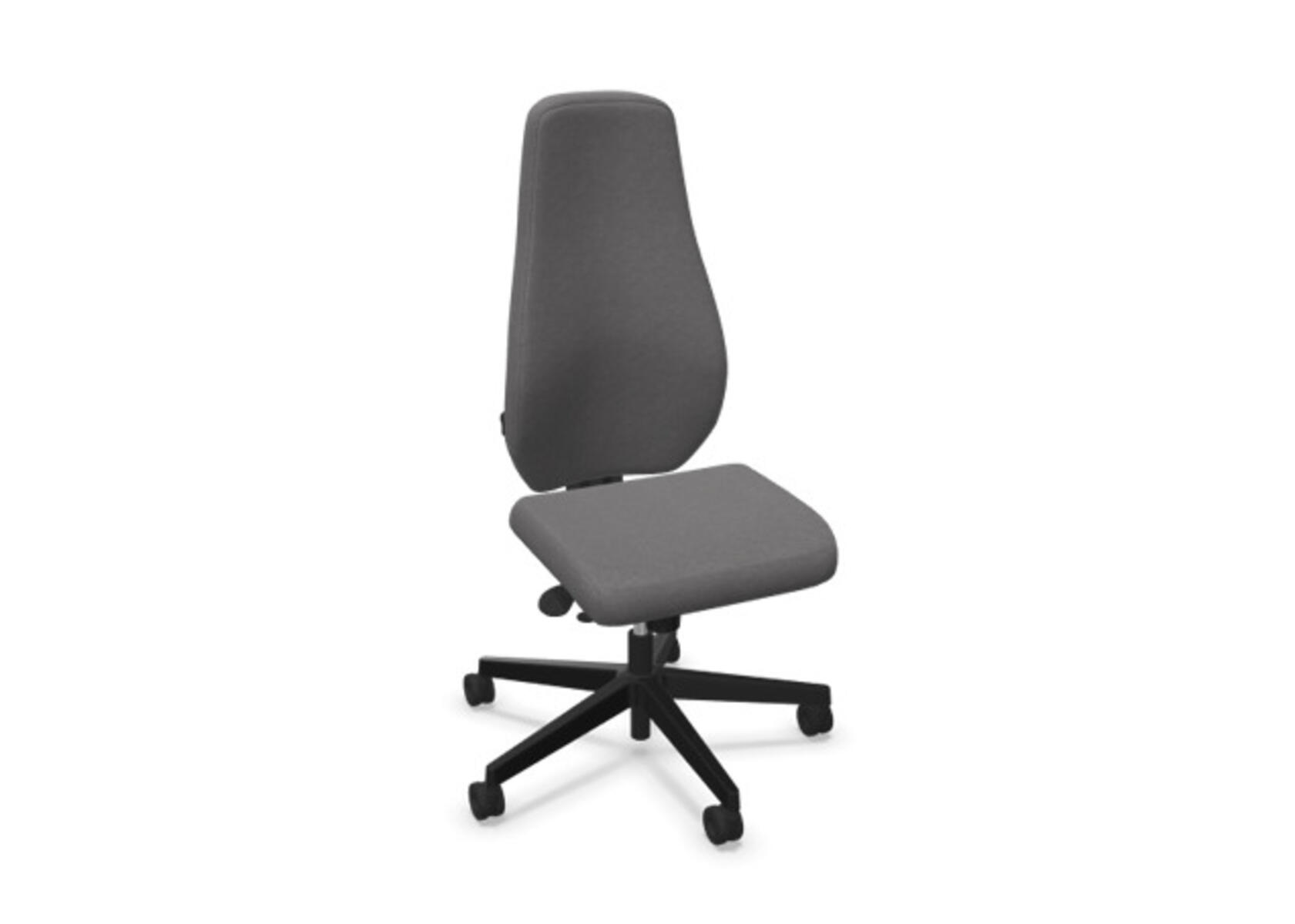 En stilren och ergonomisk kontorsstol med helklädd hög rygg och synkronmekanism, utformad för att ge stöd vid aktivt sittande under hela arbetsdagen. Den synkroniserade lutningen av ryggstöd och sits möjliggör aktiv och bekväm sittställning. Ryggstödslutningsvinkel 20° synkroniserad med sitslutningsvinkel 11°. Ryggstödet är låsbart i 5 olika lägen för individuell anpassning och du kan enkelt justera ryggstödets motstånd med ett vred. Ryggstödet är höjdjusterbart inom intervallet 70 mm med 13 låslägen. Stolen har även Anti-Shock funktion vilket förhindrar ryggstödet slår tillbaka när lutningen låses upp. Välj mellan kryss i svart polyamid eller polerad alu samt självbromsande hjul för mjuka eller hårda golv. Som tillval finns även ländryggstöd (Shukra-mekanism), manuellt justerbart i djupled (20mm) med hjälp av ett vred. Armstöd 1D, 2D, 3D alternativt 4D säljs separat.