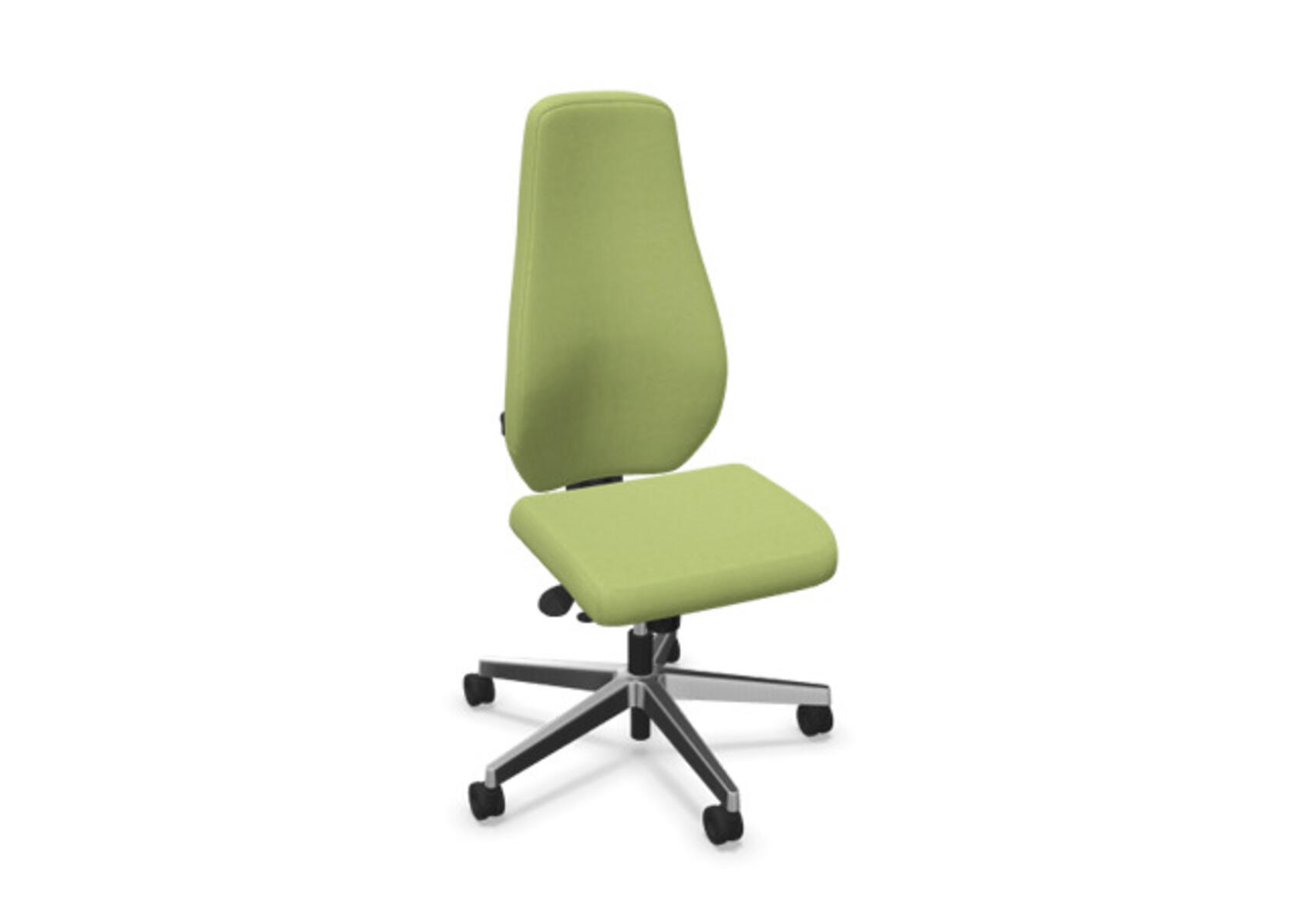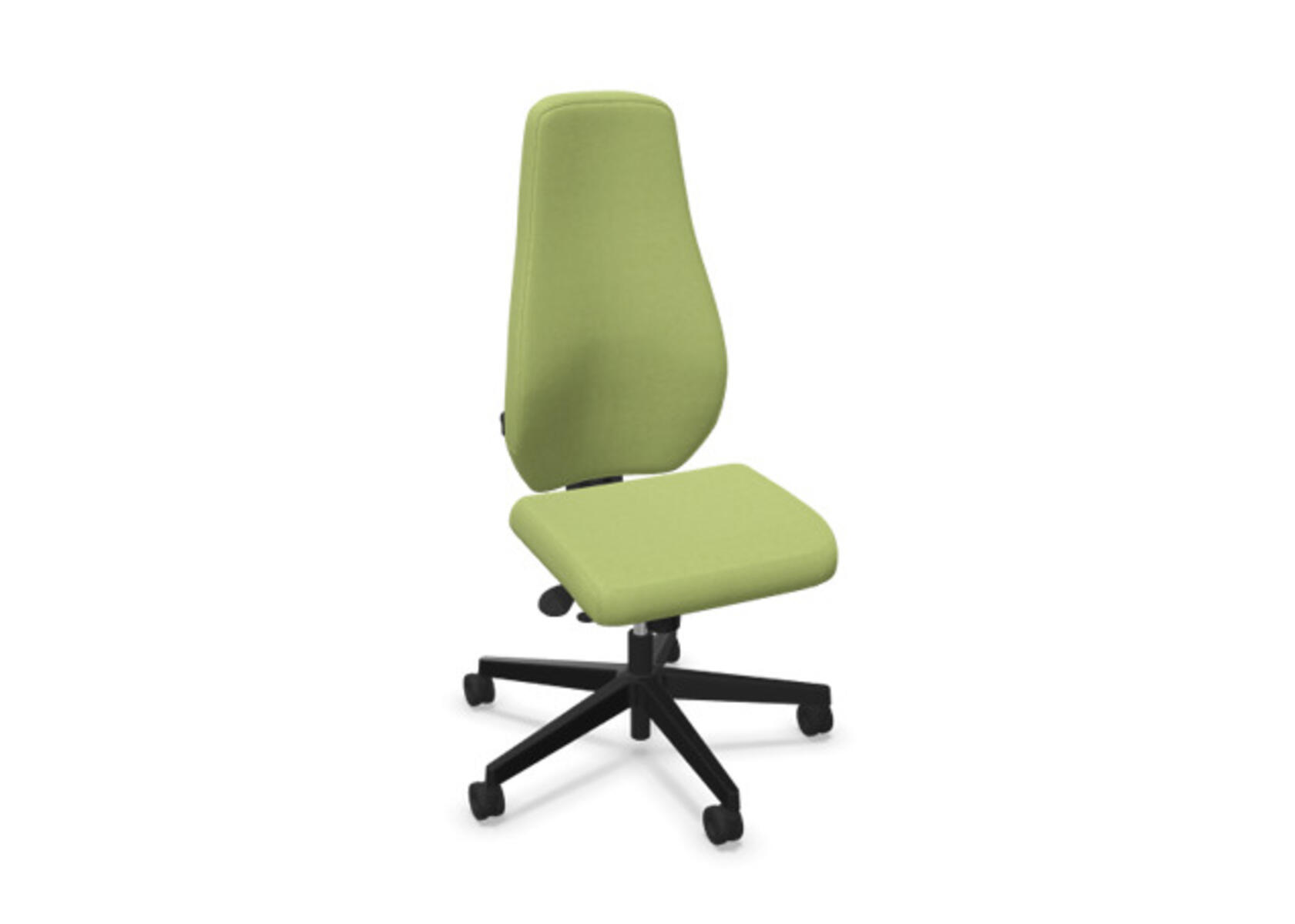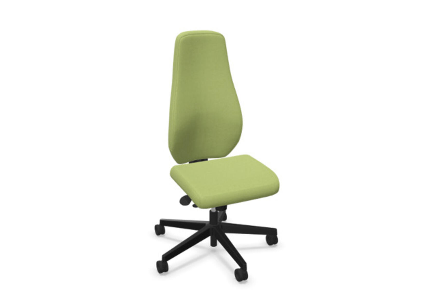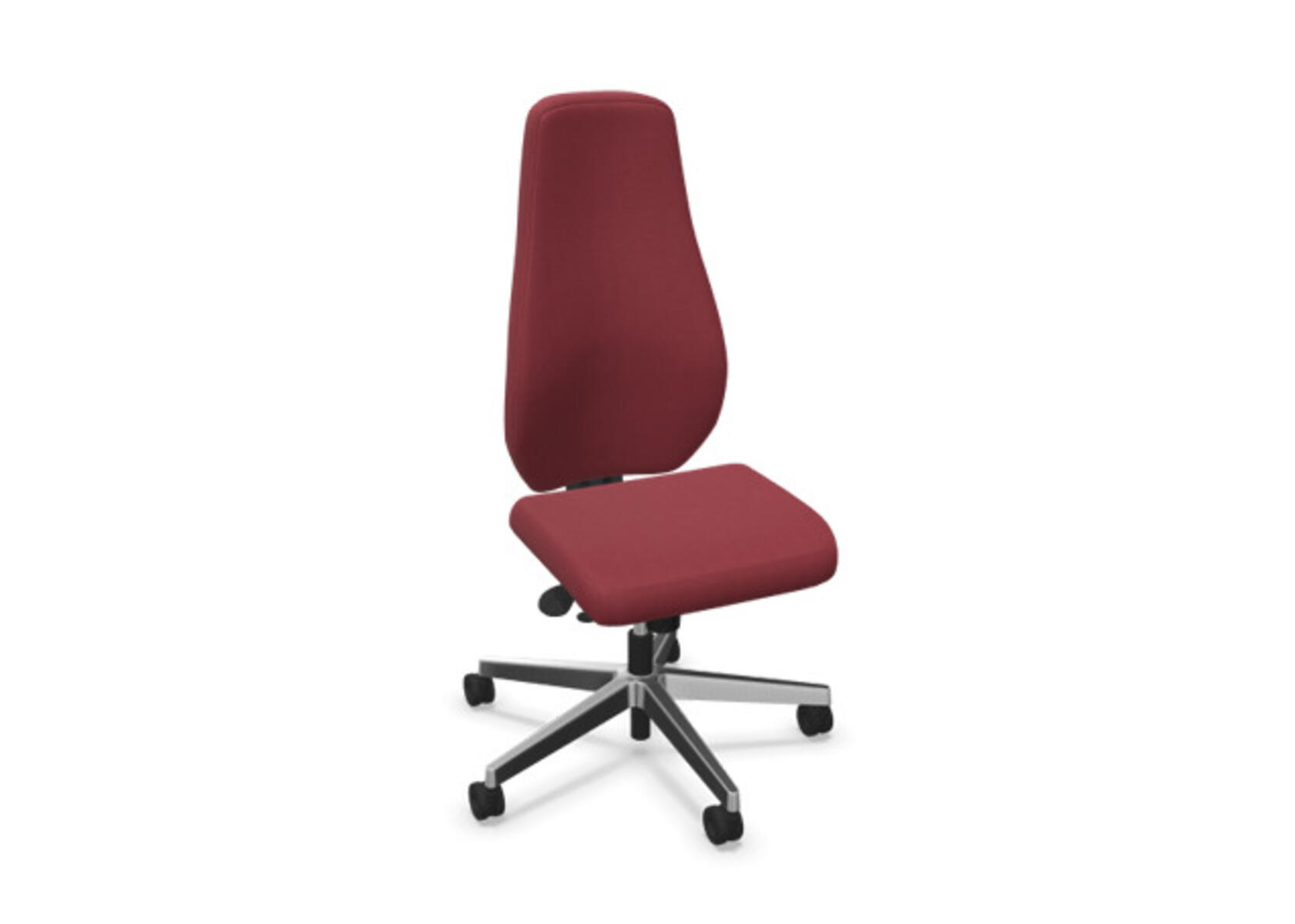 En stilren och ergonomisk kontorsstol med helklädd hög rygg och synkronmekanism, utformad för att ge stöd vid aktivt sittande under hela arbetsdagen. Den synkroniserade lutningen av ryggstöd och sits möjliggör aktiv och bekväm sittställning. Ryggstödslutningsvinkel 20° synkroniserad med sitslutningsvinkel 11°. Ryggstödet är låsbart i 5 olika lägen för individuell anpassning och du kan enkelt justera ryggstödets motstånd med ett vred. Ryggstödet är höjdjusterbart inom intervallet 70 mm med 13 låslägen. Stolen har även Anti-Shock funktion vilket förhindrar ryggstödet slår tillbaka när lutningen låses upp. Välj mellan kryss i svart polyamid eller polerad alu samt självbromsande hjul för mjuka eller hårda golv. Som tillval finns även ländryggstöd (Shukra-mekanism), manuellt justerbart i djupled (20mm) med hjälp av ett vred. Armstöd 1D, 2D, 3D alternativt 4D säljs separat.