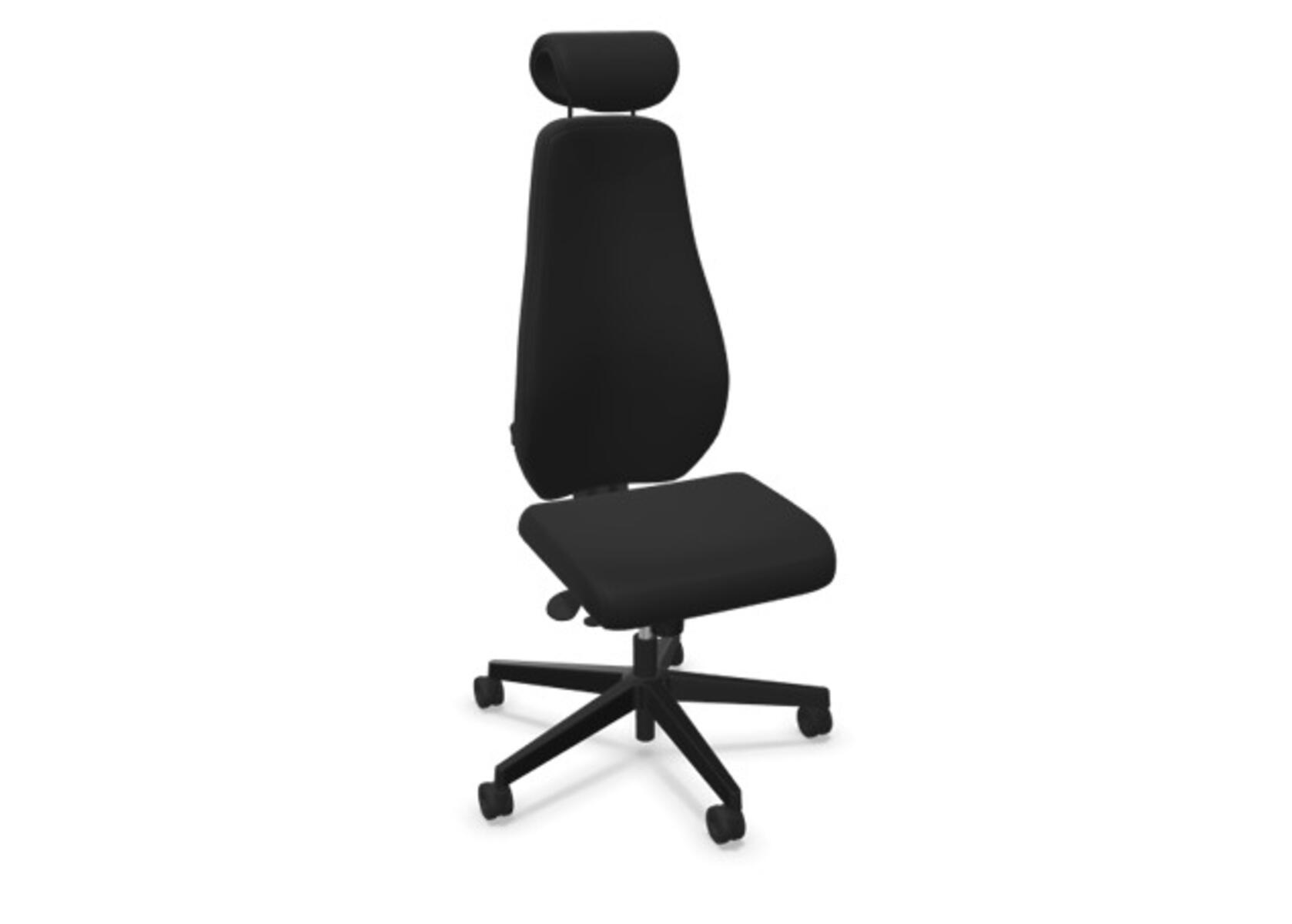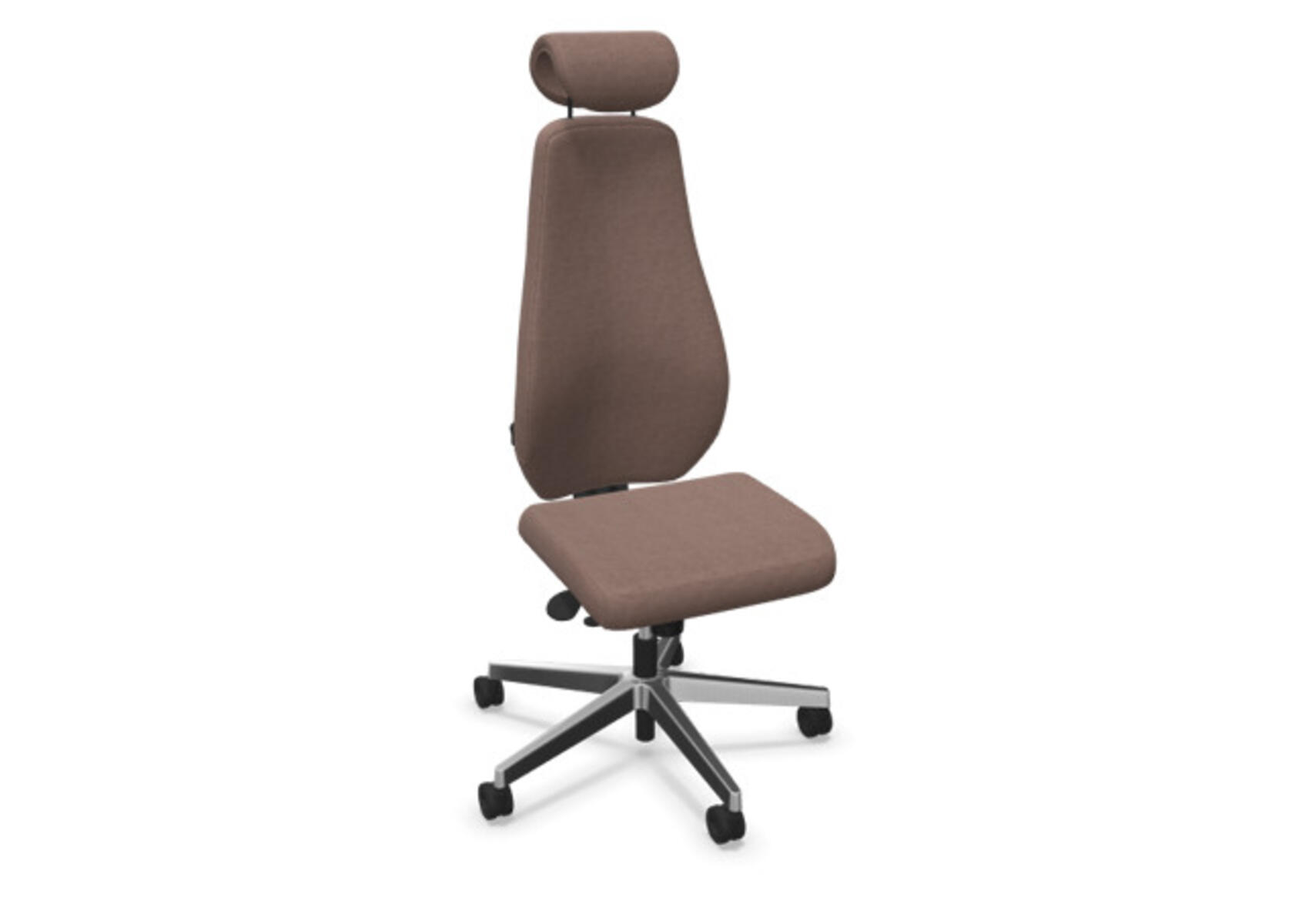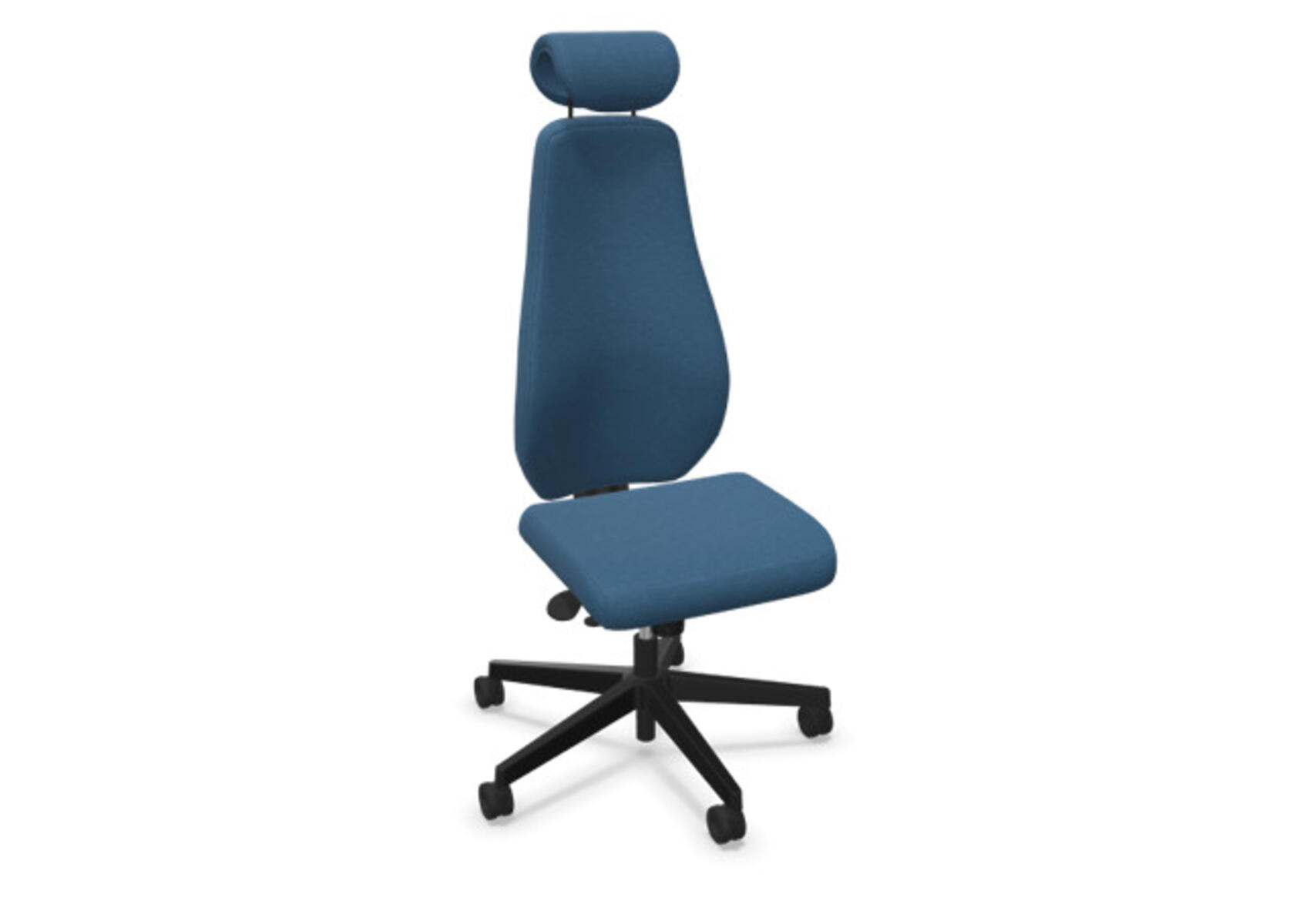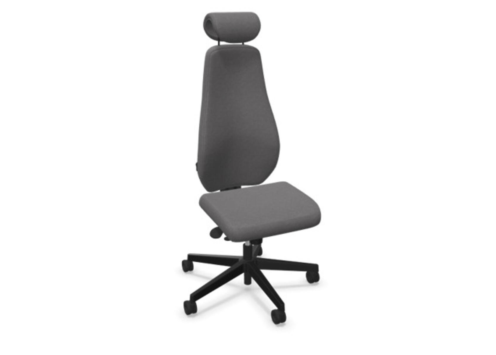 En stilren och ergonomisk kontorsstol med helklädd hög rygg och synkronmekanism, utformad för att ge stöd vid aktivt sittande under hela arbetsdagen. Den synkroniserade lutningen av ryggstöd och sits möjliggör aktiv och bekväm sittställning. Ryggstödslutningsvinkel 20° synkroniserad med sitslutningsvinkel 11°. Ryggstödet är låsbart i 5 olika lägen för individuell anpassning och du kan enkelt justera ryggstödets motstånd med ett vred. Ryggstödet är höjdjusterbart inom intervallet 70 mm med 13 låslägen. Justerbart, klätt nackstöd med vinkel-och höjdjustering inom intervallet 100 mm. Stolen har även Anti-Shock funktion vilket förhindrar ryggstödet slår tillbaka när lutningen låses upp. Välj mellan kryss i svart polyamid eller polerad alu samt självbromsande hjul för mjuka eller hårda golv. Som tillval finns även ländryggstöd (Shukra-mekanism), manuellt justerbart i djupled (20mm) med hjälp av ett vred. Armstöd 1D, 2D, 3D alternativt 4D säljs separat.