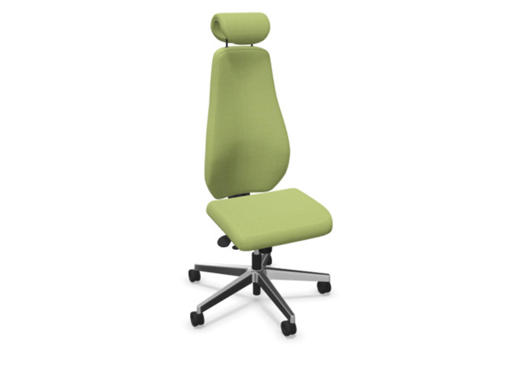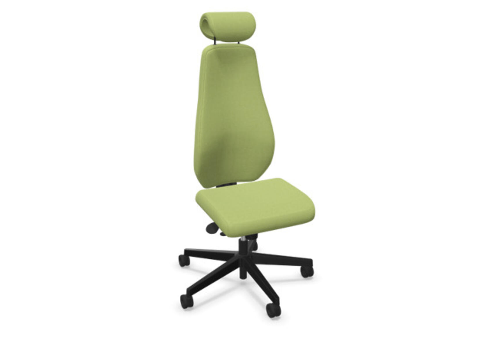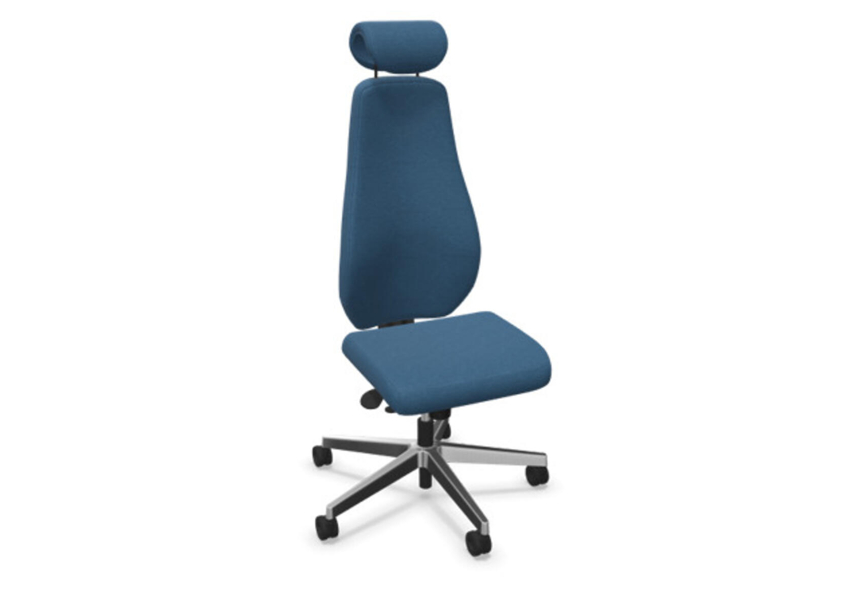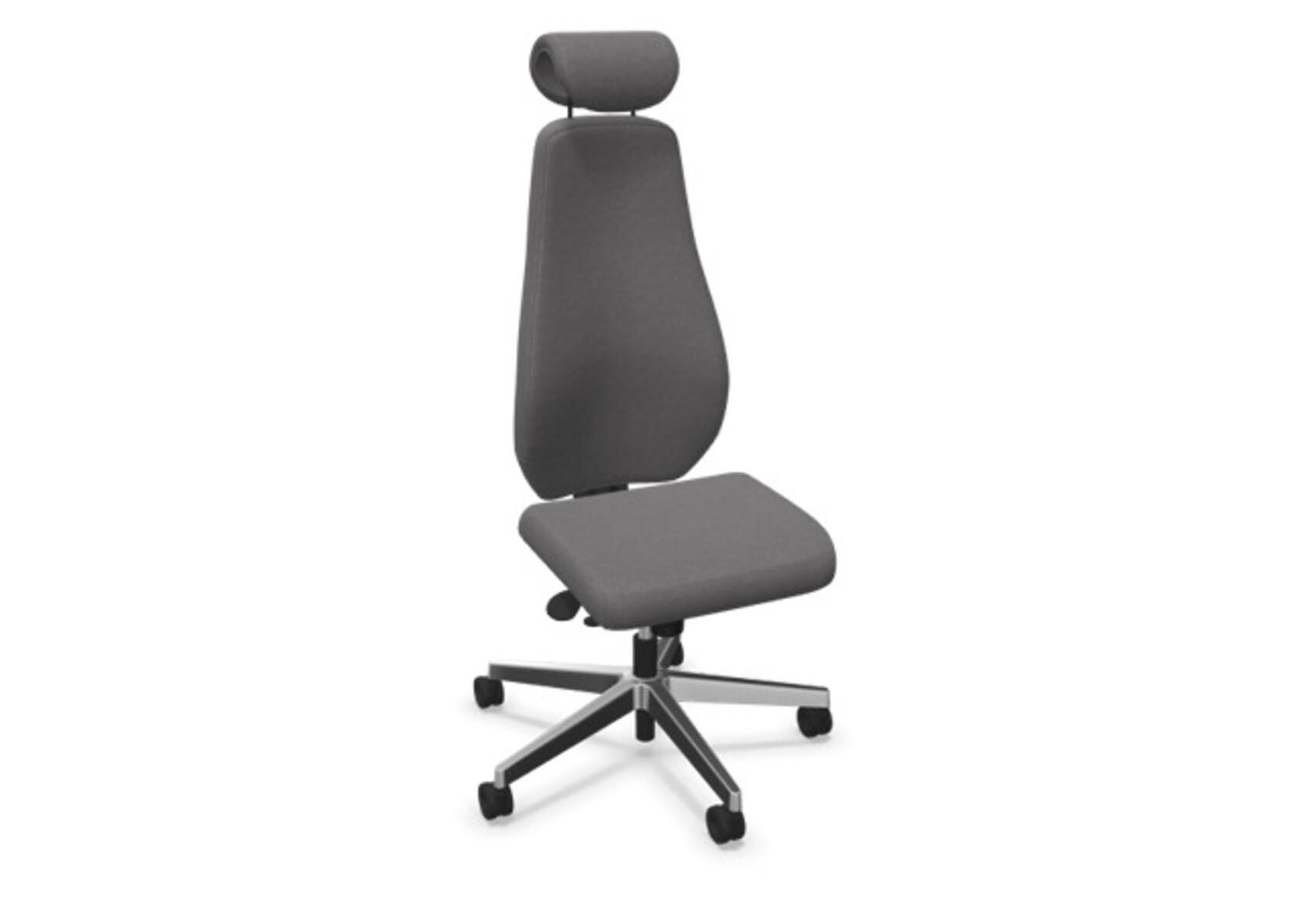 En stilren och ergonomisk kontorsstol med helklädd hög rygg och synkronmekanism, utformad för att ge stöd vid aktivt sittande under hela arbetsdagen. Den synkroniserade lutningen av ryggstöd och sits möjliggör aktiv och bekväm sittställning. Ryggstödslutningsvinkel 20° synkroniserad med sitslutningsvinkel 11°. Ryggstödet är låsbart i 5 olika lägen för individuell anpassning och du kan enkelt justera ryggstödets motstånd med ett vred. Ryggstödet är höjdjusterbart inom intervallet 70 mm med 13 låslägen. Justerbart, klätt nackstöd med vinkel-och höjdjustering inom intervallet 100 mm. Stolen har även Anti-Shock funktion vilket förhindrar ryggstödet slår tillbaka när lutningen låses upp. Välj mellan kryss i svart polyamid eller polerad alu samt självbromsande hjul för mjuka eller hårda golv. Som tillval finns även ländryggstöd (Shukra-mekanism), manuellt justerbart i djupled (20mm) med hjälp av ett vred. Armstöd 1D, 2D, 3D alternativt 4D säljs separat.