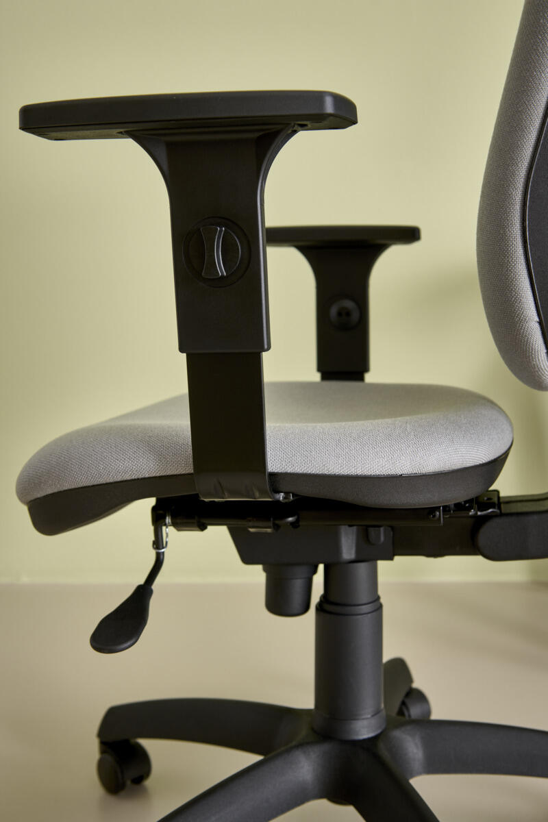 Synkronmekanism, låsbar i 5 olika lägen. Höj- och sänkbar, 44–57 cm. Ryggen ställbar i höjd. Sitsdjup ställbart 44–50 cm. Inkl. höjdjusterbara armstöd.