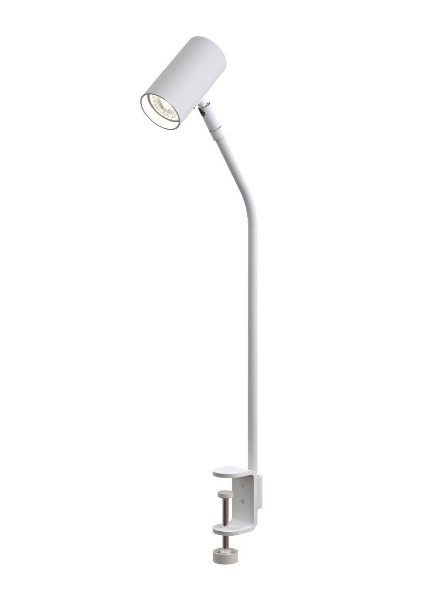 Diskret skrivbordslampa med klämma för skrivbordskanten istället för vanlig bordsfot. Flexarm för optimal arbetsbelysning. Lampan har fast LED-belysning om 3 W. 2 m lång sladd med strömbrytare.