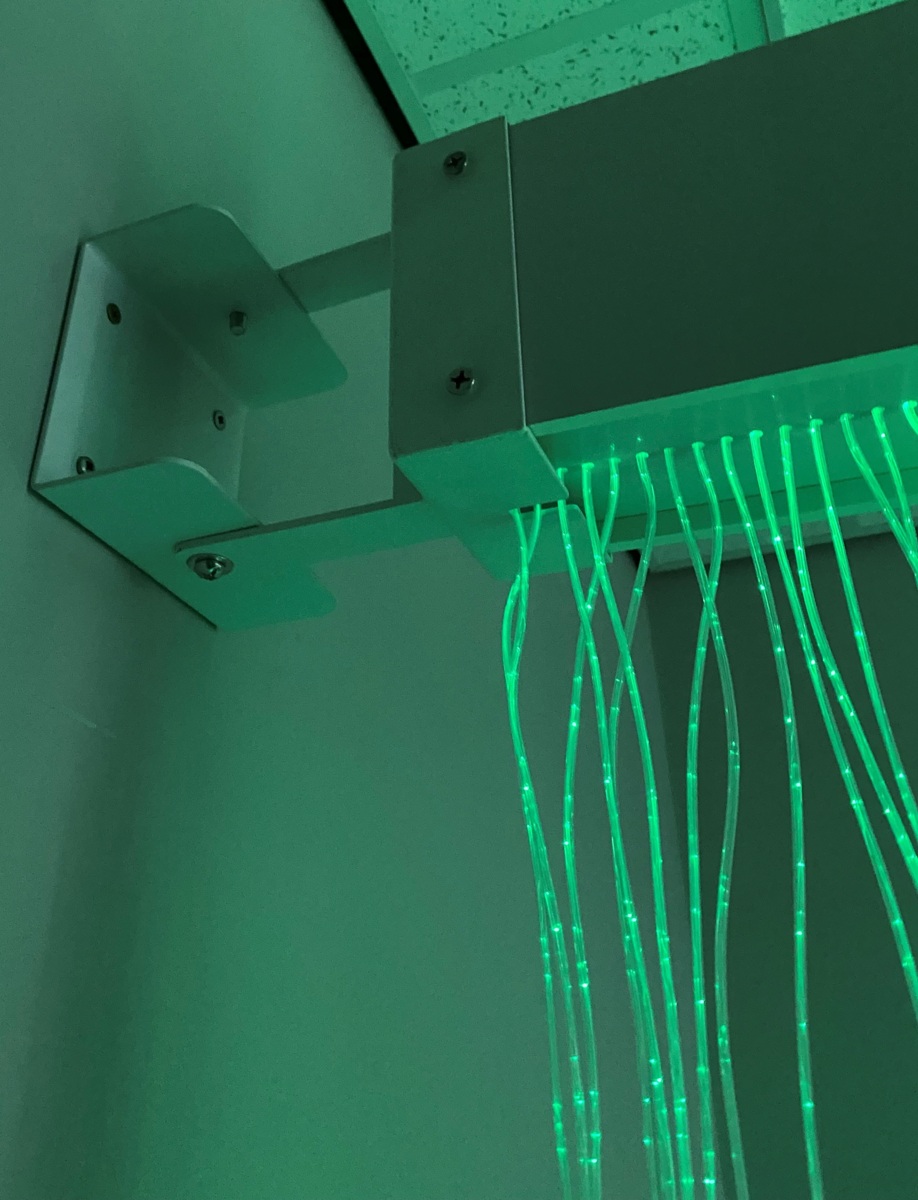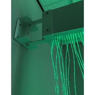 Fästs på väggen så att de lysande trådarna hänger ner på ett säkert vis som en kaskad eller ett tält. Fiberoptikduschar används för avslappning i kombination med lugn musik eller sagoläsning. Mått: 47x16x10 cm.