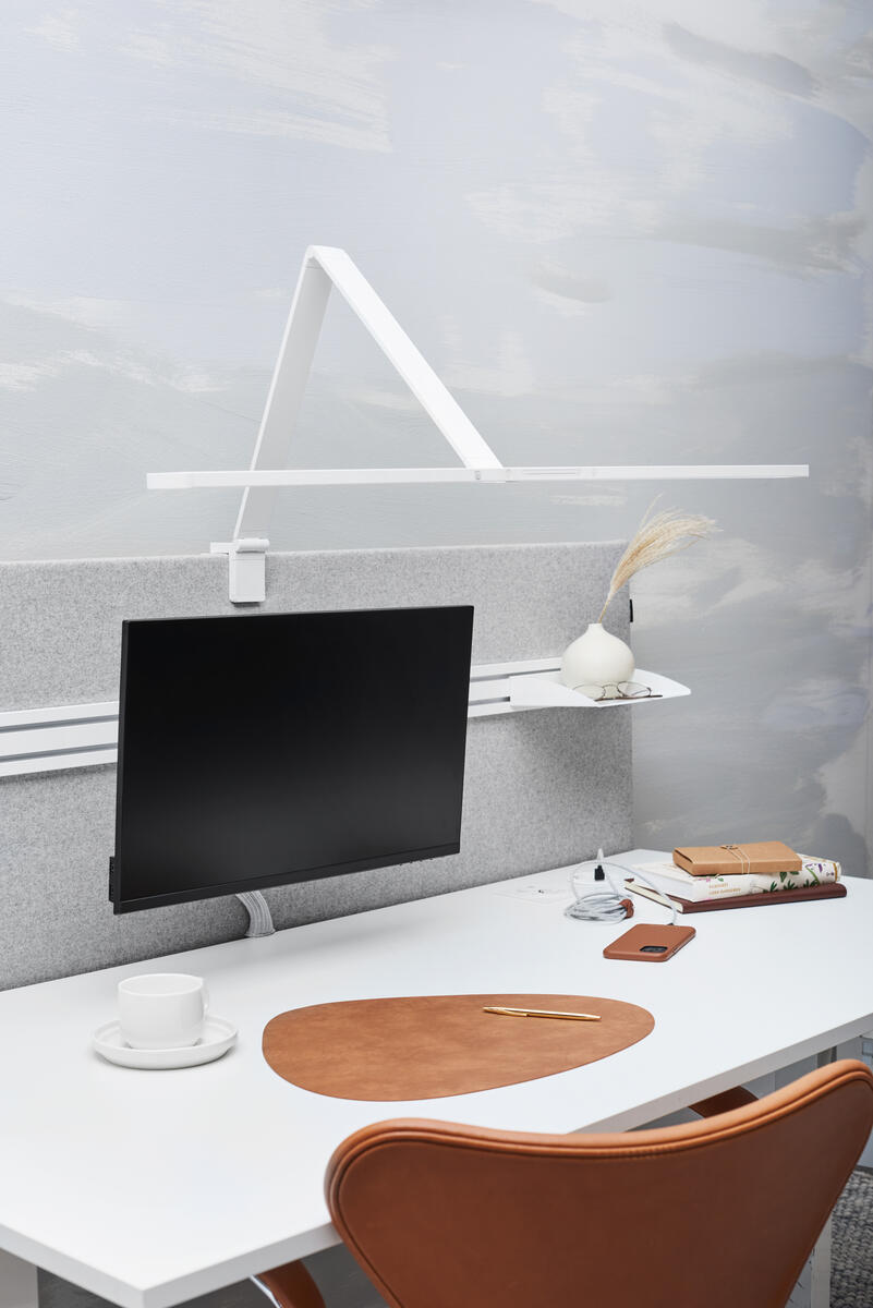 Diskret skrivbordslampa med klämma för skrivbordskanten istället för vanlig bordsfot. Flexarm för optimal arbetsbelysning. Lampan har fast LED-belysning om 3 W. 2 m lång sladd med strömbrytare.