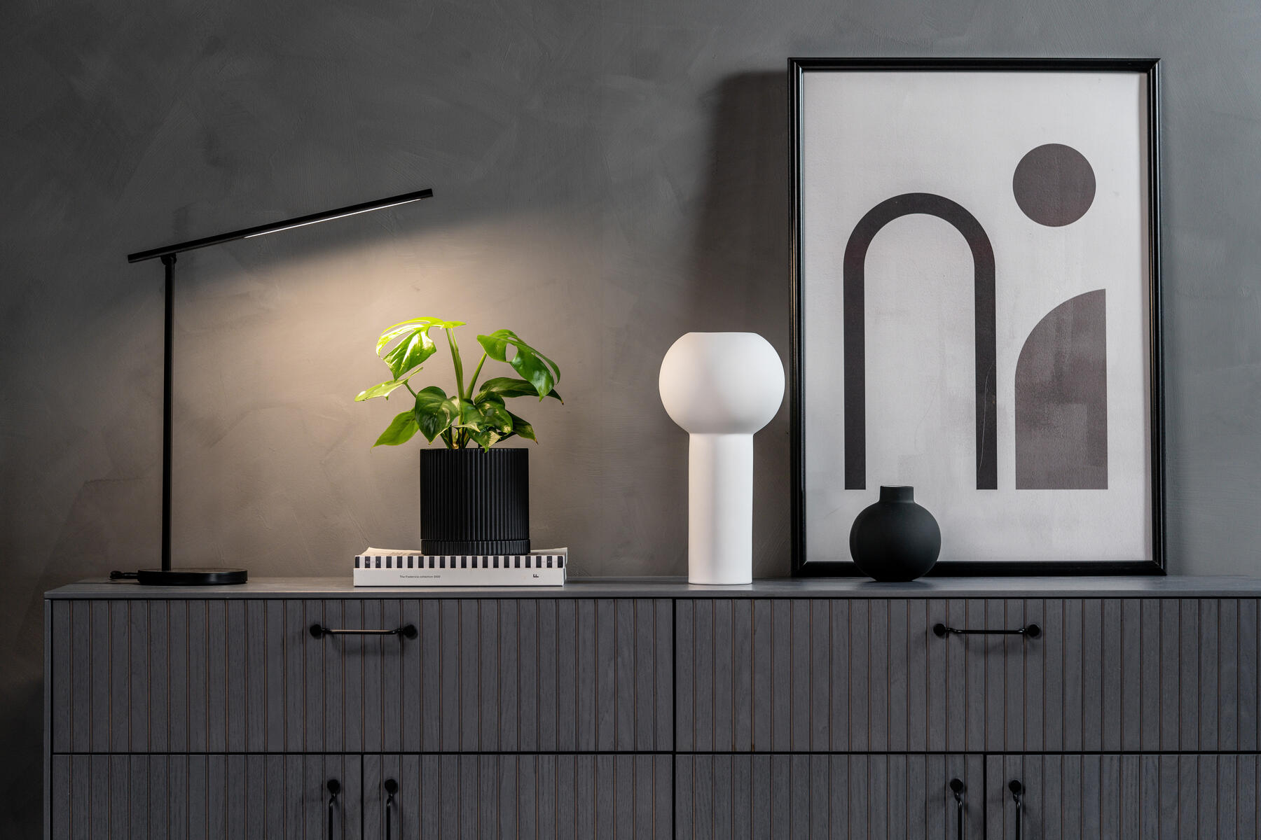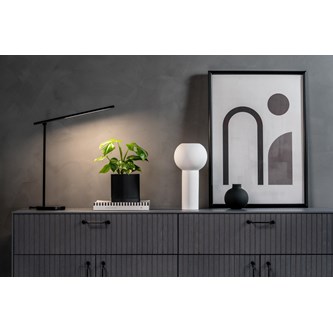 Bordslampa i klassisk design. Den böjda metallskärmen och den enkla, stilrena utformningen av stativet gör detta till en lampa som kan användas i många miljöer och i många år. Armaturen är ej dimbar. Max watt: 40. Sockel E14. Sladd 2 m. Ljuskälla ingår ej.