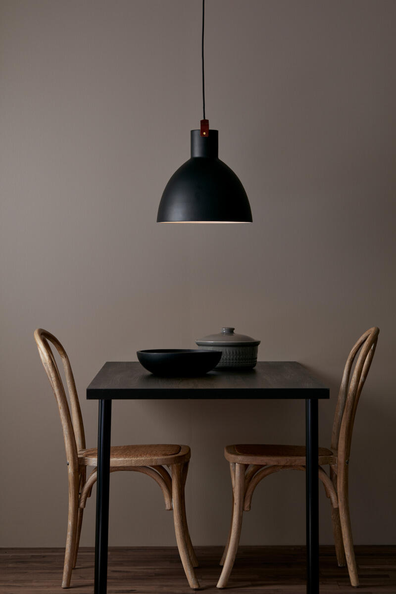 En stilren pendel som enkelt lyfter helhetsintrycket i rummet. Läderdetaljen tillför både värme och karaktär och skapar en harmonisk kontrast till den rena formen. Armaturen har ej inbyggd dimmerfunktion men är dimbar med dimbar ljuskälla. Max watt: 60 W. Sockel: E27. 1,5 m textil sladd. Krokupphäng. Ljuskälla ingår ej. IP-klass: IP20. Säkerhetsklass: Class I.