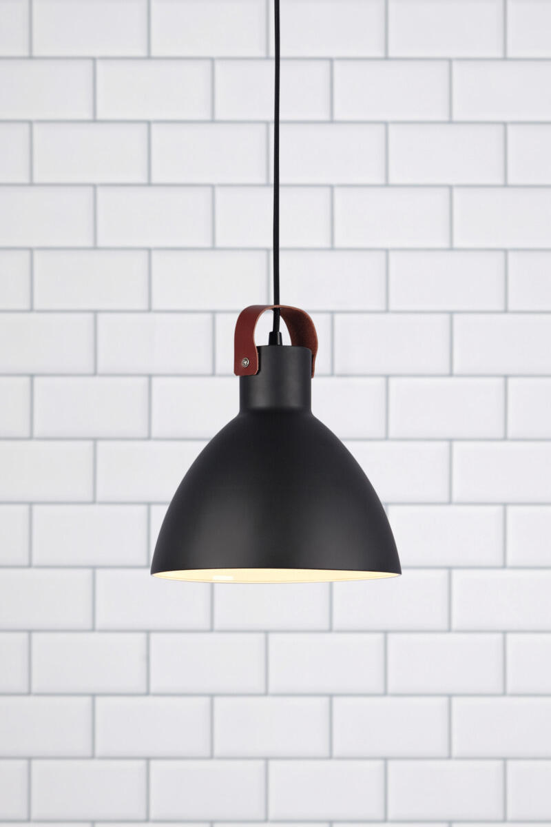 En stilren pendel som enkelt lyfter helhetsintrycket i rummet. Läderdetaljen tillför både värme och karaktär och skapar en harmonisk kontrast till den rena formen. Armaturen har ej inbyggd dimmerfunktion men är dimbar med dimbar ljuskälla. Max watt: 60 W. Sockel: E27. 1,5 m textil sladd. Krokupphäng. Ljuskälla ingår ej. IP-klass: IP20. Säkerhetsklass: Class I.