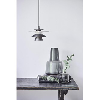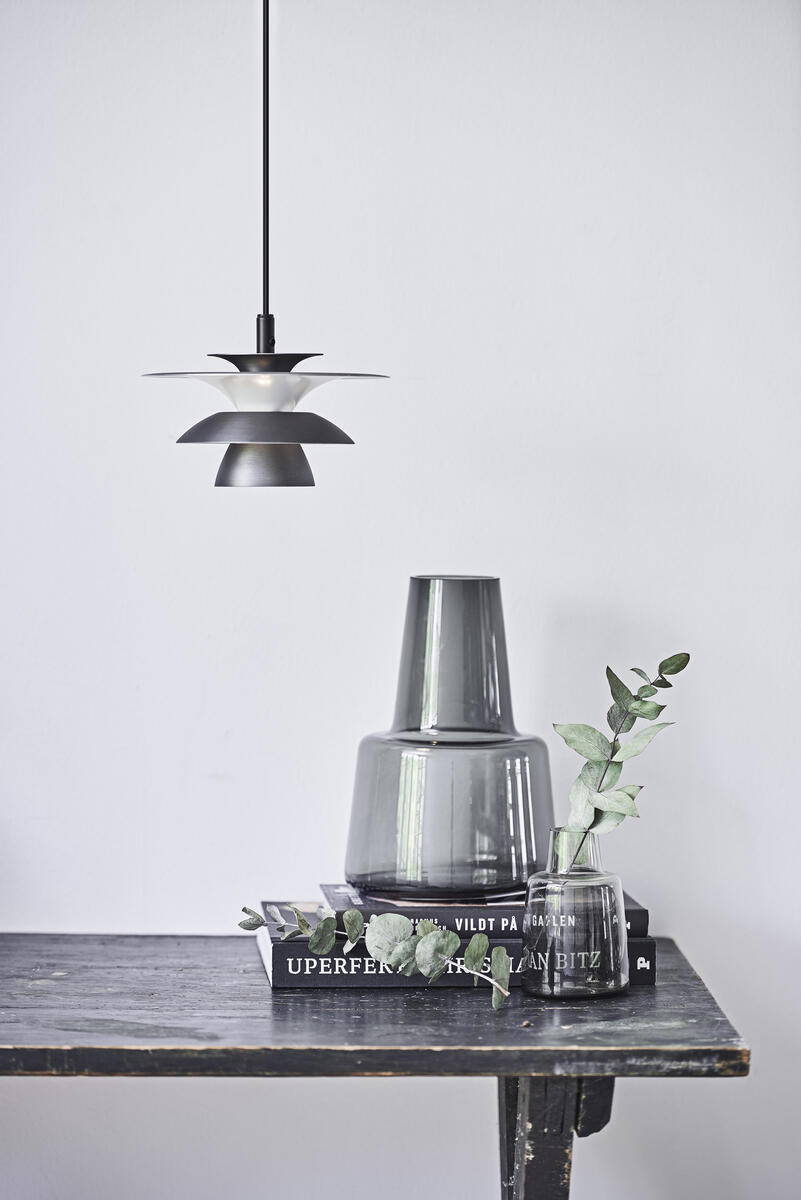 Pendel av hög kvalitet med ett solitt uttryck trots de mjuka formerna. Designen passar alla val av inredning, miljö och stil. Glaskupa opal. Armaturen är dimbar. Max watt: 40. Sockel E14. Sladd svart textil 3 m. Ljuskälla ingår ej.
