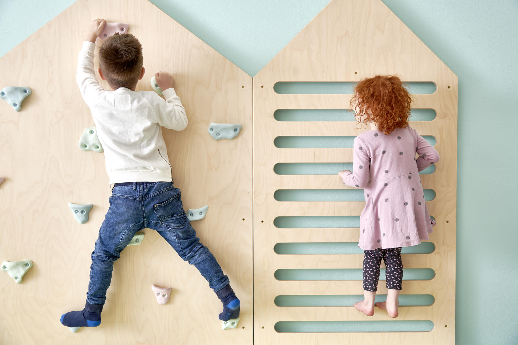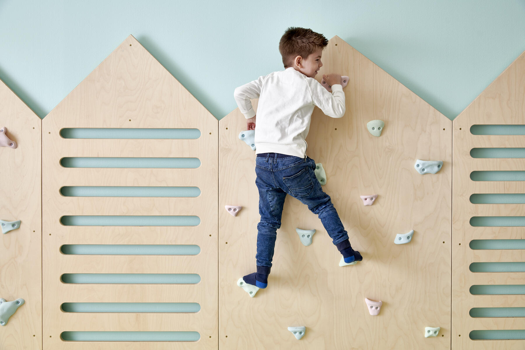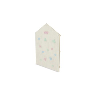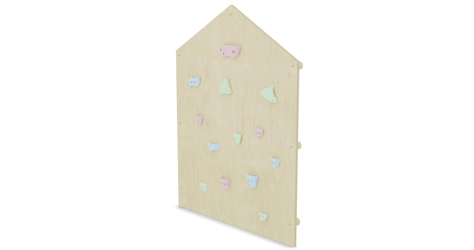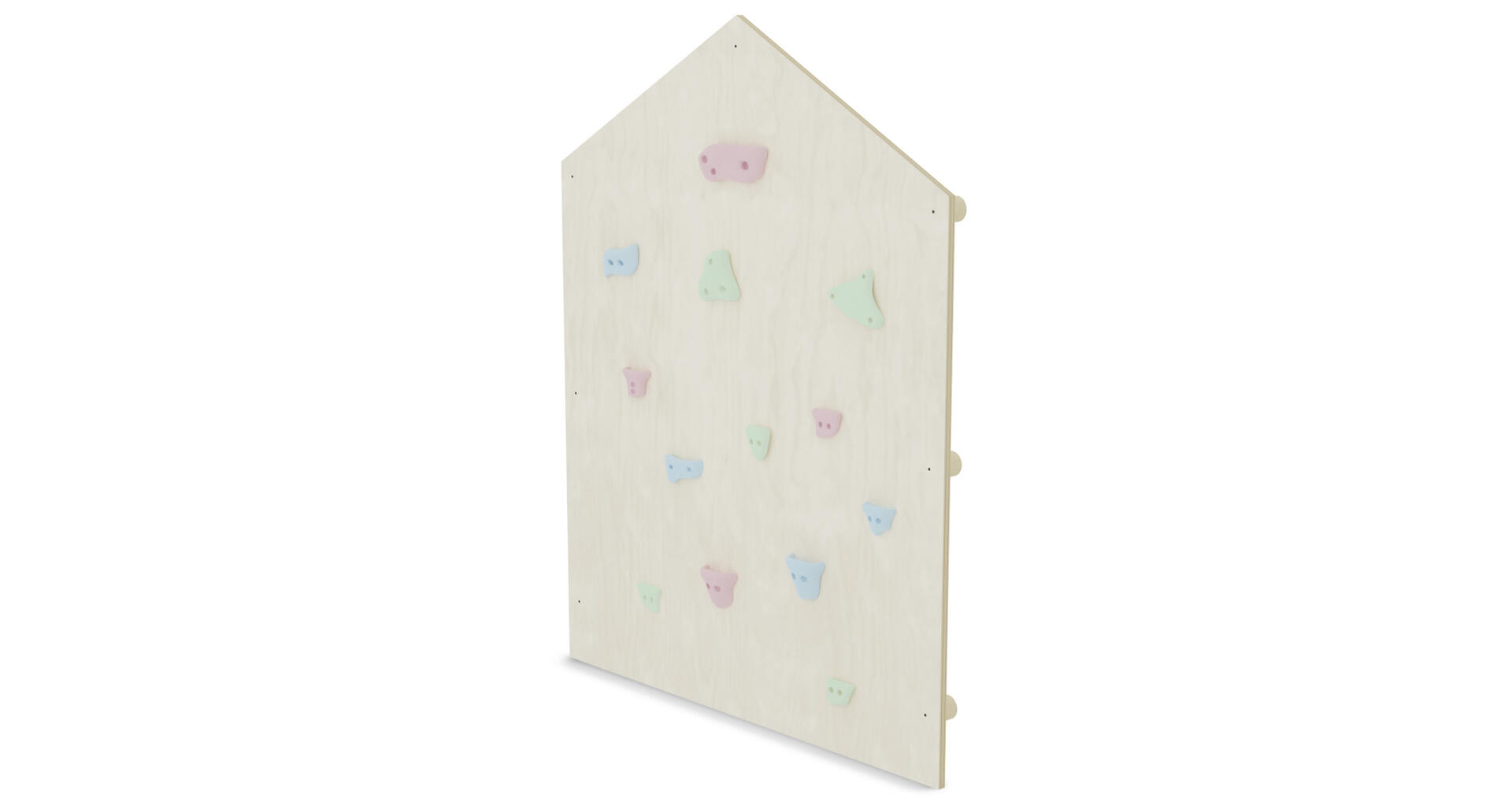 Motorikvägg som monteras direkt på väggen. Monteras flera väggar bredvid varandra är det viktigt att de monteras ihop för att minimera klämrisken. Används alltid med godkänt fallunderlag enligt EN1177. Fallutrymme 1,5 m runtom. Väggen är försedd med klättergrepp i flera olika pastellfärger. Med förborrade hål. Förborrade distanser medföljer för att det ska bli rätt avstånd från väggen. Björkplywood.
