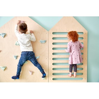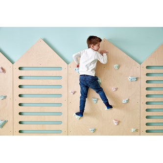 Motorikvägg som monteras direkt på väggen. Monteras flera väggar bredvid varandra är det viktigt att de monteras ihop för att minimera klämrisken. Används alltid med godkänt fallunderlag enligt EN1177. Fallutrymme 1,5 m runtom. Väggen är försedd med klättergrepp. Med förborrade hål. Förborrade distanser medföljer för att det ska bli rätt avstånd från väggen. Björkplywood.