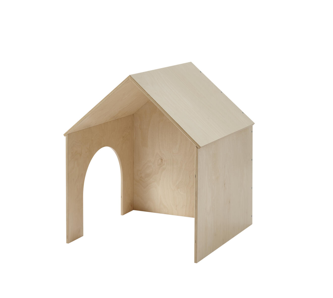 Hus i plywood som blir ett eget hus i rummet. Tre väggar varav en har en öppning i form av en portal som man kan krypa in och ut ur. Helt tak. Hemma Hus litet passar inuti Hemma Hus mellan och stort. Man kan sitta i lugn och ro i egna tankar – avskilt men ändå i rummet. Klarlackat. Mått: B72xD72xH84 cm.