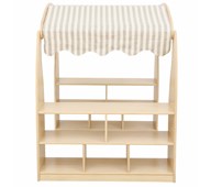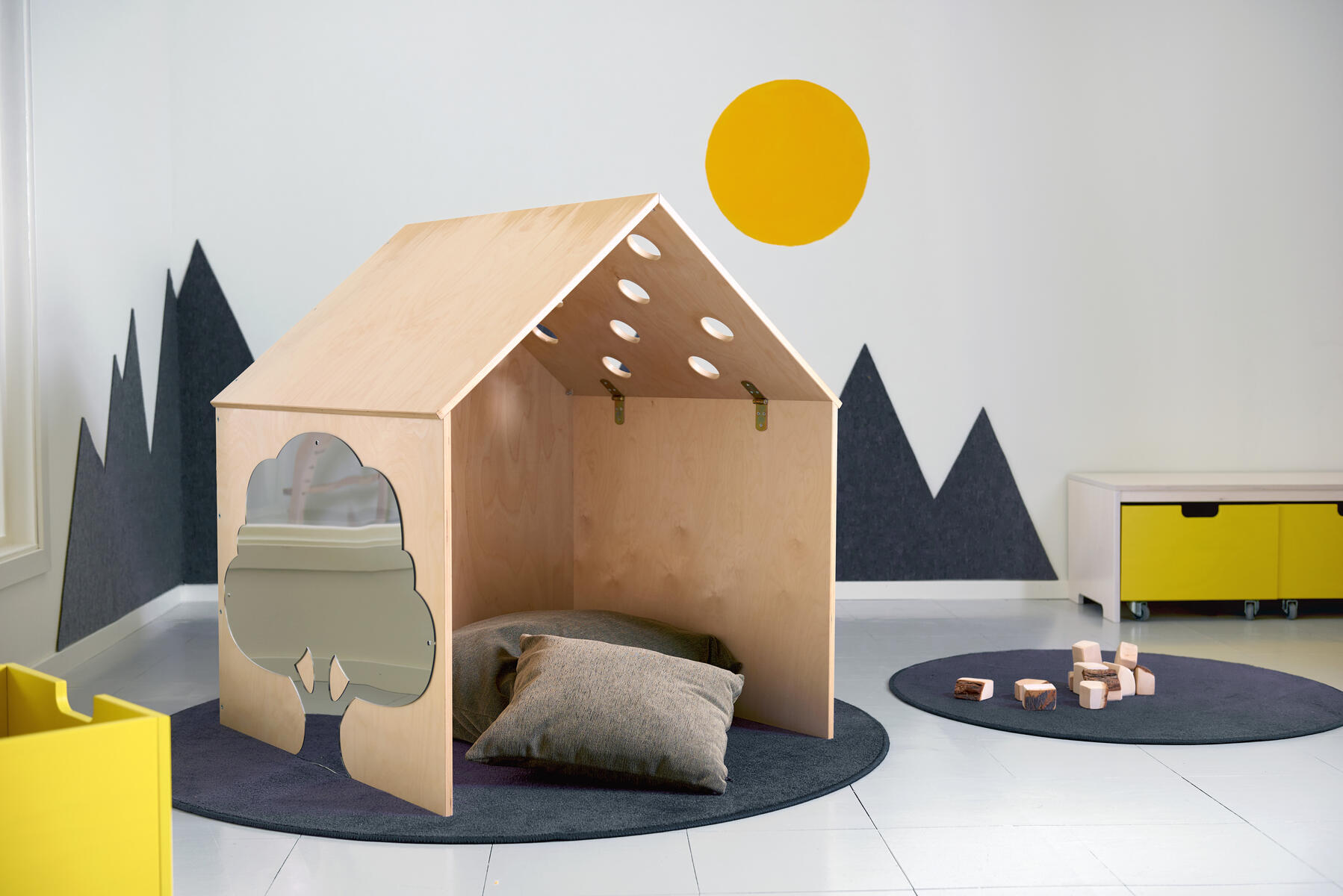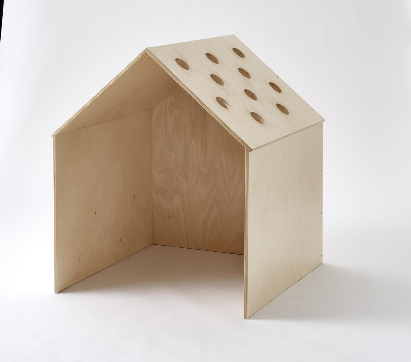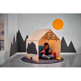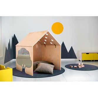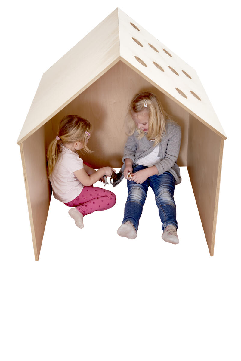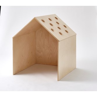 Hus i plywood som blir ett eget hus i rummet. Tre hela väggar och ett tak med hål; i hålen passar t.ex. en boll av storlek tennisboll, ärtpåse eller liknande. Hemma Hus stort passar utanpå och litet passar inuti. Man kan sitta i lugn och ro i egna tankar – avskilt men ändå i rummet. Klarlackat. Mått: B87xD87xH100 cm.