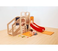 Med Tobiniserien kan du bygga ditt eget landskap efter plats och behov. Utgå från vilken bas som passar er verksamhet bäst och välj sedan tillval som stege, trappa eller rutschkana. Innehåller två torn samt tunnel att krypa igenom med hål i taket för en sensorisk upplevelse. (Rutschkana, trappa etc. ingår ej, se nedan.) Kan placeras centralt eller i rummets hörn. Med många olika materialval och taktila strukturer motiveras och uppmuntras barnens samspel mellan färger och former. Tillval går att beställa. Dekorationer och matta på bilden ingår ej. Tillbehören på bilden är: Tobini rutschkana 80448, Tobini stege 80449 och Tobini trappa 80450. Mått: 186x66x130 cm. Höjd på plattform: 58 cm. För barn 1–5 år.