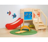 Med Tobiniserien kan du bygga ditt eget landskap efter plats och behov. Utgå från vilken bas som passar er verksamhet bäst och välj sedan tillval som stege, trappa eller rutschkana. Innehåller två torn sammanlänkade med ett akvarium med fiskar i 100 % bomull. (Rutschkana, trappa etc. ingår ej, se nedan.) Kan placeras centralt eller i rummets hörn. Med många olika materialval och taktila strukturer motiveras och uppmuntras barnens samspel mellan färger och former. Tillval går att beställa. Dekorationer och matta på bilden ingår ej. Tillbehören på bilden är: Tobini rutschkana 80448, Tobini trappa 80450. Mått: 233x66x130 cm. Höjd på plattform: 60 cm. För barn 1–5 år.