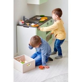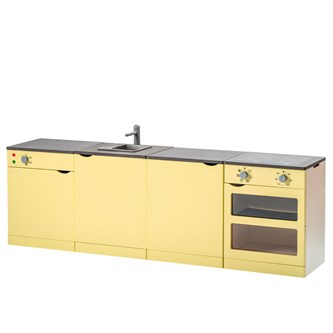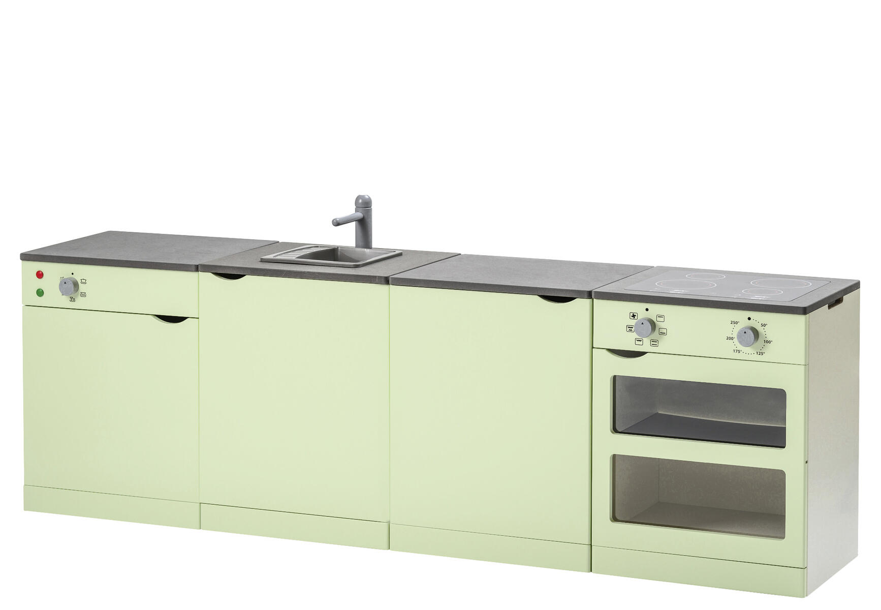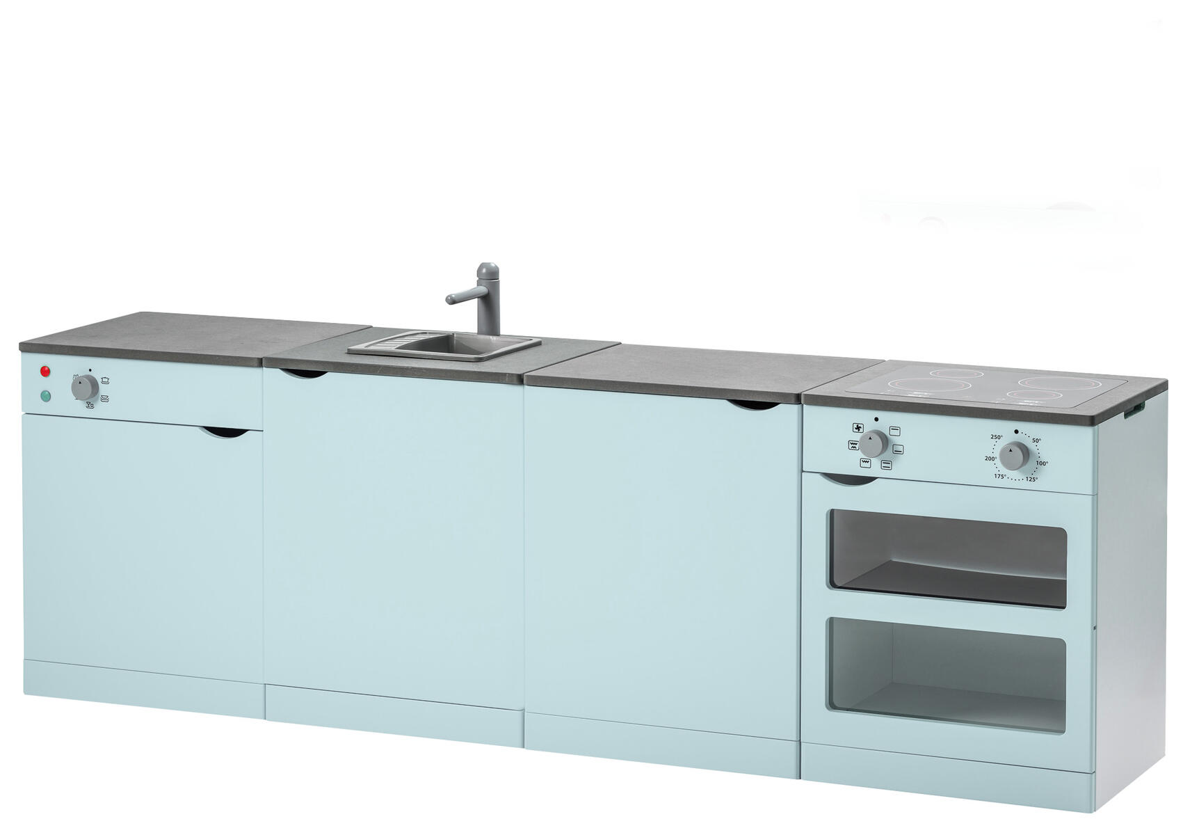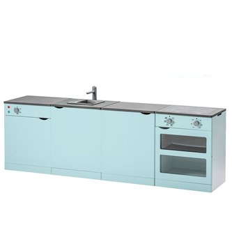 Komplett set med lekköksmoduler. Innehåller kylskåp, spis, diskmaskin och diskbänk (ej hörnskåp). Alla delar har öppningsbara luckor och funktioner som gör dem verklighetstrogna. Levereras omonterad. Ska förankras i vägg. Höjd; Kylskåp 79 cm, övriga 55 cm. Total bredd: 185 cm. Djup: 36 cm. Av FSC-märkt plywood och trä. PVC-fri. Från 3 år.