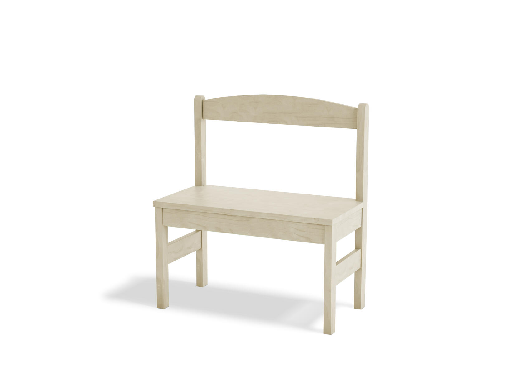 Barnsoffa/barnbord. Vändbar för två olika sitthöjder. Försedd med gummilist, för tystare miljö. Sittyta vitpigmenterad eller björkfärgad. Mått: L62xB30xH39 cm, sitthöjd 17/23 cm. Klarlackerad plywood.