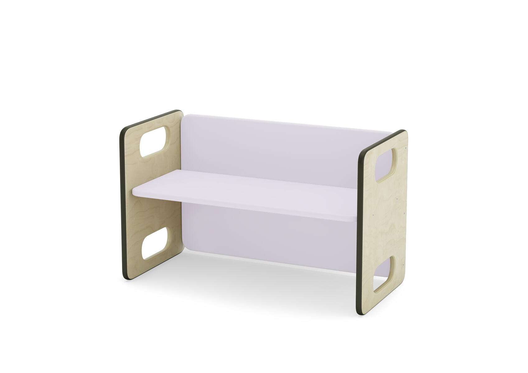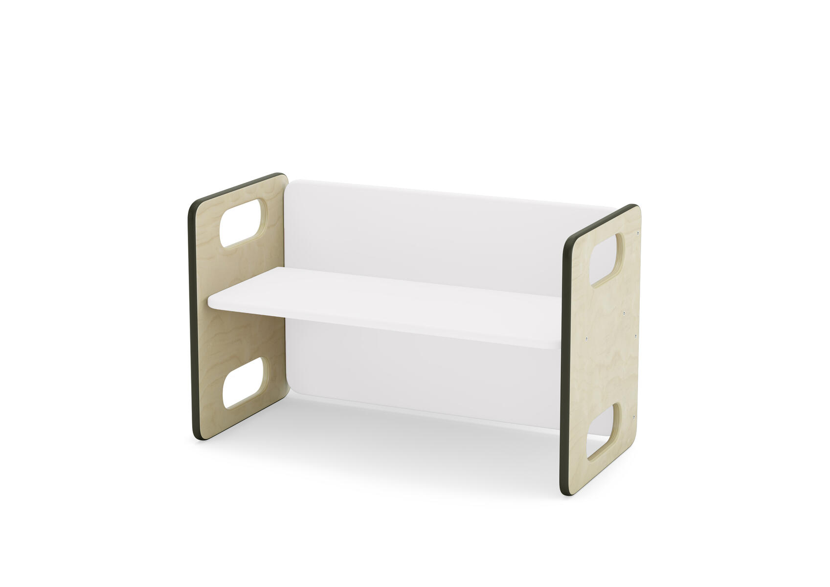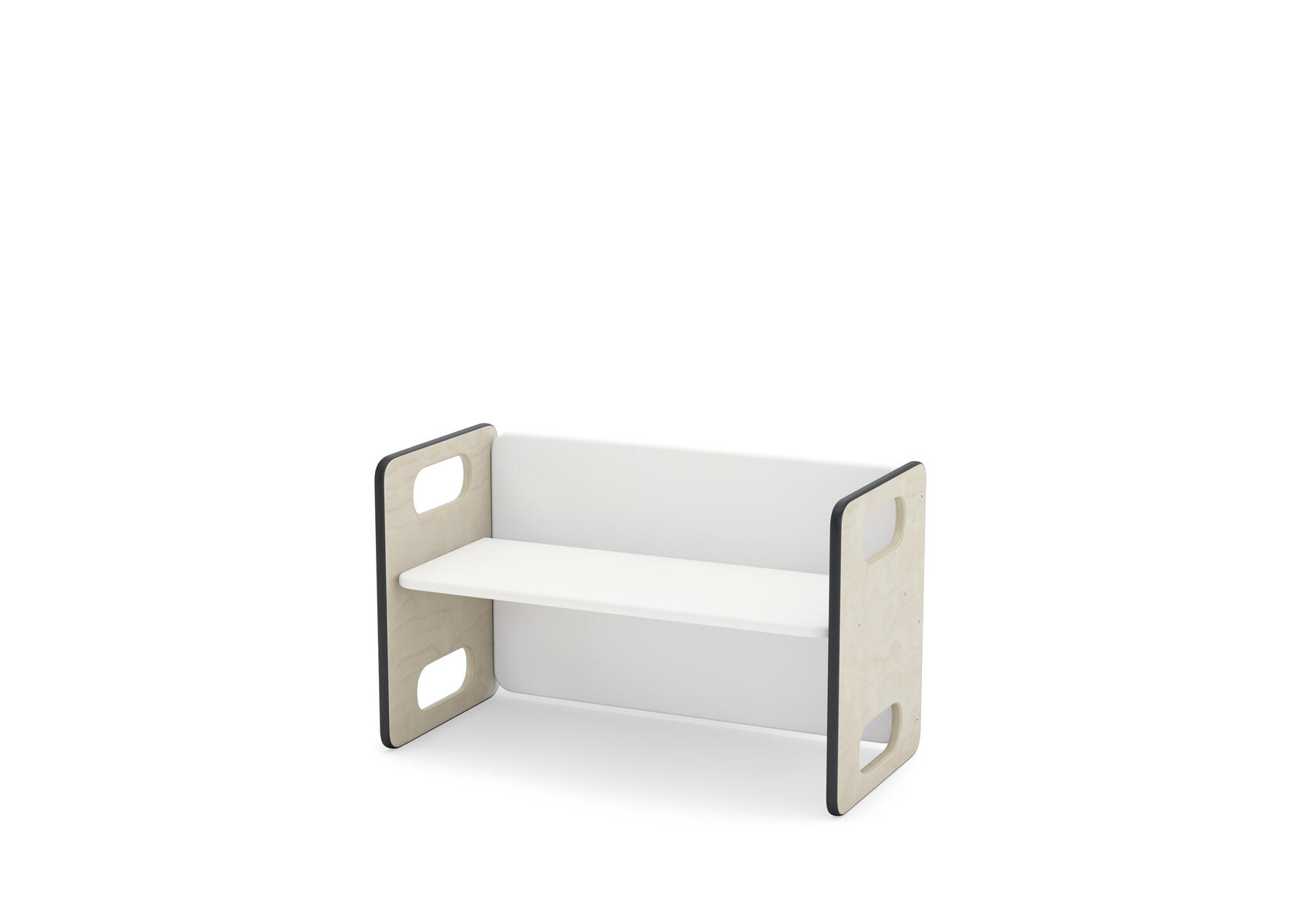 Barnsoffa/barnbord. Vändbar för två olika sitthöjder. Försedd med gummilist, för tystare miljö. Sittyta vitpigmenterad eller björkfärgad. Mått: L62xB30xH39 cm, sitthöjd 17/23 cm. Klarlackerad plywood.
