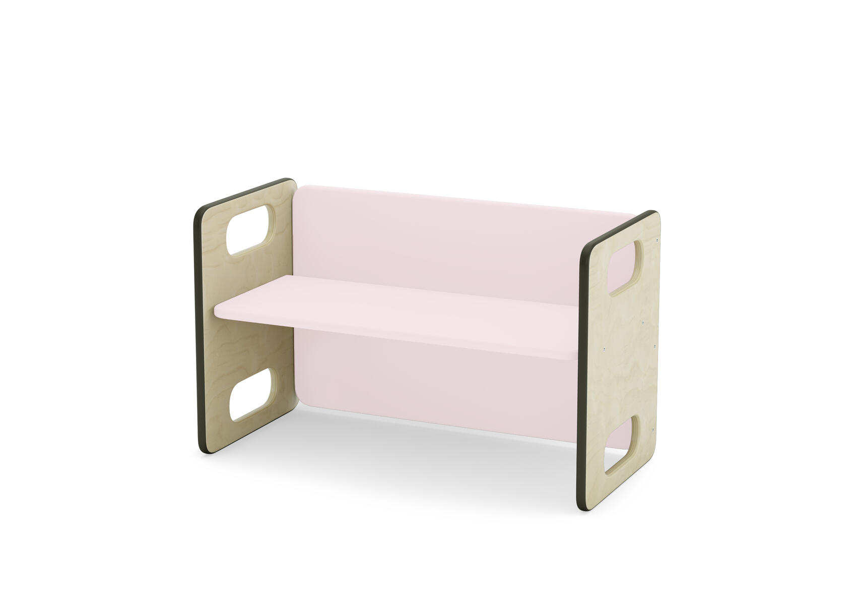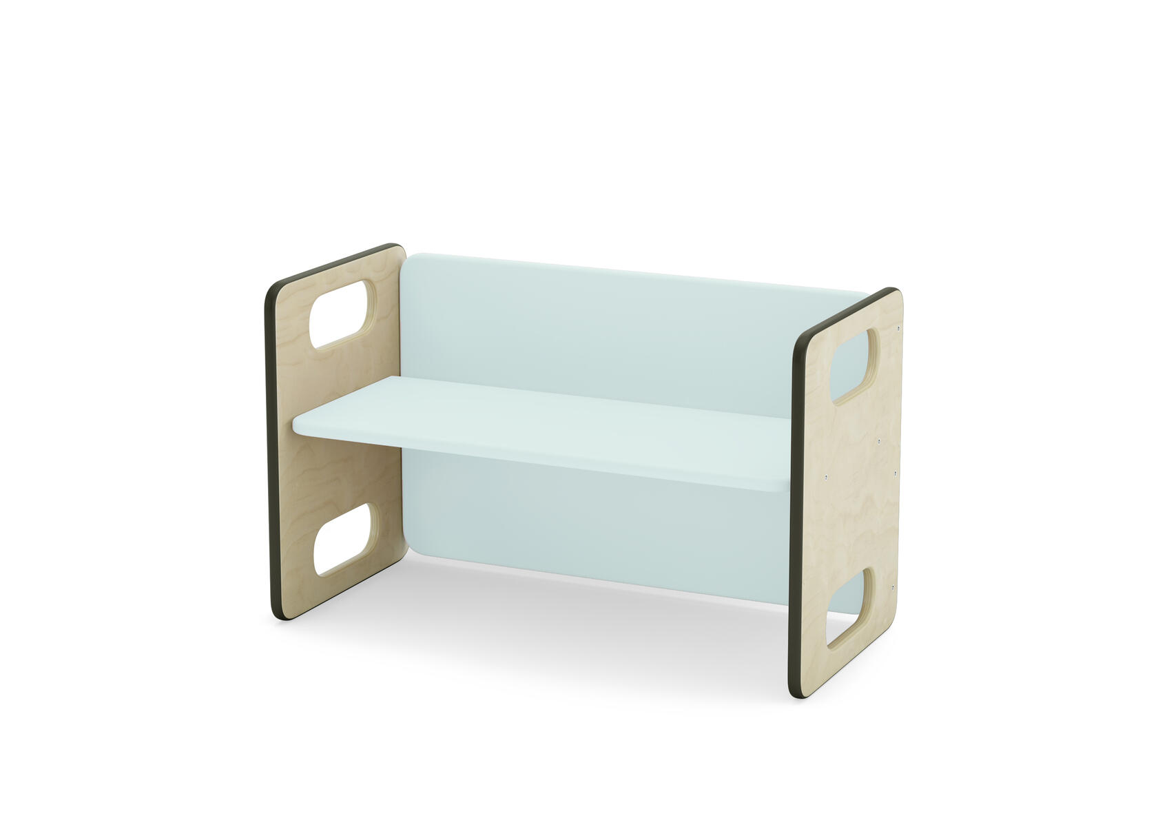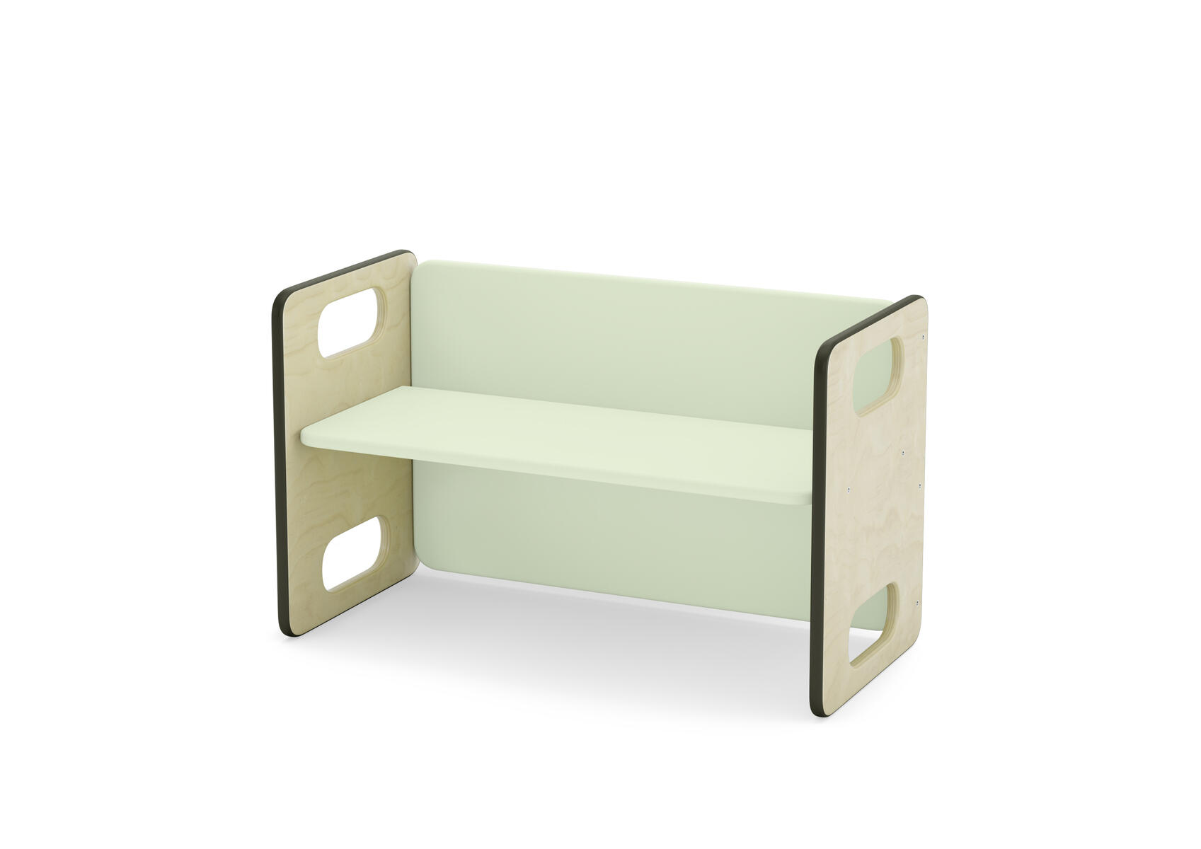 Barnsoffa/barnbord. Vändbar för två olika sitthöjder. Försedd med gummilist, för tystare miljö. Sittyta vitpigmenterad eller björkfärgad. Mått: L62xB30xH39 cm, sitthöjd 17/23 cm. Klarlackerad plywood.