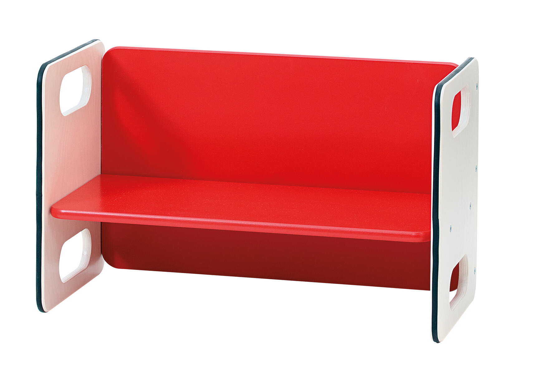 Barnsoffa/barnbord. Vändbar för två olika sitthöjder. Försedd med gummilist, för tystare miljö. Rödmålad sittyta. Mått: L62xB30xH39 cm, sitthöjd 17/23 cm. Klarlackerad kryssfaner.