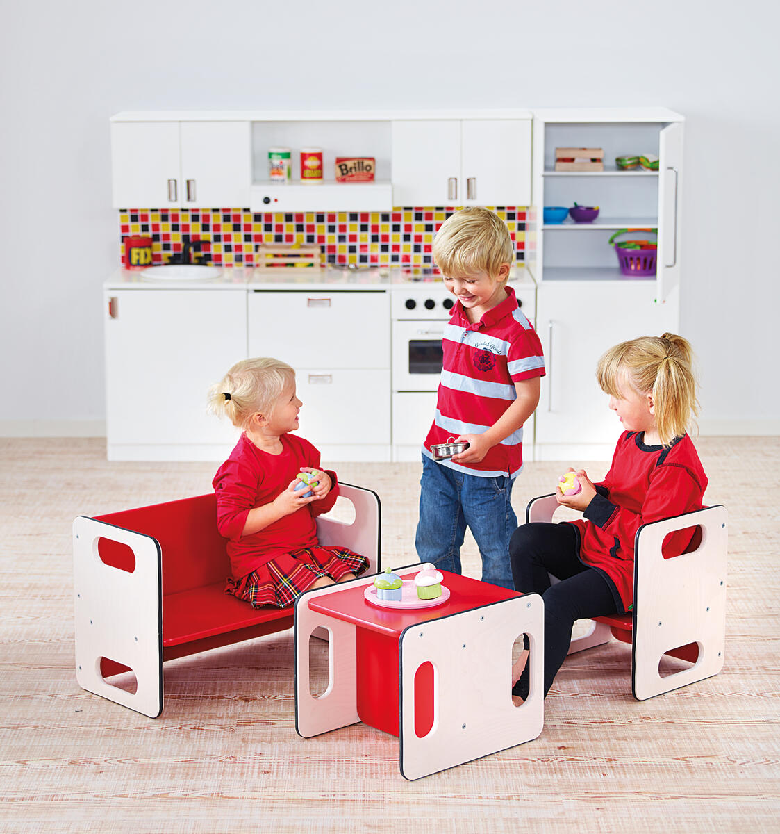 Barnsoffa/barnbord. Vändbar för två olika sitthöjder. Försedd med gummilist, för tystare miljö. Sittyta vitpigmenterad eller björkfärgad. Mått: L32xB30xH39 cm, sitthöjd 17/23 cm. Klarlackerad plywood.