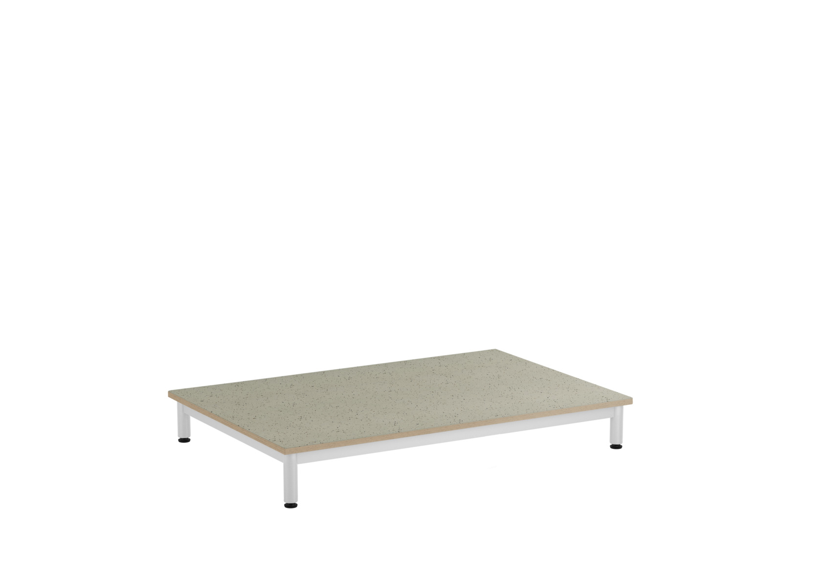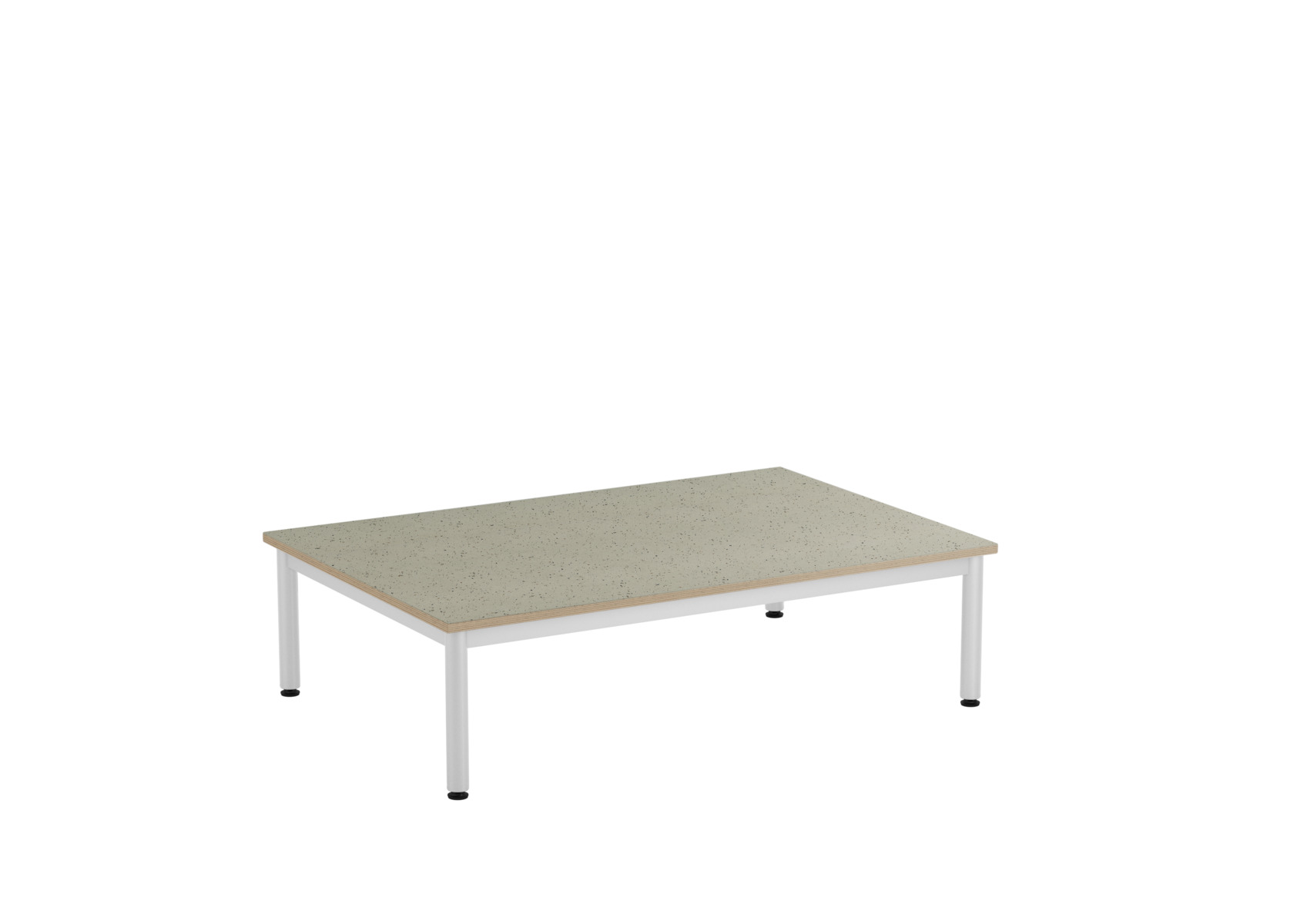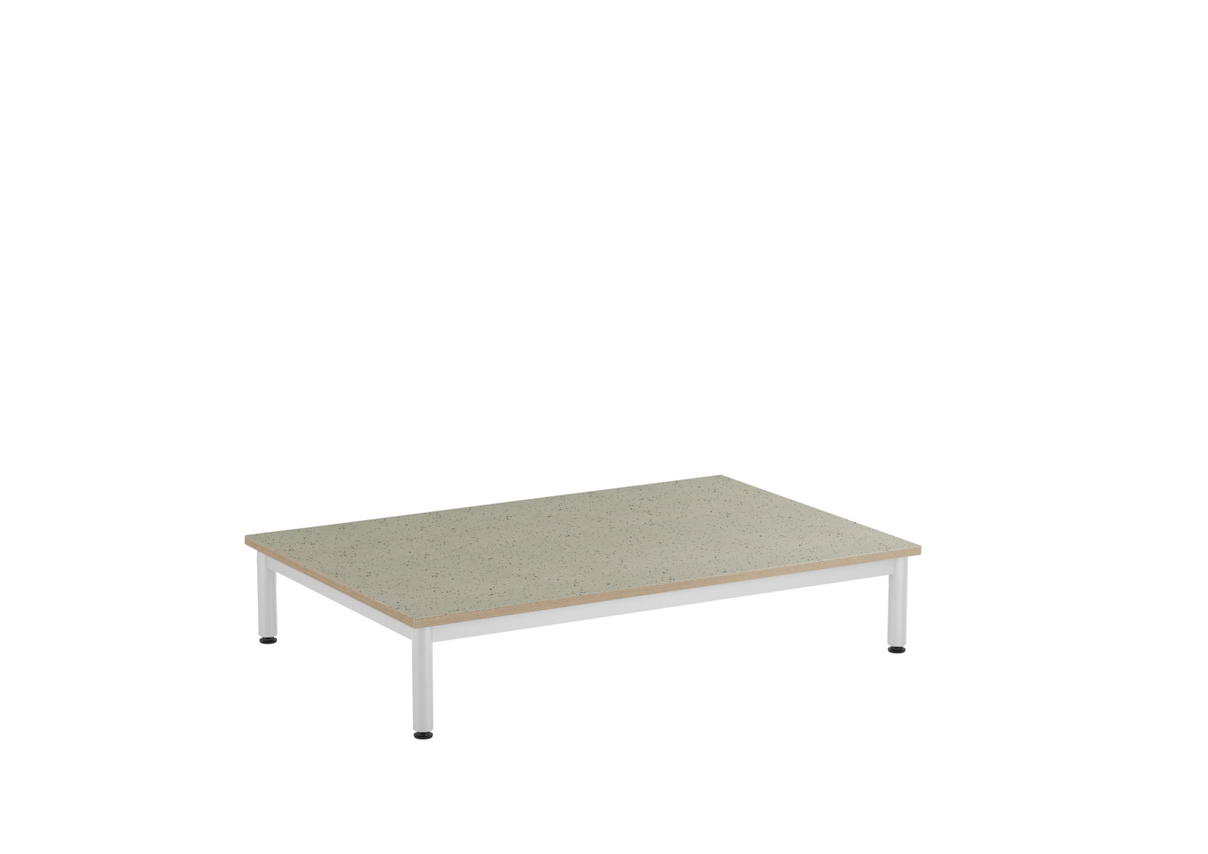 Ett lekbord med bordsskiva i akustik linoleum vilket bidrar till en bättre ljudmiljö tack vare linoleumets ljuddämpande egenskaper. Stabilt underrede med ram och ben i ø 40 mm dimension lackerat i vitt. Ställbara tassar för anpassning mot ojämna ytor.
