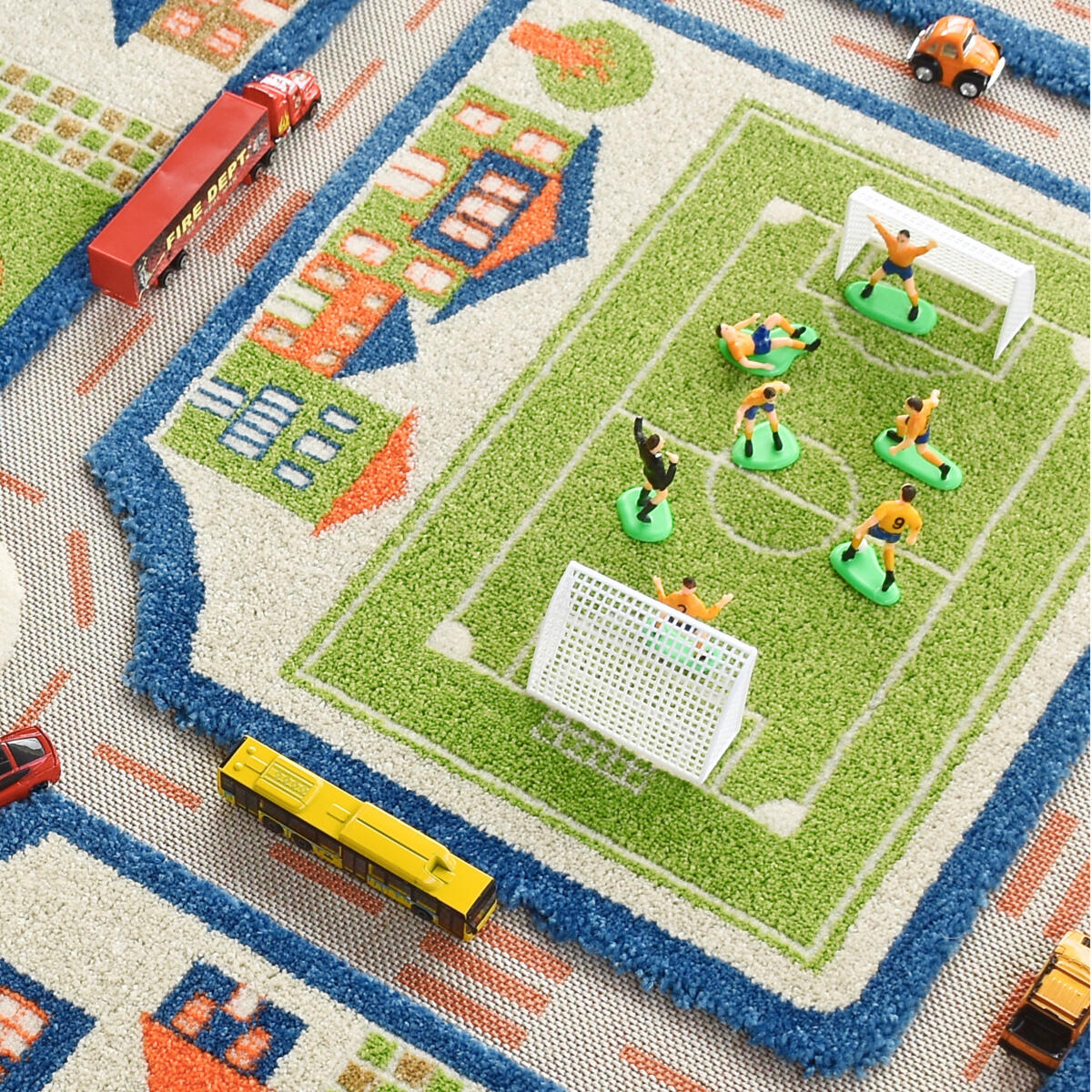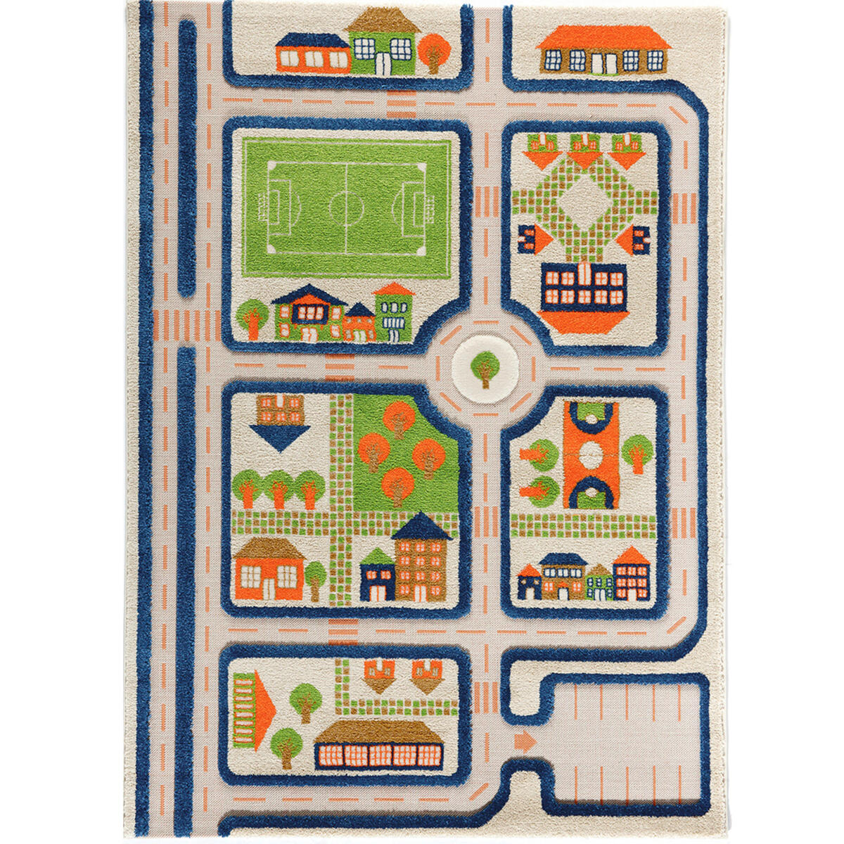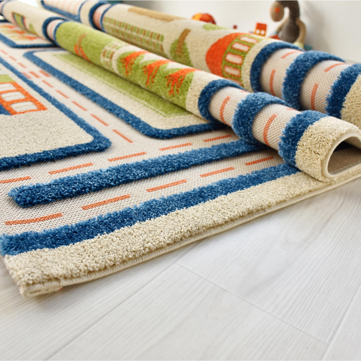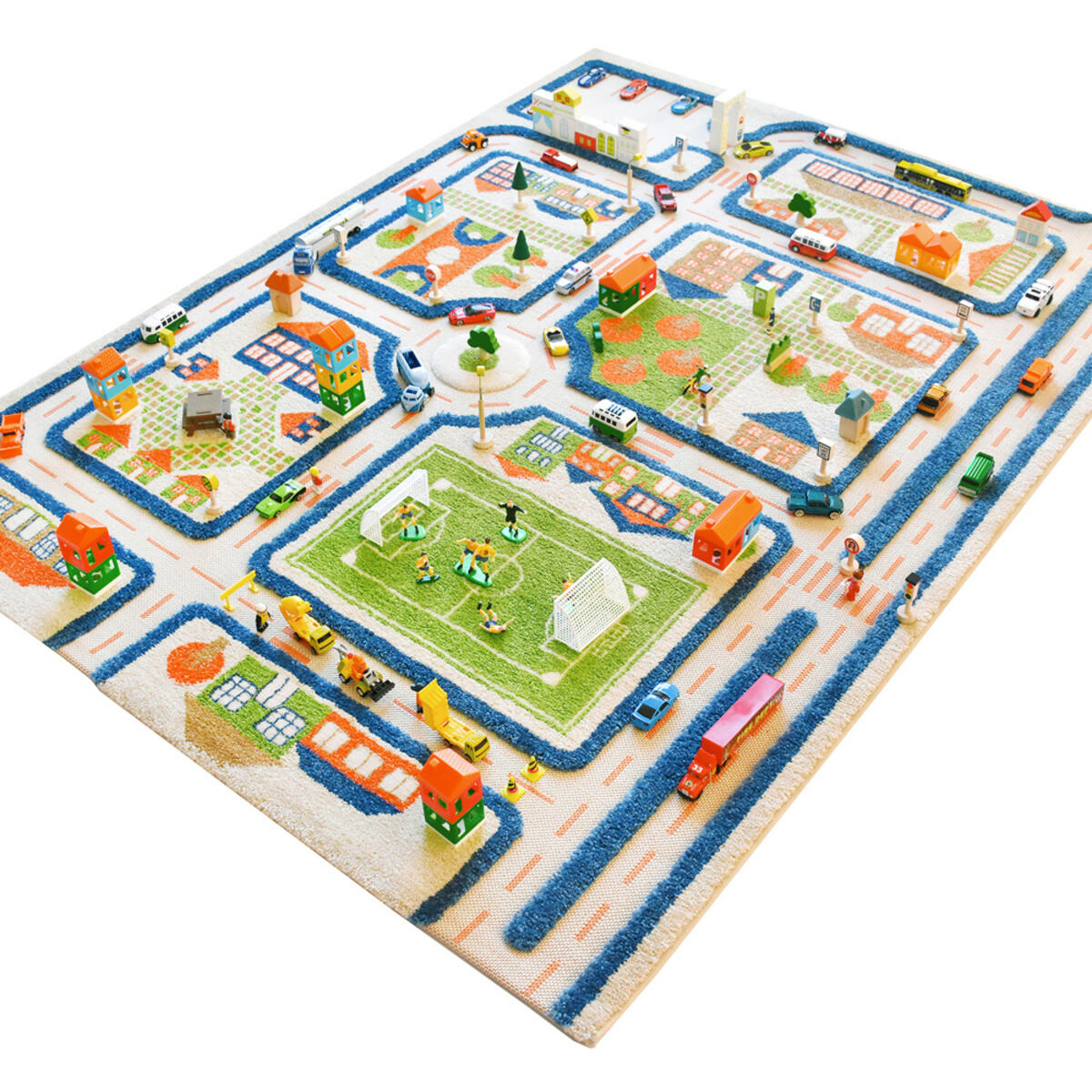 Trevlig lekmatta med motiv föreställande butiker, biltvätt etc. Halkskydd under. Av 100 % polyamid. PVC-fri. Rengöres via dammsugning, fläckar tas bort med milt rengöringsmedel och en blöt trasa.