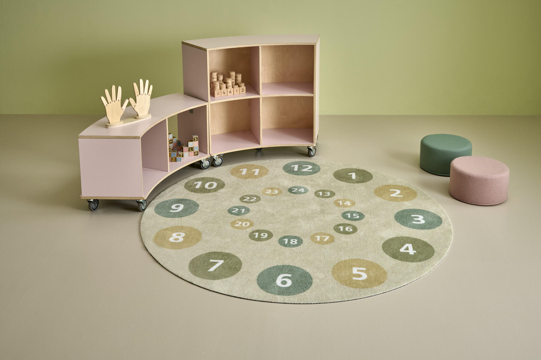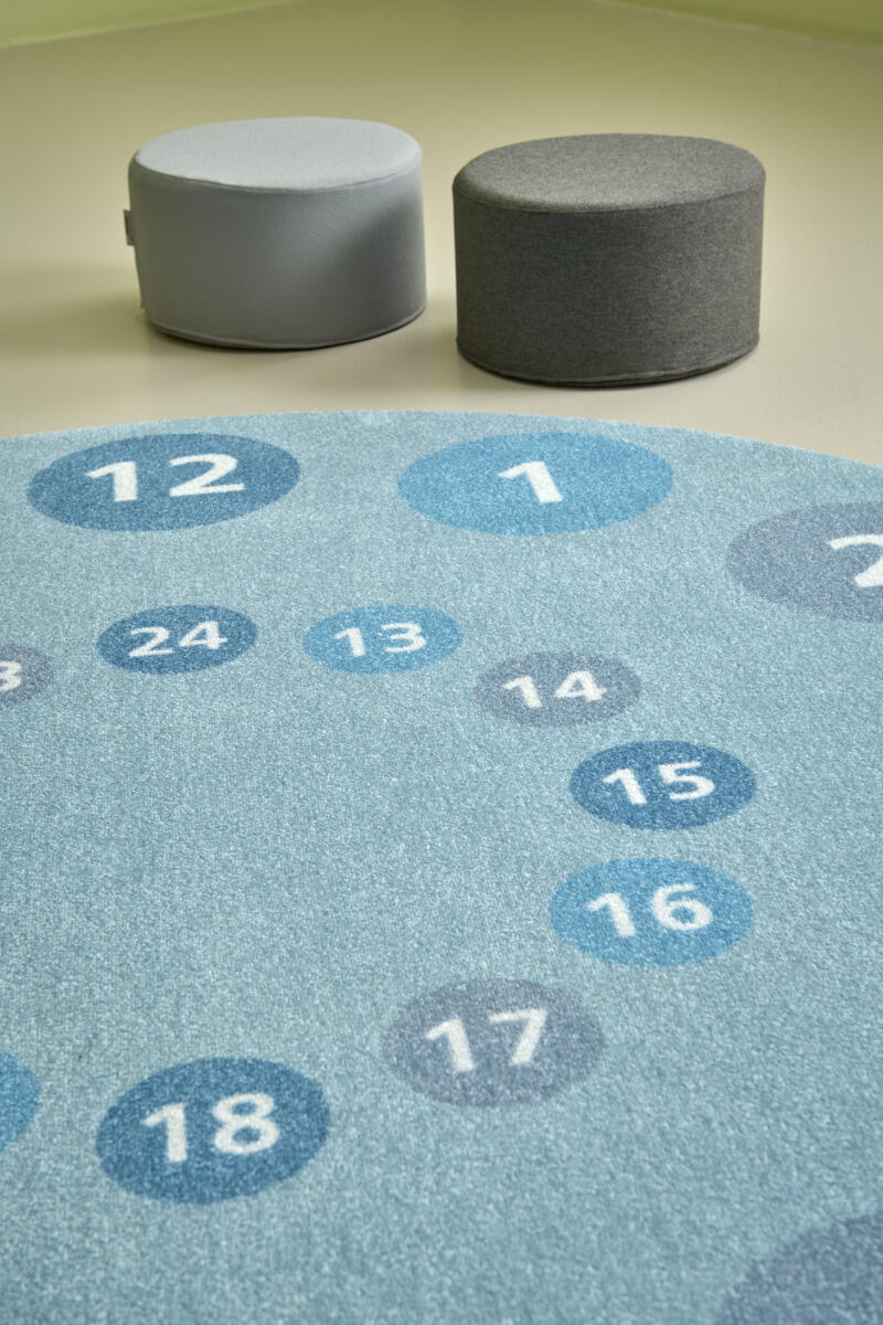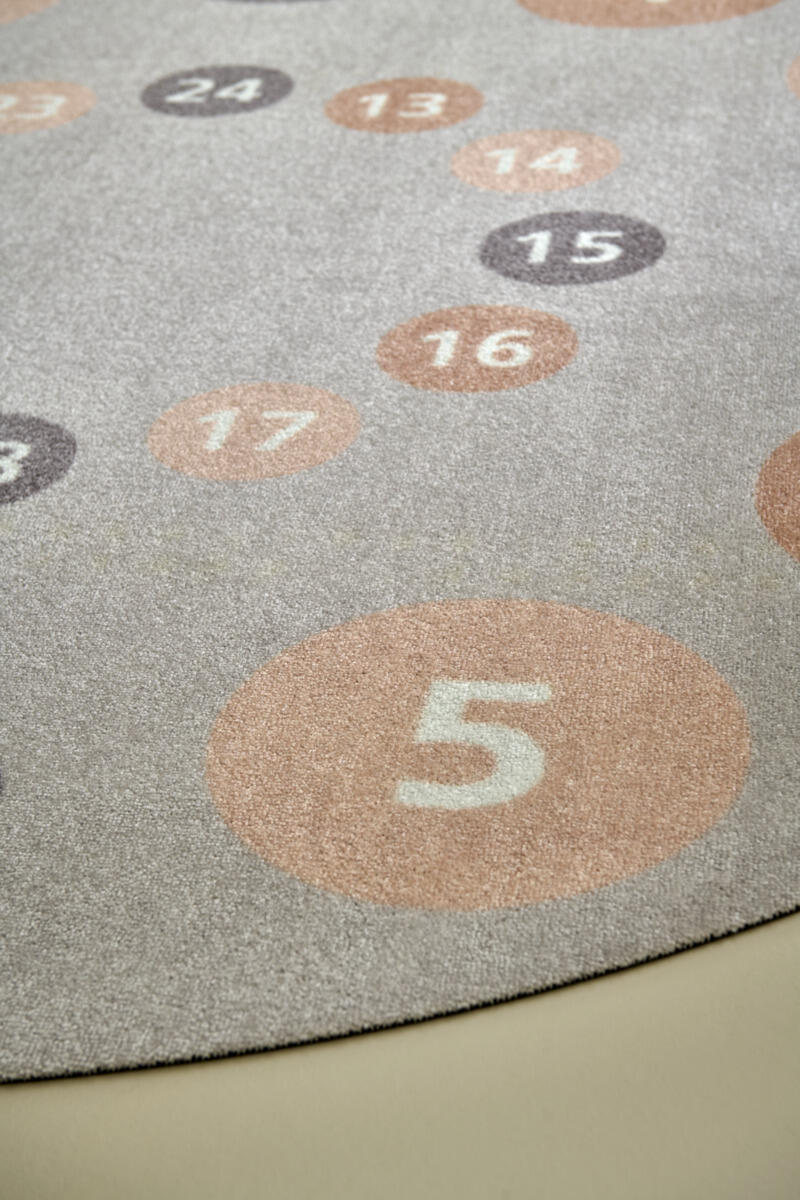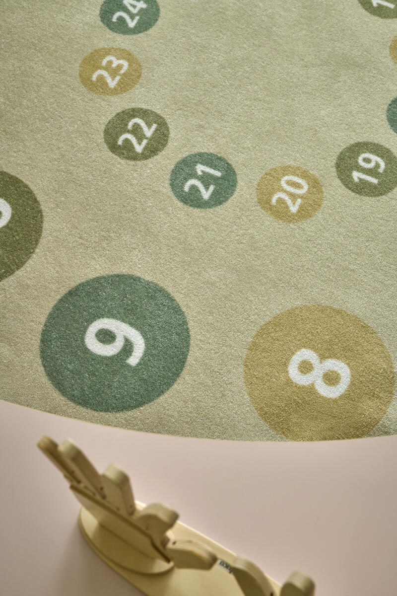 Lekmatta med tryckt klocka. Baksida med halkfri gummibeläggning. Mattan fungerar på värmegolv. Mått: ø 200 cm. Lugghöjd 3 mm. 100 % öglad polyamid. Får inte läggas på fuktiga golv.