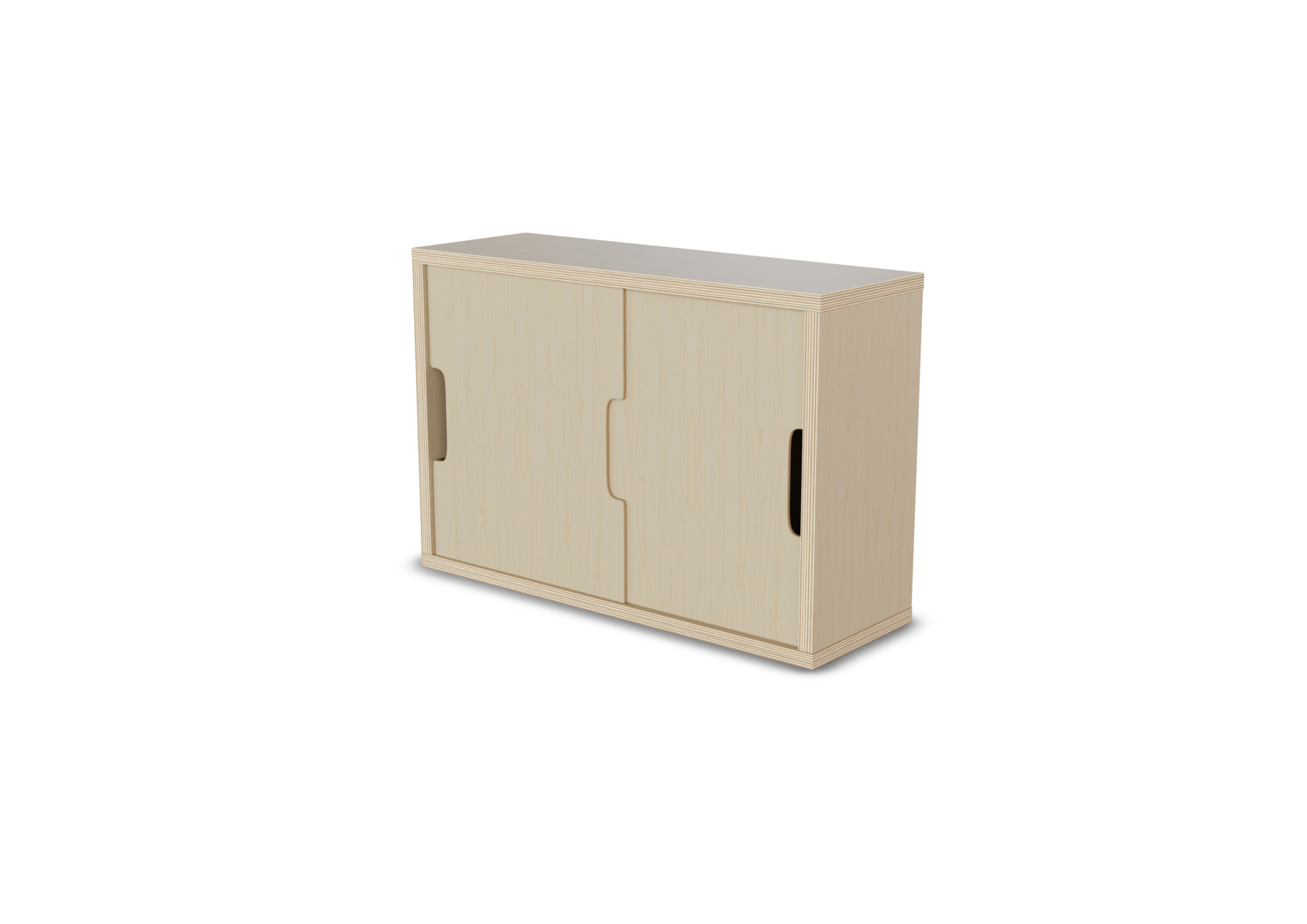 Komplett modul med val av ben, hjul eller sockel. Vid val av ben och sockel ingår vinkelbeslag att fästa i vägg. Hjul med 2 fasta och 2 rörliga med lås. Stomme gjord i 18 mm plywood. Skjutdörrar med handhål i 4 mm björkfaner.