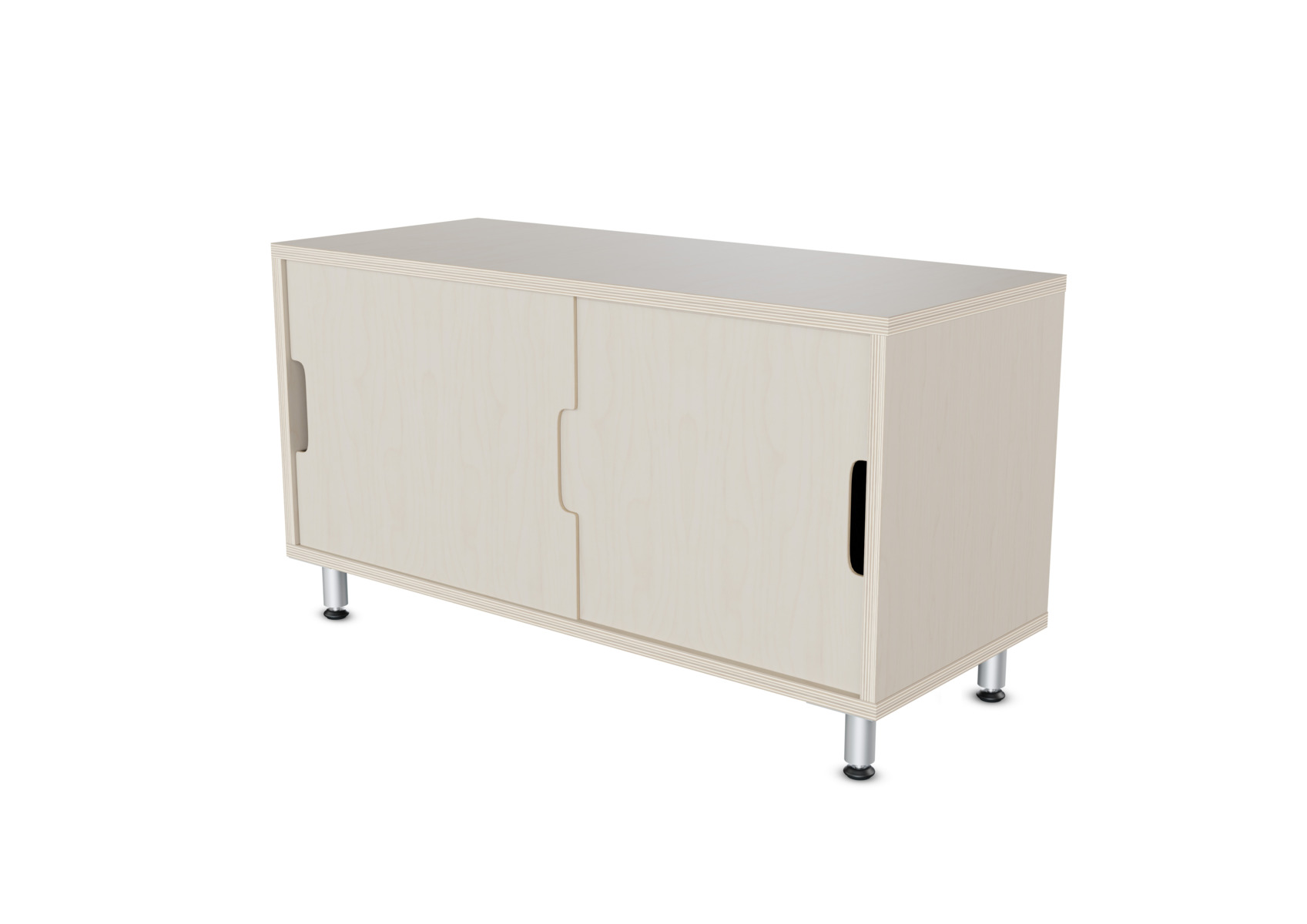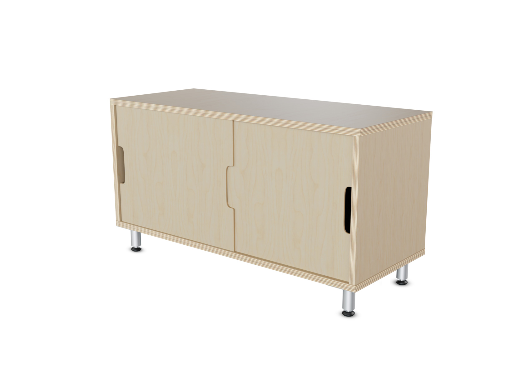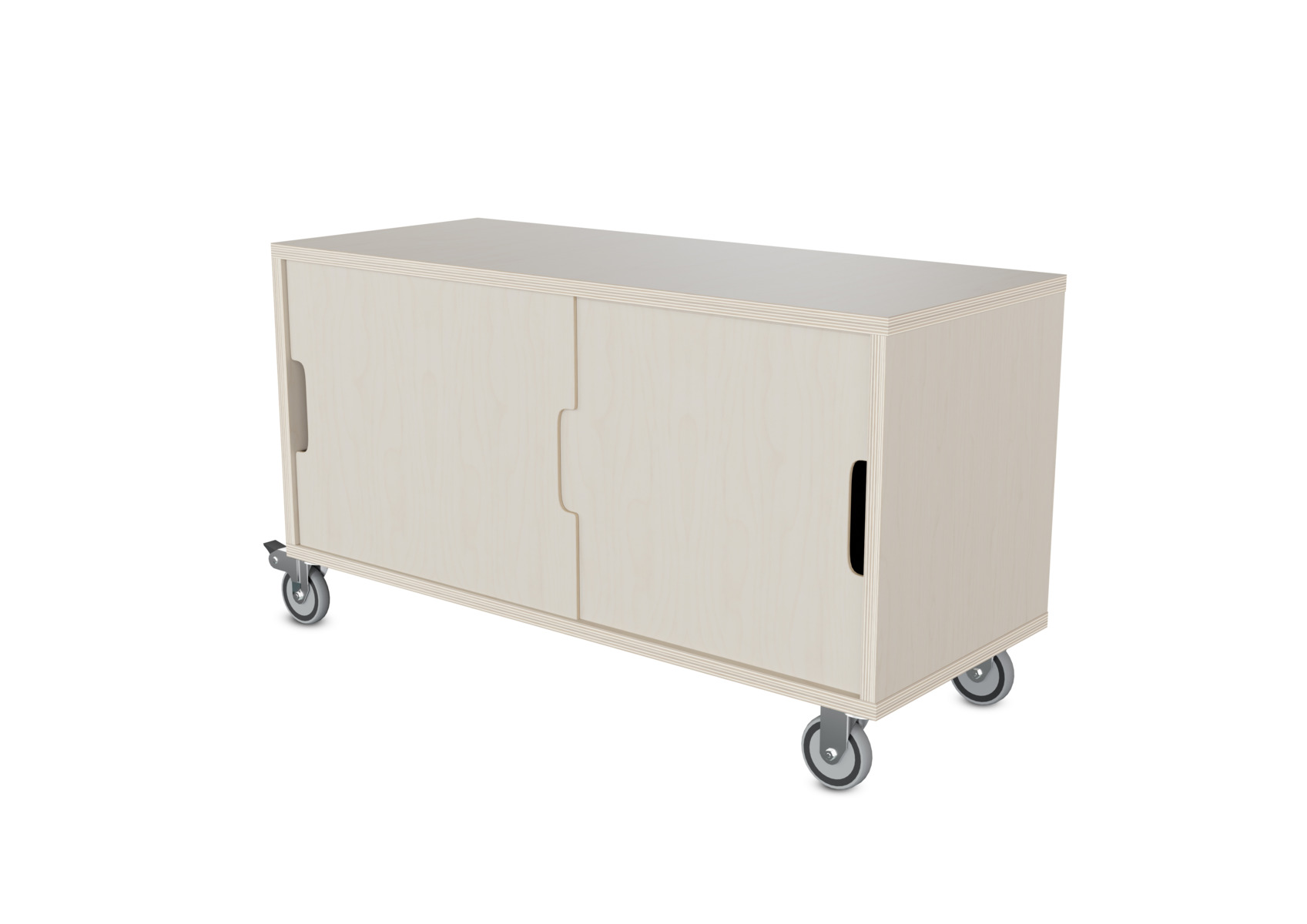 Komplett modul med val av ben, hjul eller sockel. Vid val av ben och sockel ingår vinkelbeslag att fästa i vägg. Hjul med 2 fasta och 2 rörliga med lås. Stomme gjord i 18 mm plywood. Skjutdörrar med handhål i 4 mm björkfaner.