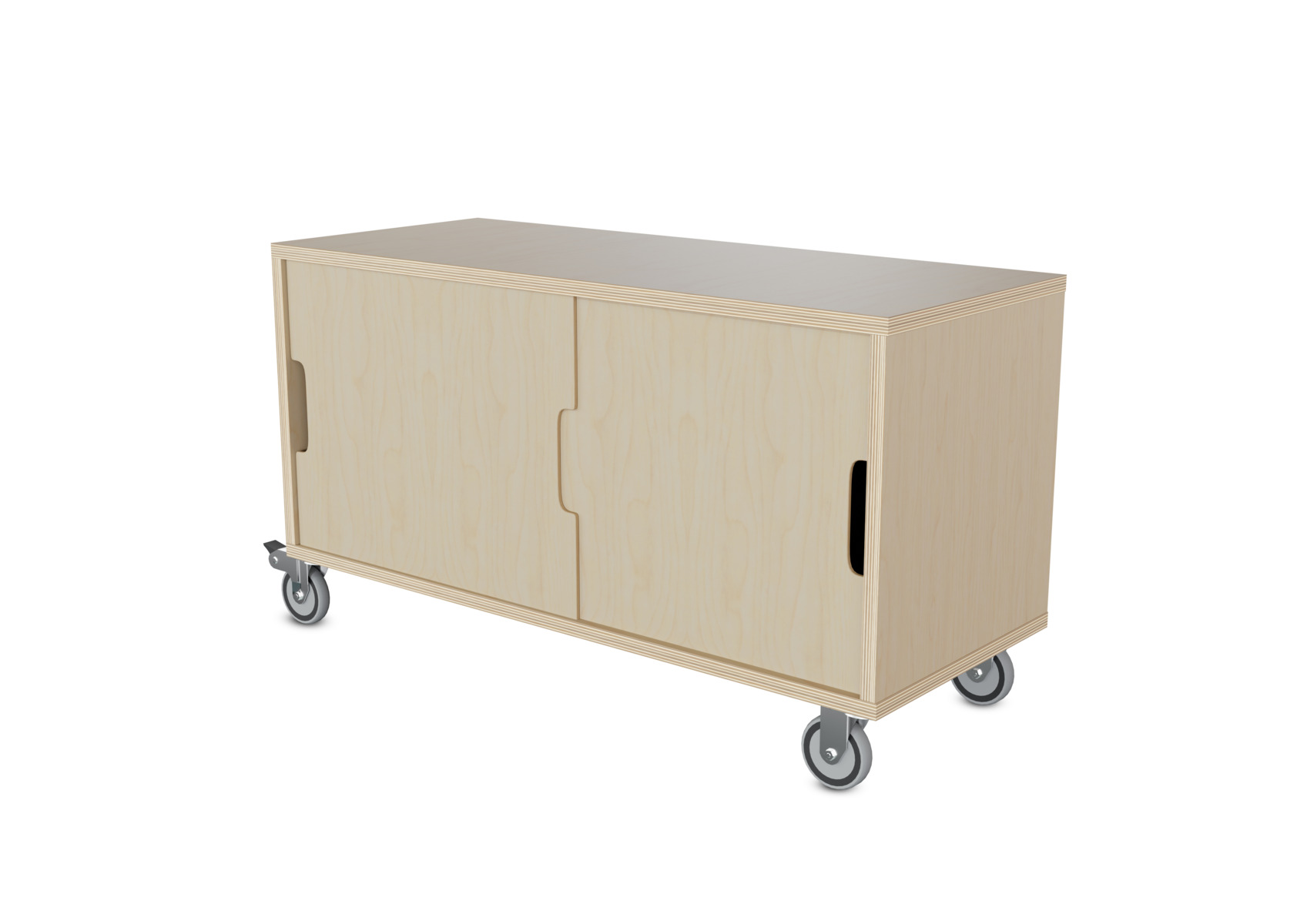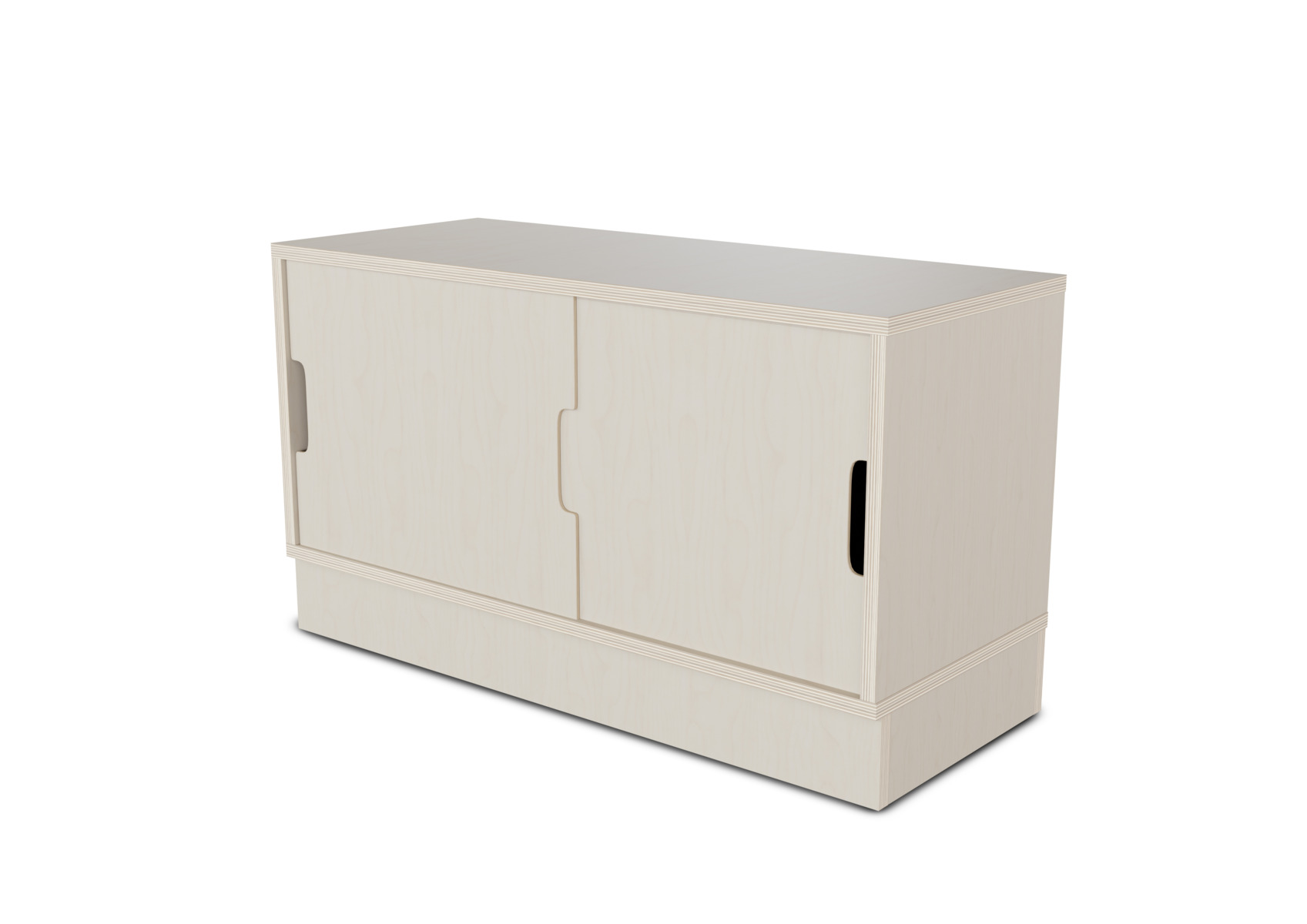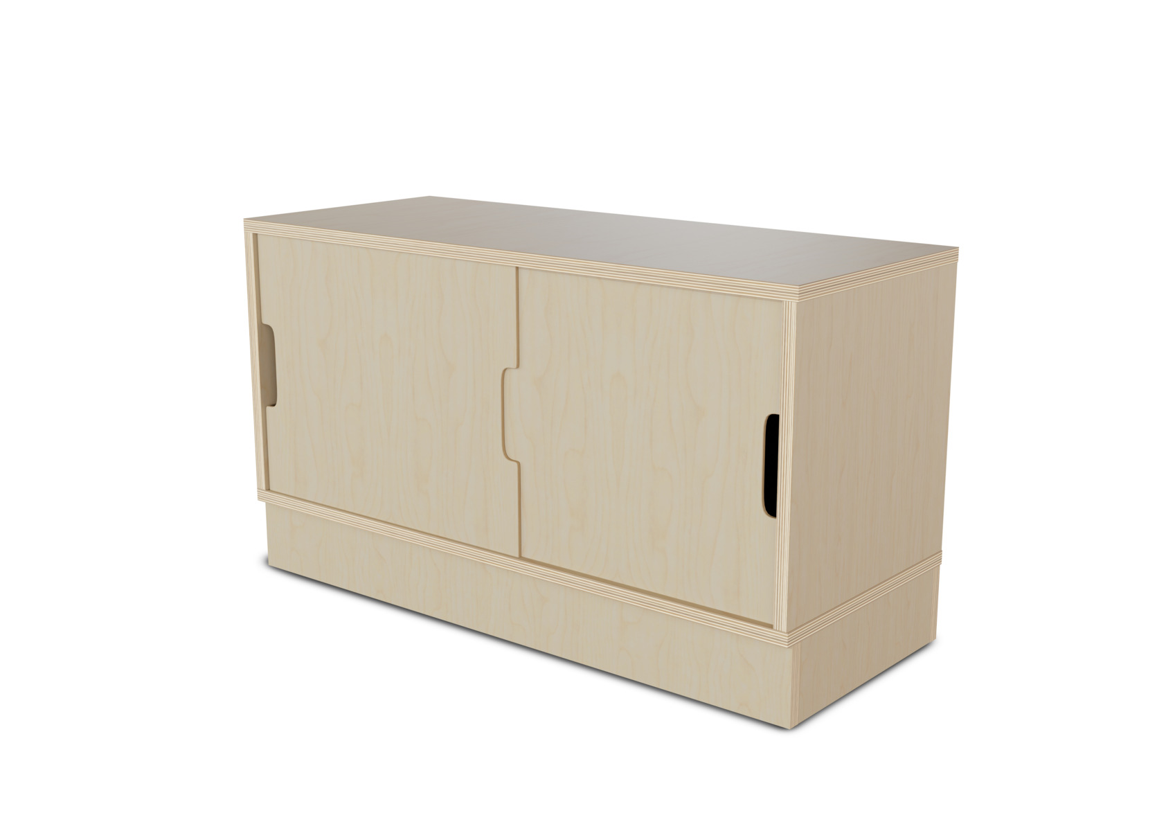 Komplett modul med val av ben, hjul eller sockel. Vid val av ben och sockel ingår vinkelbeslag att fästa i vägg. Hjul med 2 fasta och 2 rörliga med lås. Stomme gjord i 18 mm plywood. Skjutdörrar med handhål i 4 mm björkfaner.