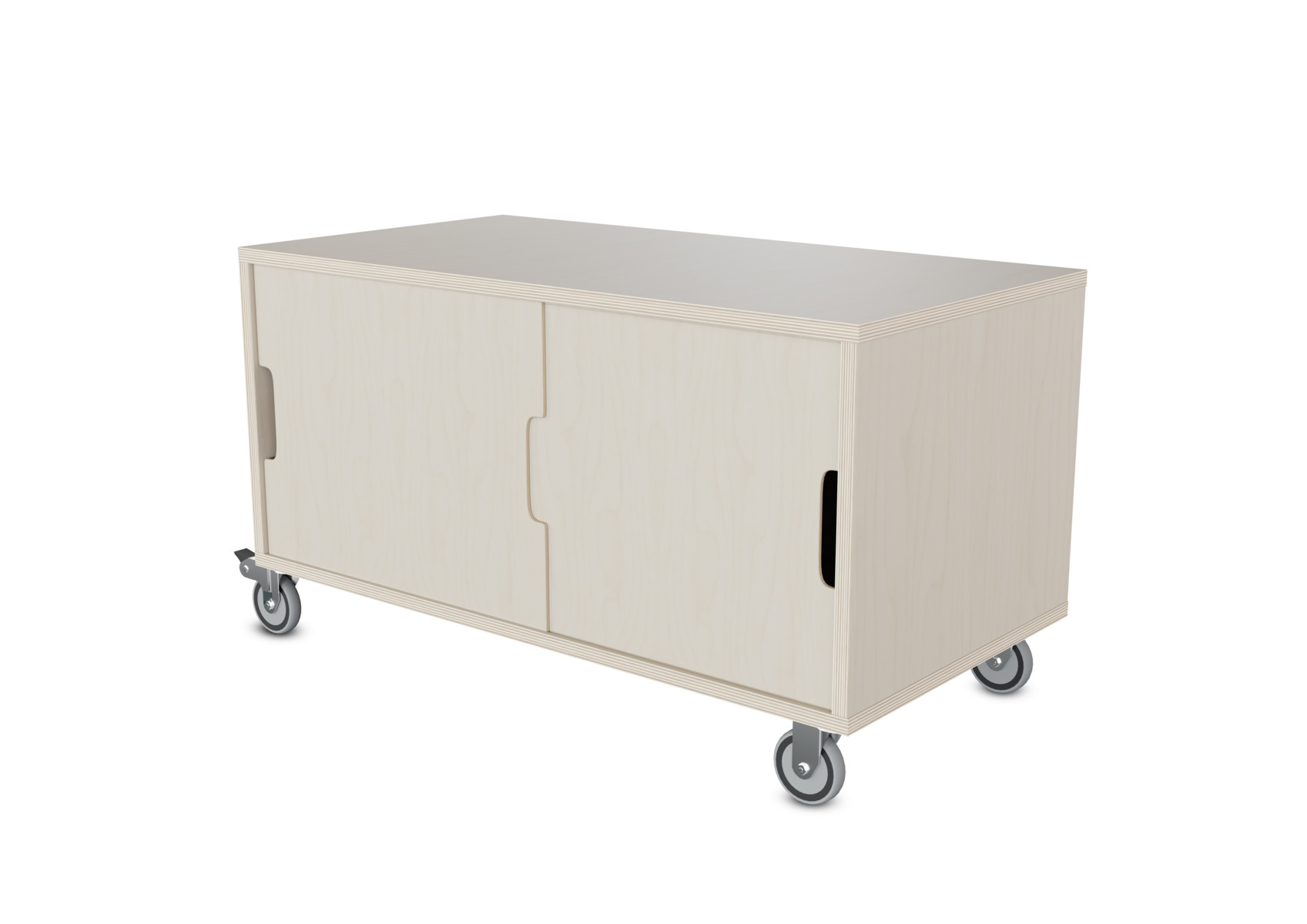 Färdig modul med skjutdörrar i plexi på två sidor av skåp. Whiteboard på båda sidor, vit laminat invädigt på alla färger. Låsbara hjul ingår och kräver montering. Gjord i 16 mm björkplywood. Färger med HT är med högtryckslaminat. Björk och vitpigmenterad är helt i 18 mm plywood. Mått: B59xD58xH79 cm.
