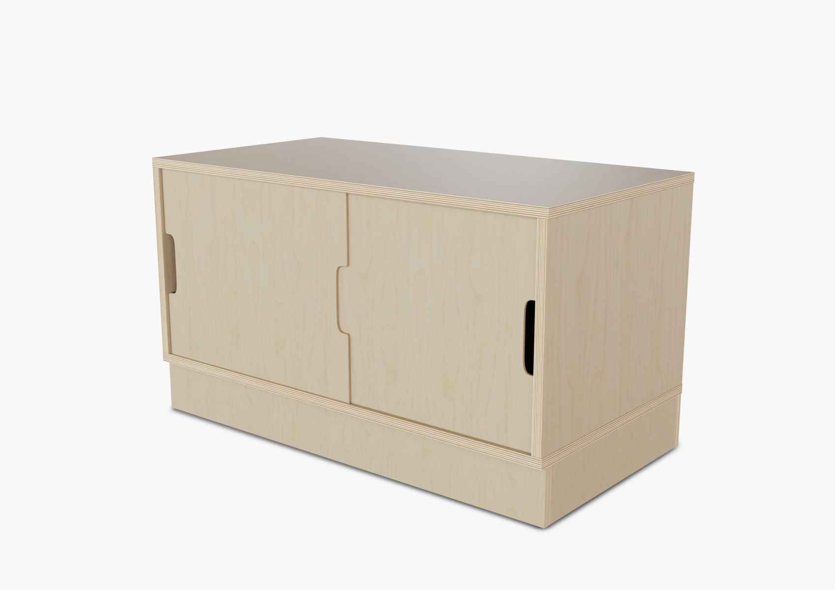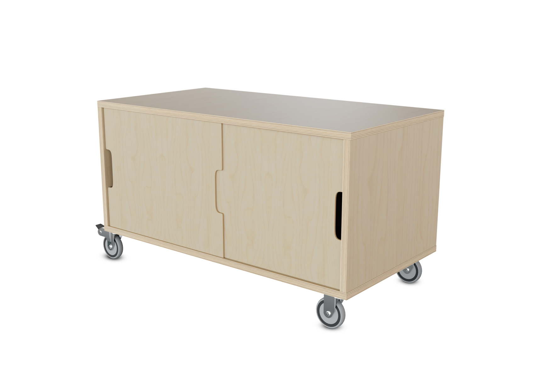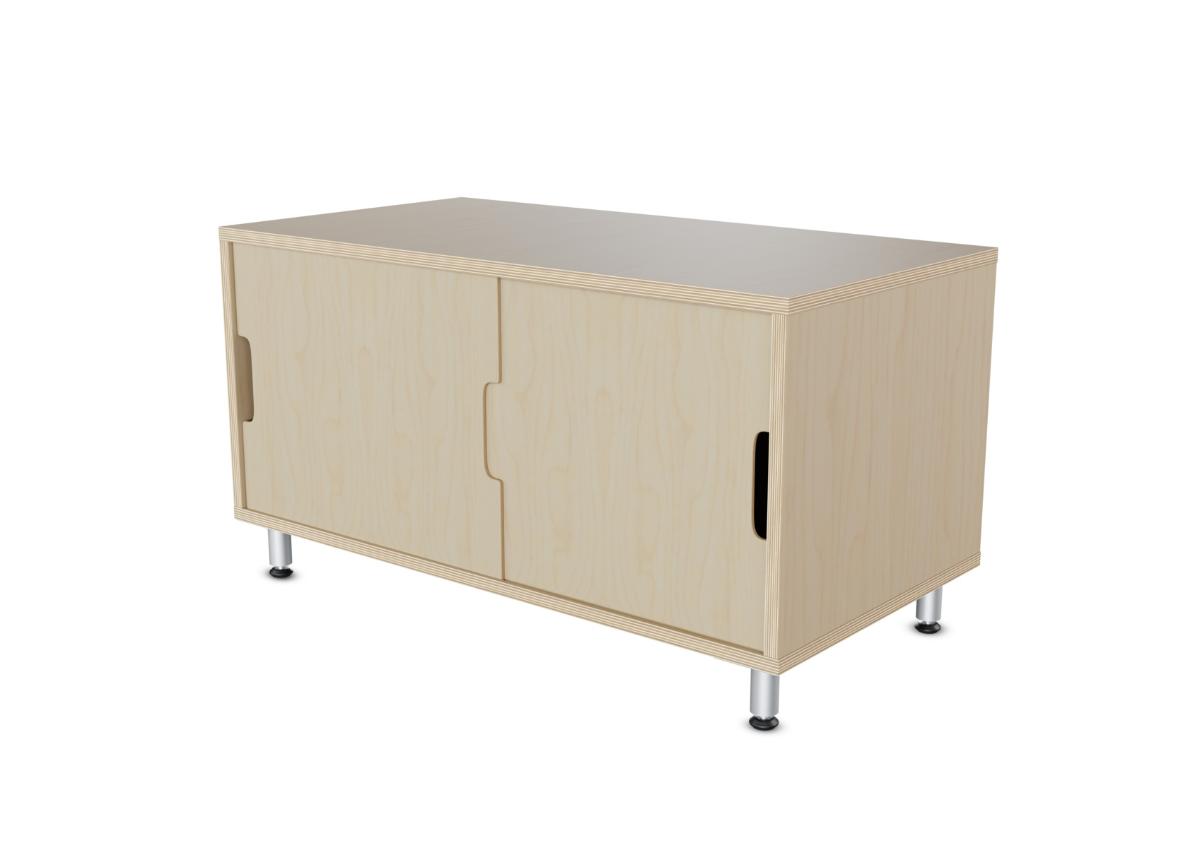 Komplett modul med val av ben, hjul eller sockel. Vid val av ben och sockel ingår vinkelbeslag att fästa i vägg. Hjul med 2 fasta och 2 rörliga med lås. Stomme gjord i 18 mm plywood. Skjutdörrar med handhål i 4 mm björkfaner.