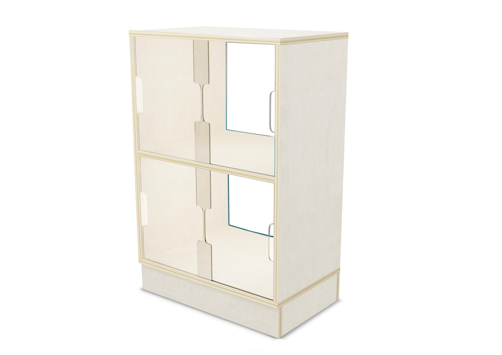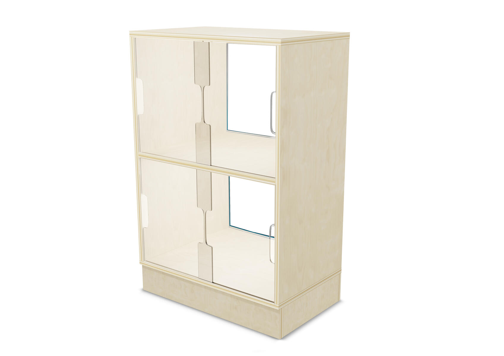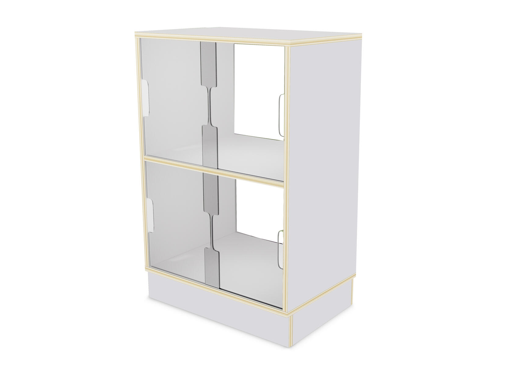 Färdig modul med skjutdörrar i plexi på två sidor av skåp. Whiteboard på båda sidor, vit laminat invädigt på alla färger. Låsbara hjul ingår och kräver montering. Gjord i 16 mm björkplywood. Färger med HT är med högtryckslaminat. Björk och vitpigmenterad är helt i 18 mm plywood. Mått: B59xD58xH79 cm.
