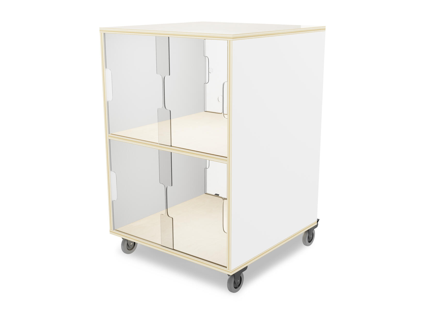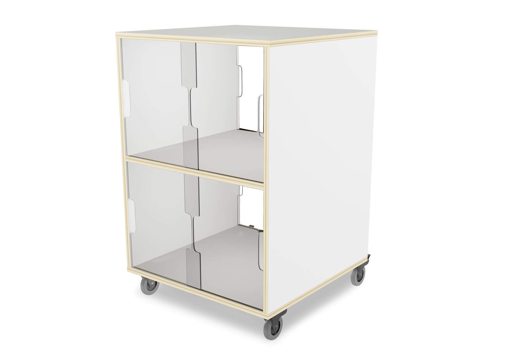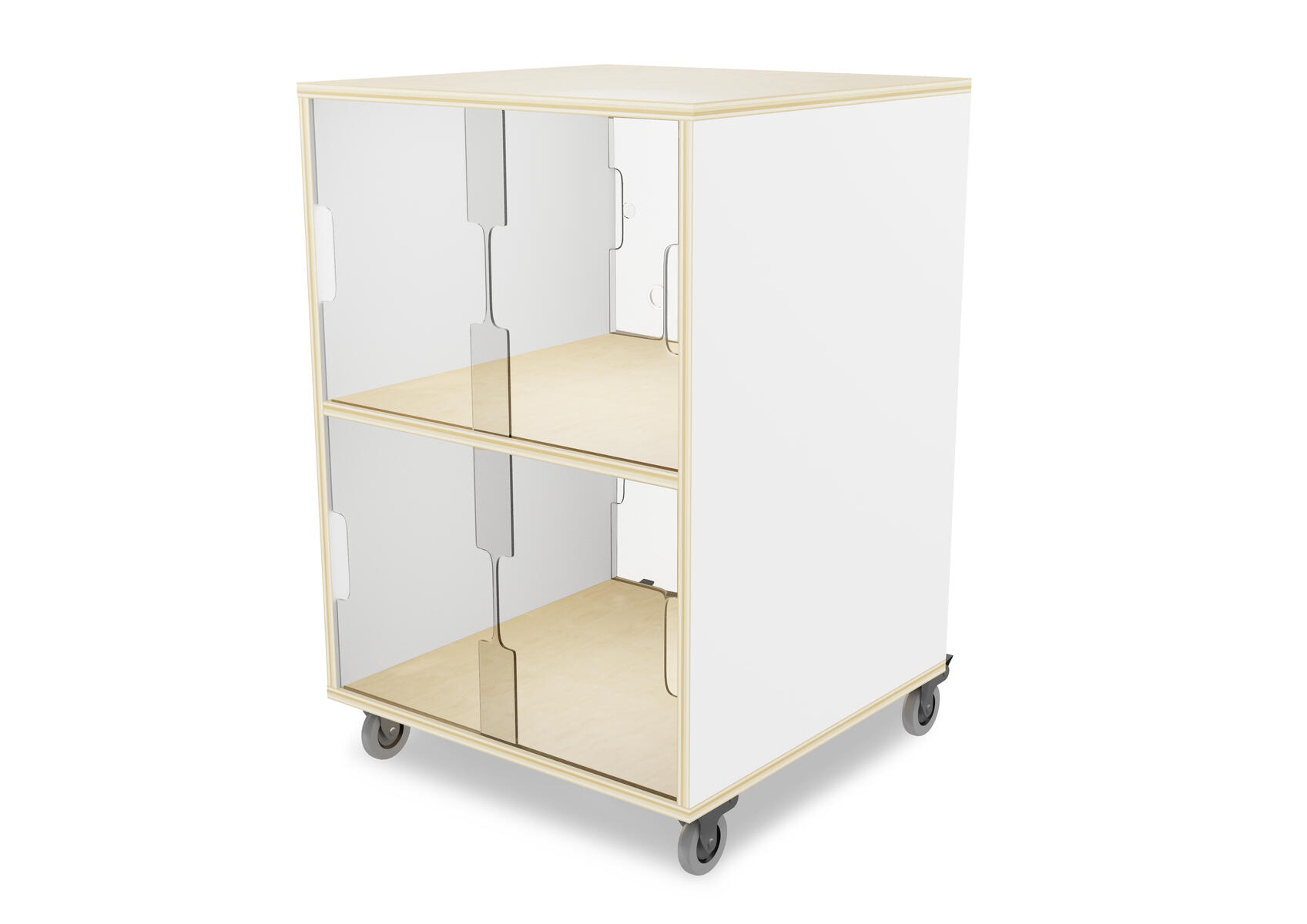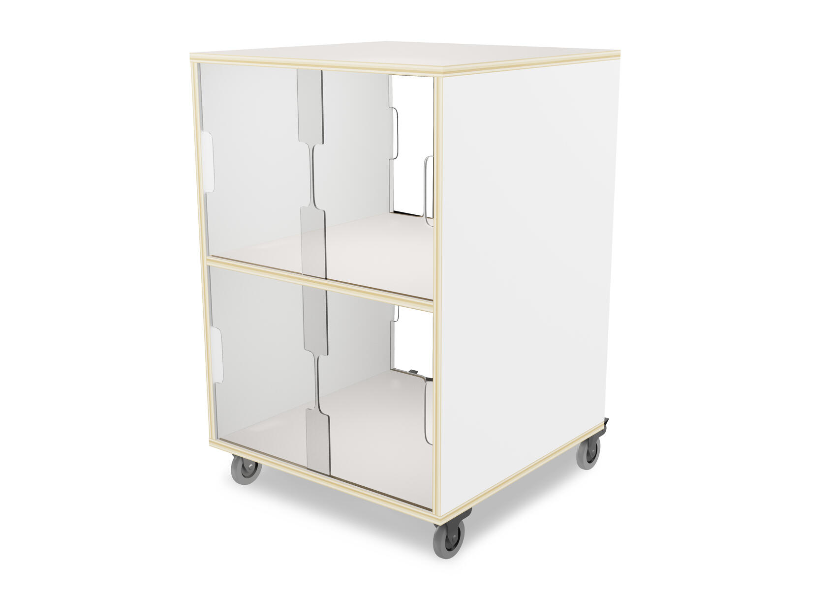 Färdig modul med skjutdörrar i plexi på två sidor av skåp. Whiteboard på båda sidor, vit laminat invädigt på alla färger. Låsbara hjul ingår och kräver montering. Gjord i 16 mm björkplywood. Färger med HT är med högtryckslaminat. Björk och vitpigmenterad är helt i 18 mm plywood. Mått: B59xD58xH79 cm.