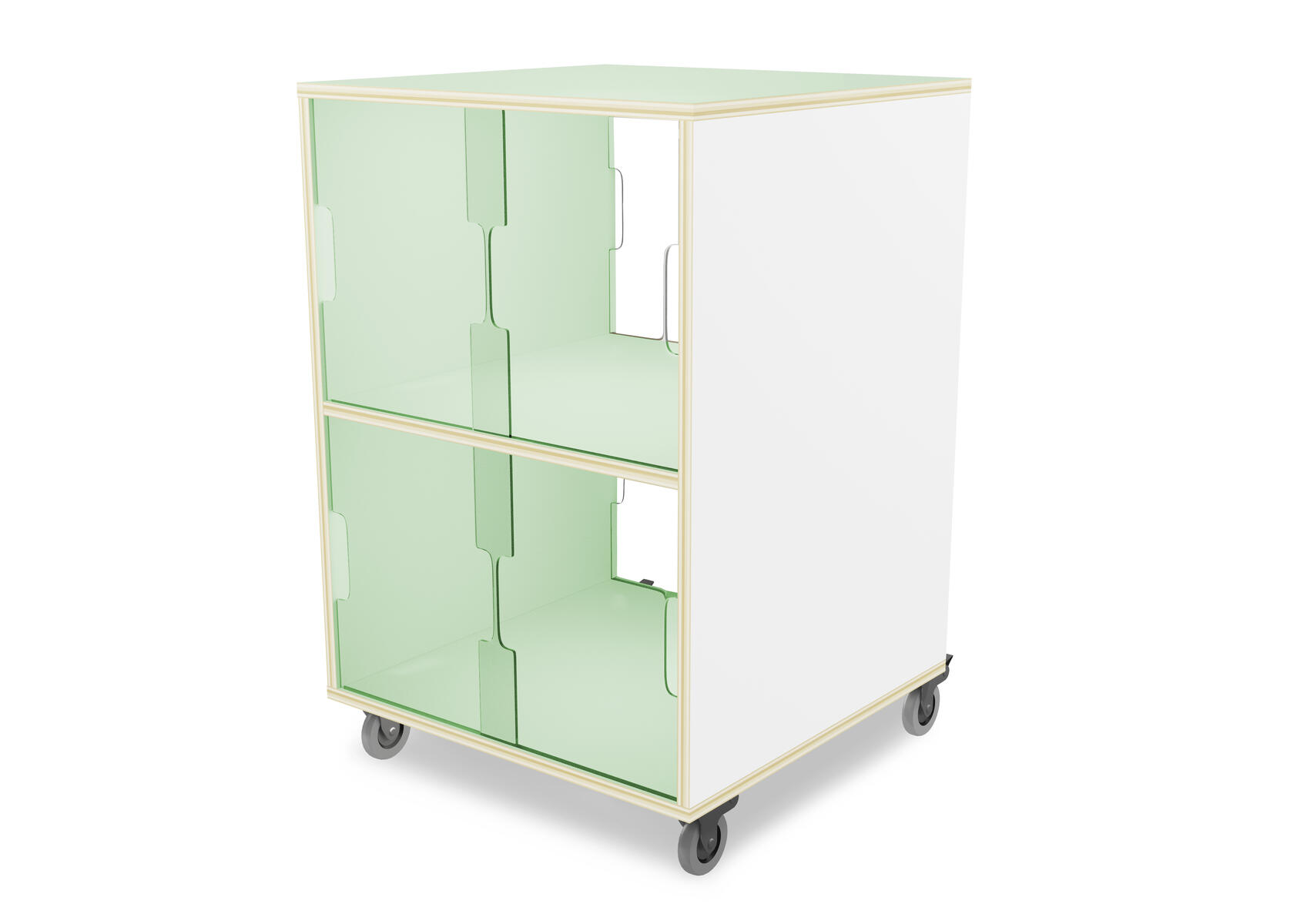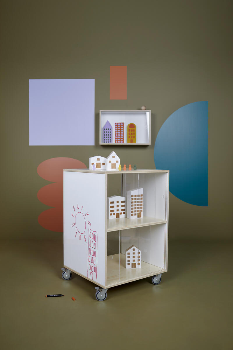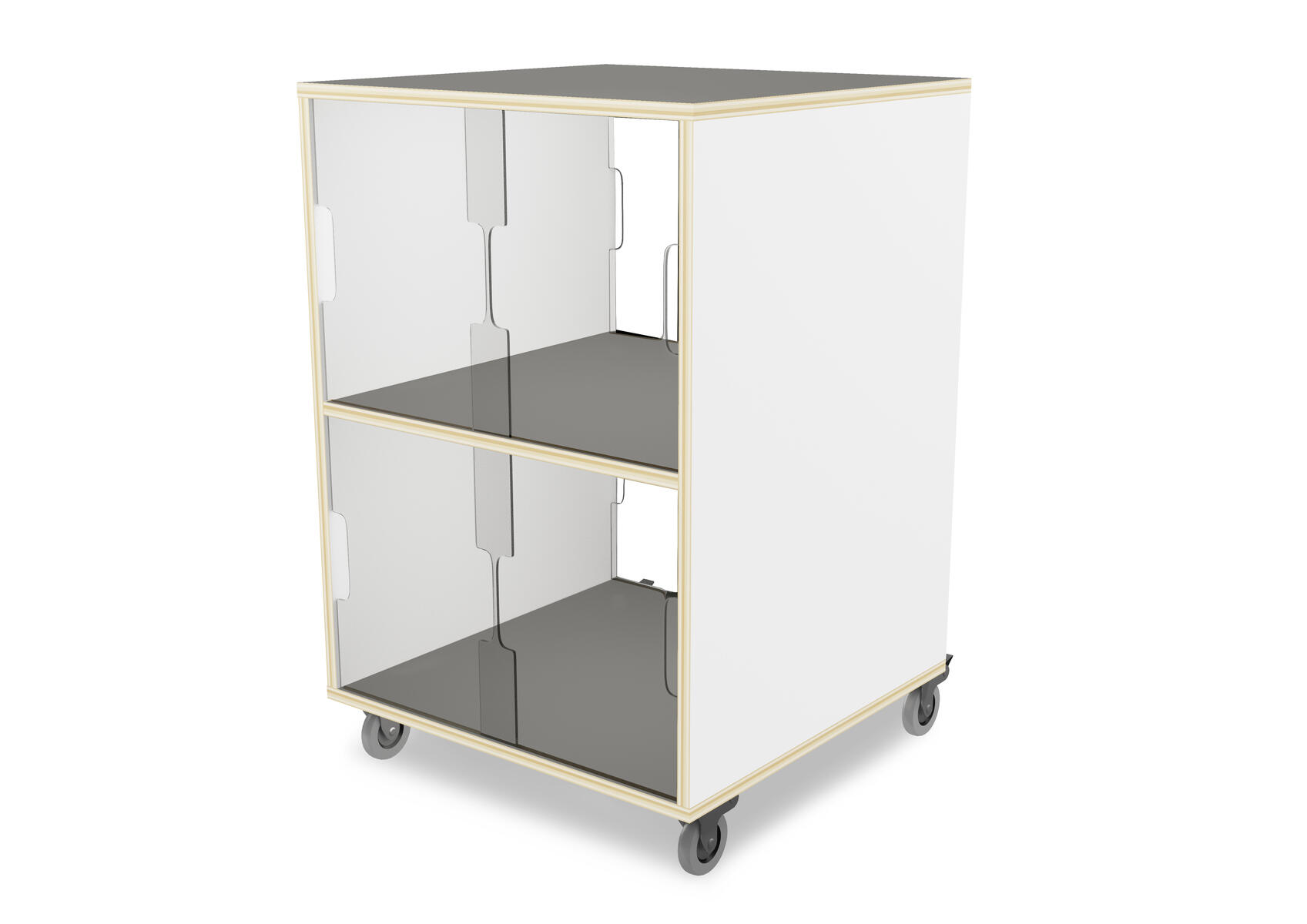 Färdig modul med skjutdörrar i plexi på två sidor av skåp. Whiteboard på båda sidor, vit laminat invädigt på alla färger. Låsbara hjul ingår och kräver montering. Gjord i 16 mm björkplywood. Färger med HT är med högtryckslaminat. Björk och vitpigmenterad är helt i 18 mm plywood. Mått: B59xD58xH79 cm.
